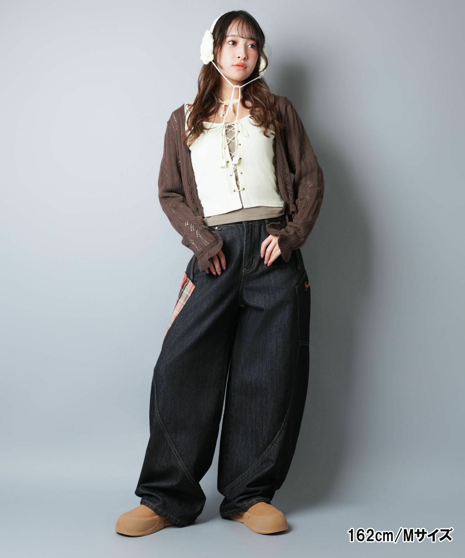 バルーンデニムワイドパンツ/チェック/バギー/カーブ