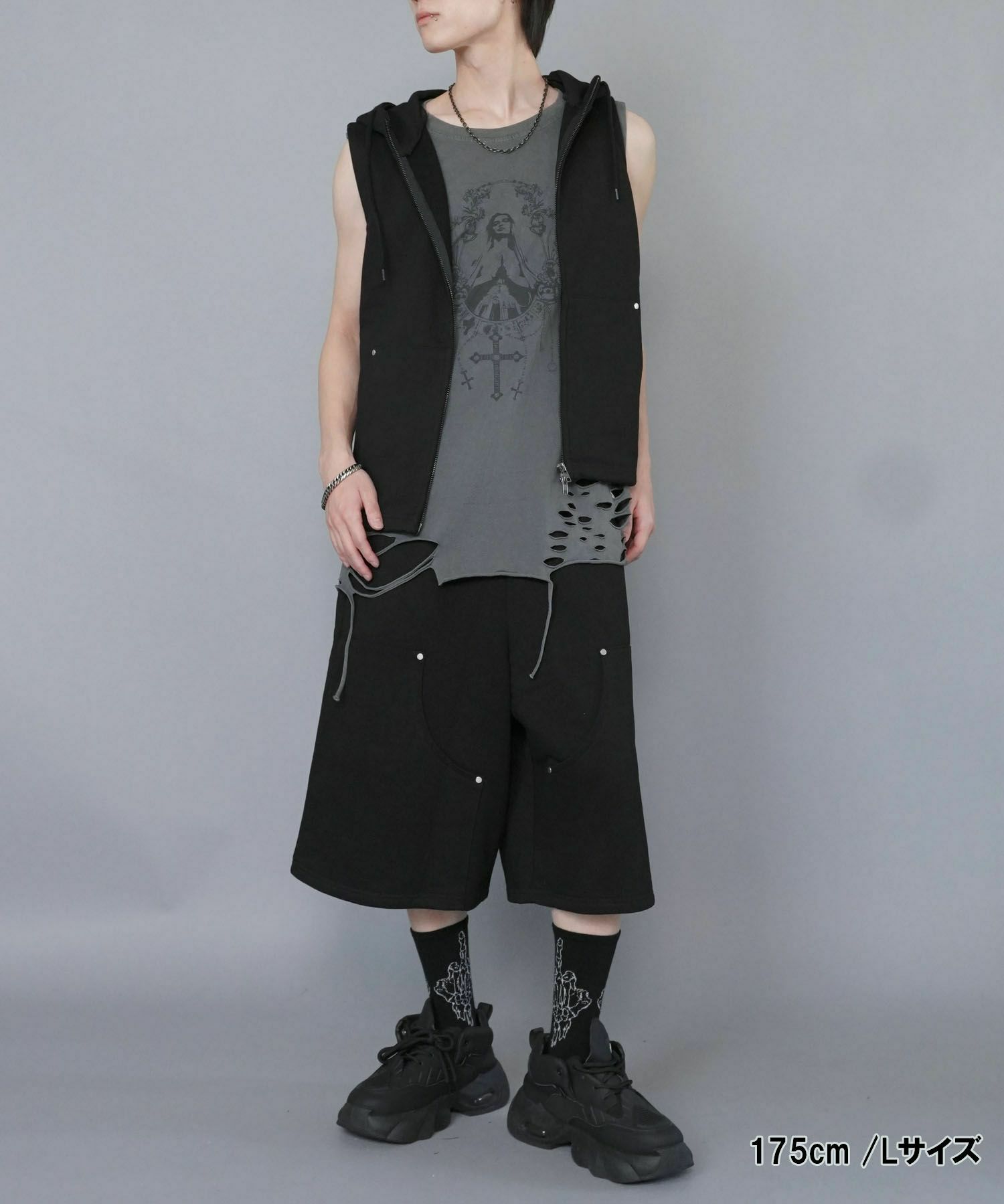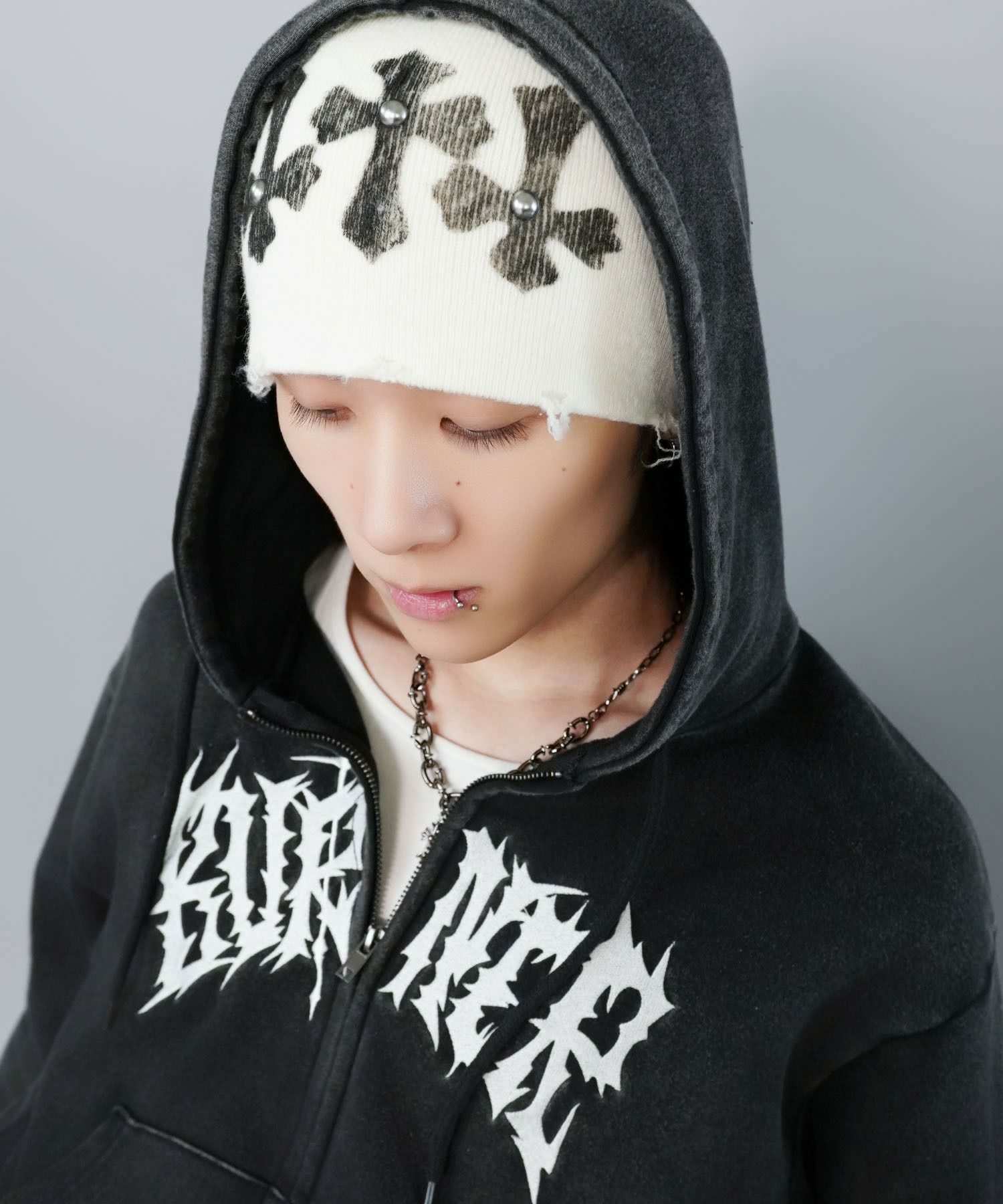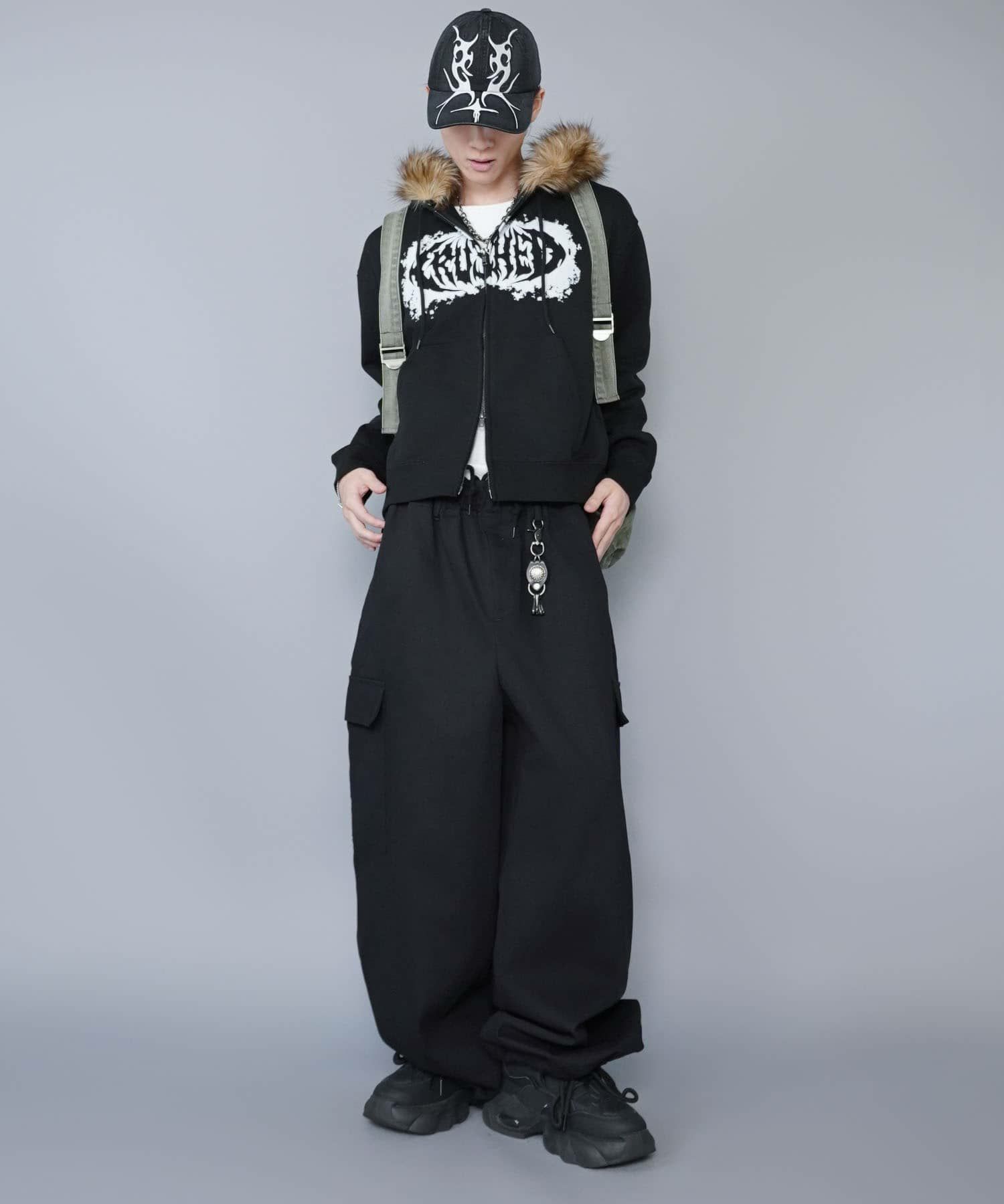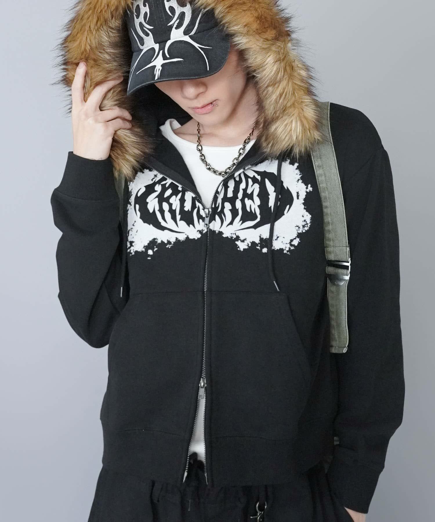 短丈ダブルジップパーカー/ストーンロゴ/バックプリント/スパイダーグラフィック/ショート丈