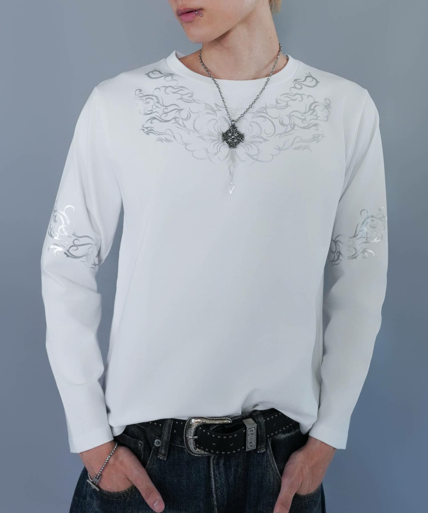 【26%OFF】短丈ロングスリーブTシャツ/トライバルデザイン/ロンT/ショート丈