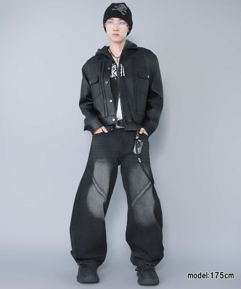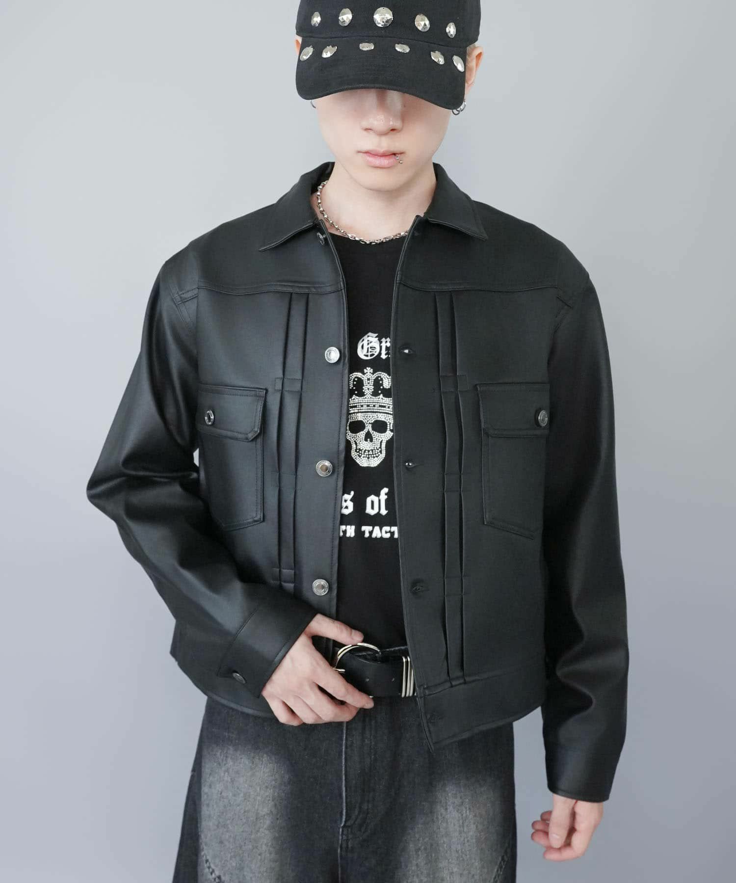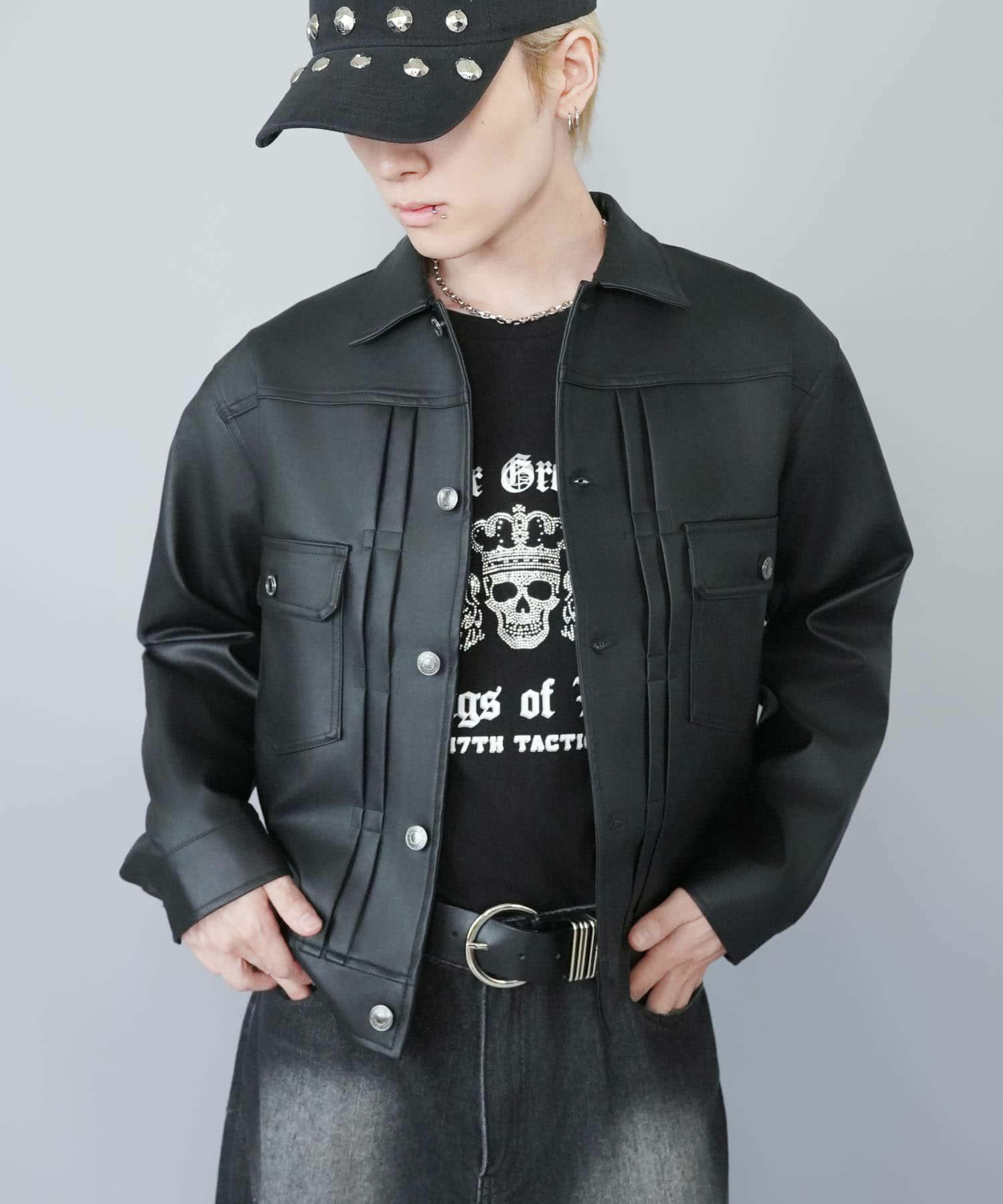 ショート丈のフェイクレザージャケット。