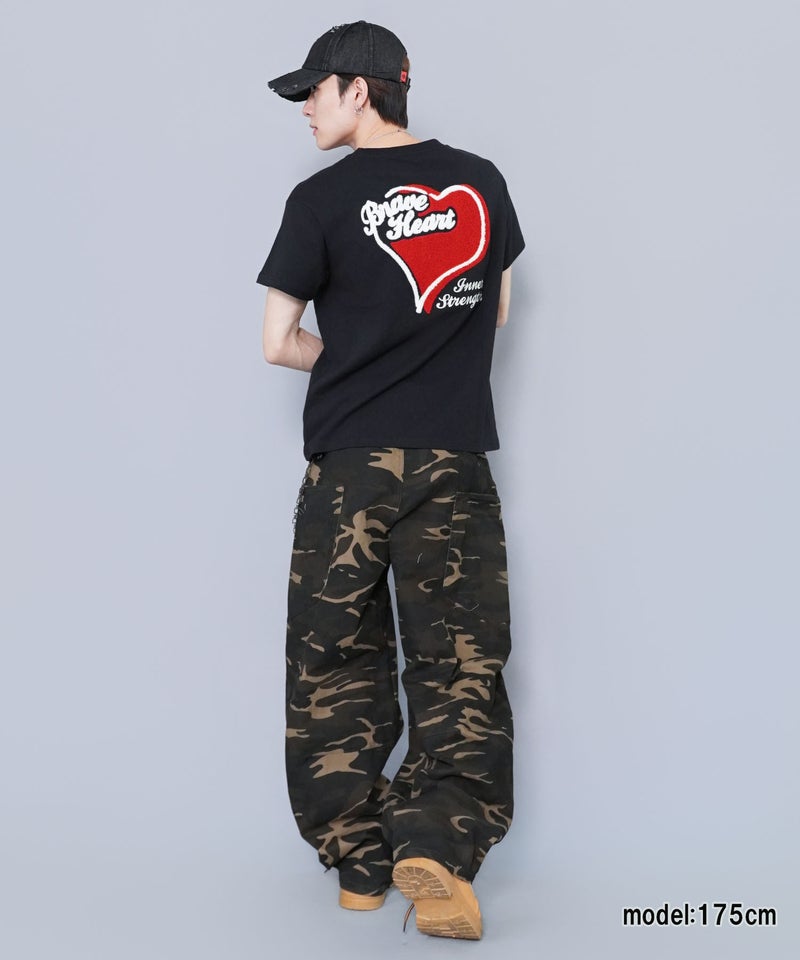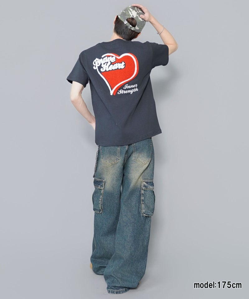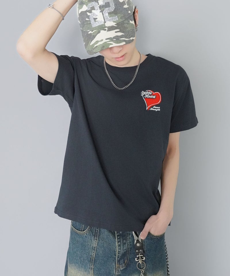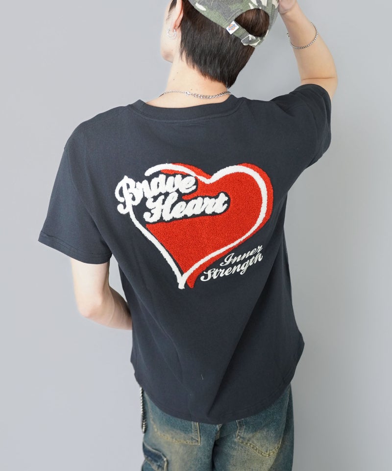 存在感のあるハートモチーフをバックに配置した半袖Tシャツ。