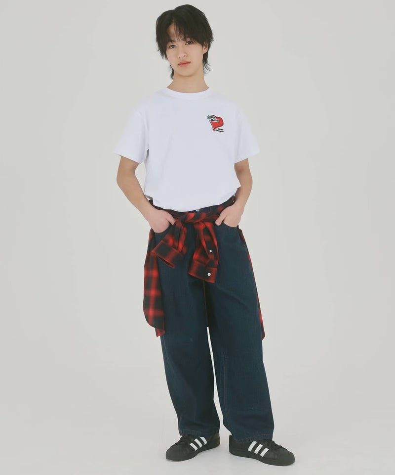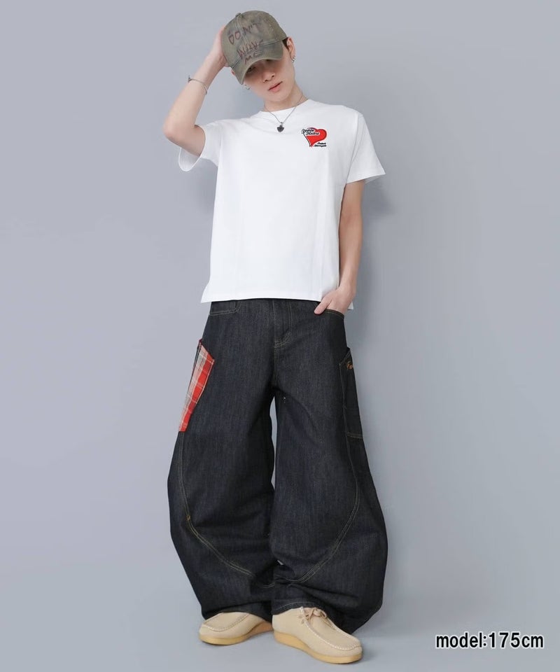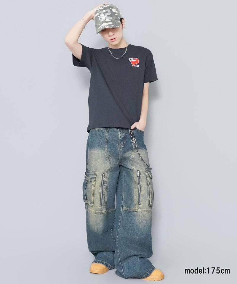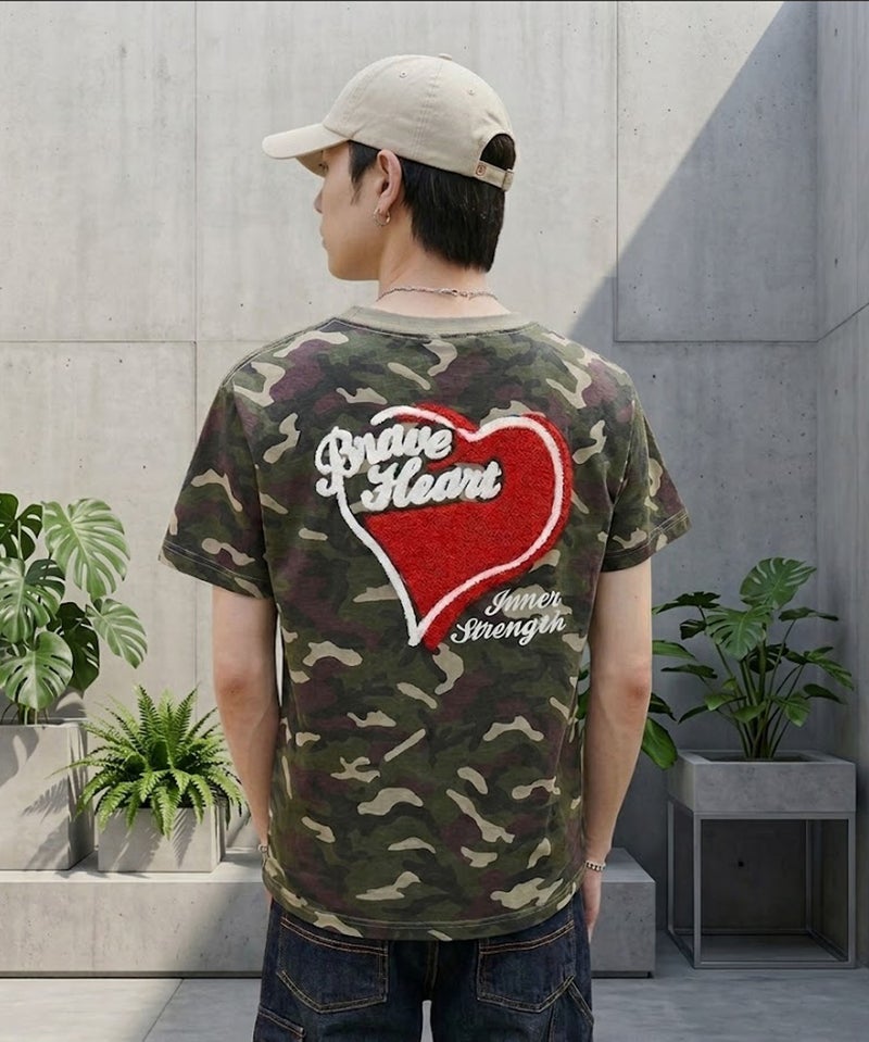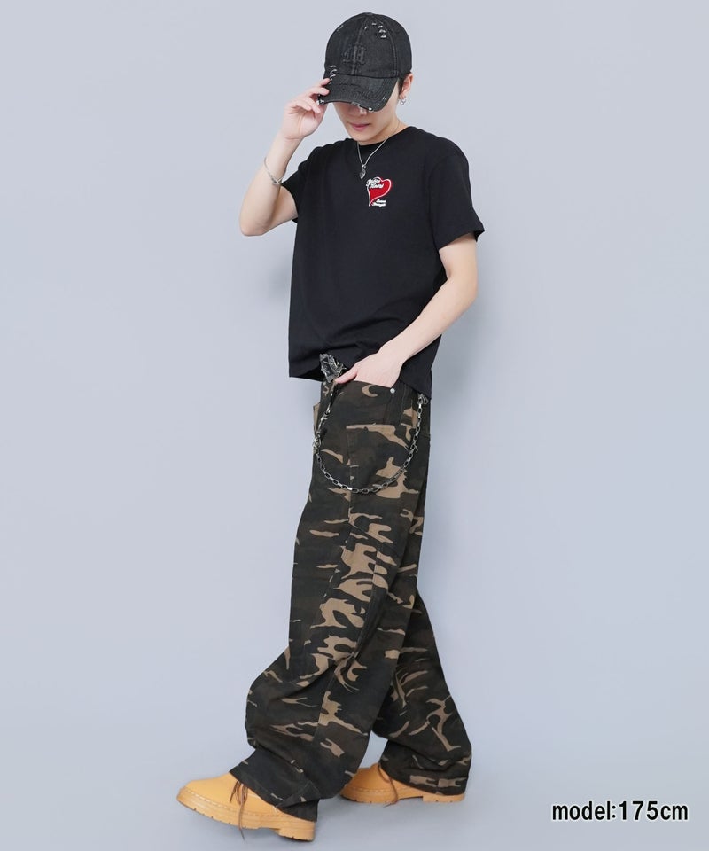 存在感のあるハートモチーフをバックに配置した半袖Tシャツ。