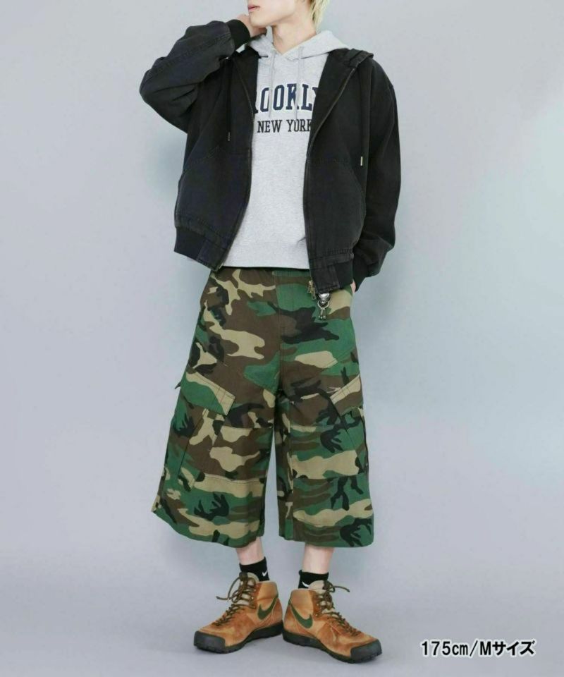 トレンドのミリタリーテイストを感じさせるカモフラ柄が特徴で、