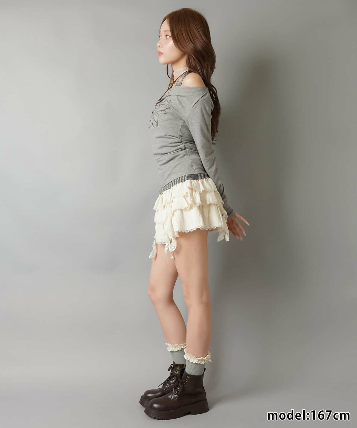 スカートにレギンスやタイツをレイヤードするのもポイント。