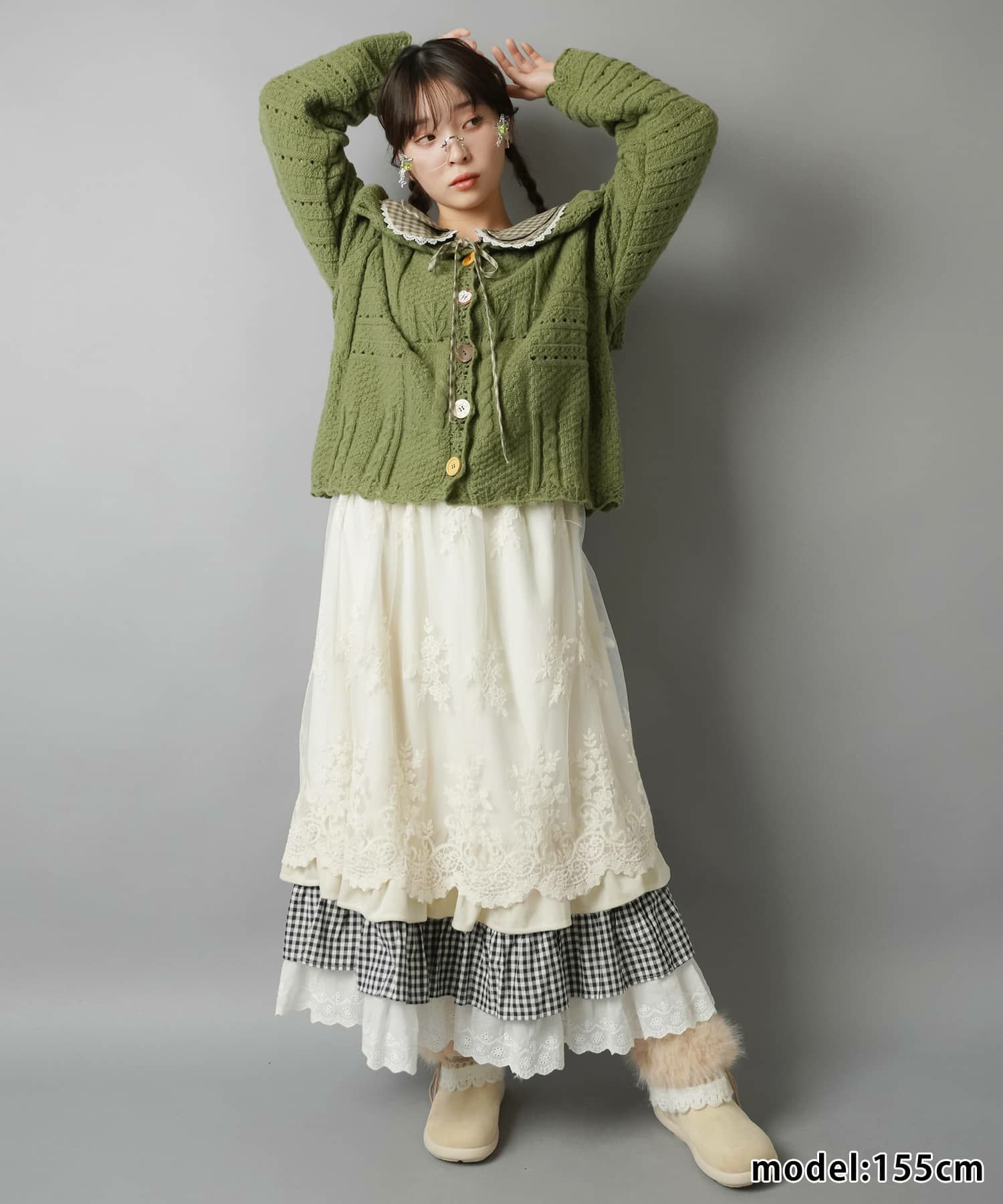 【レイヤード、アースカラー、ダスティカラー、カーディガン、ヘッドアクセ、ナチュラル、レース、ファー】