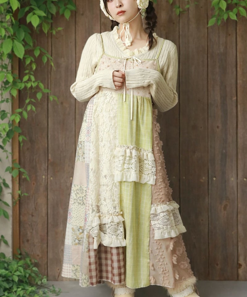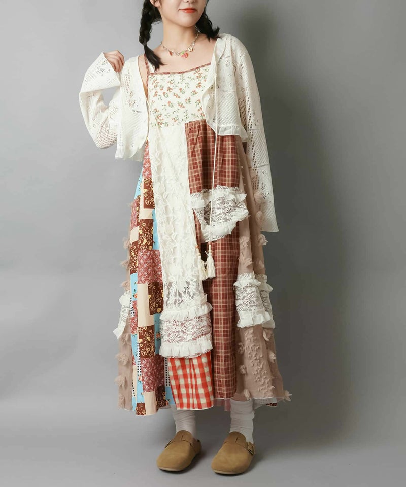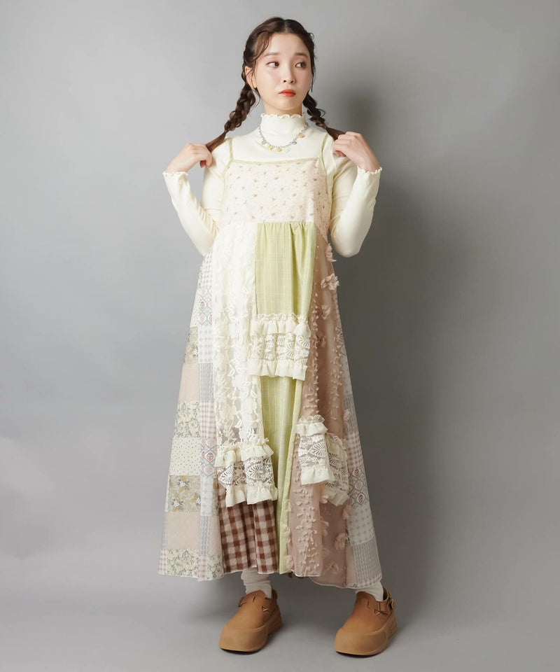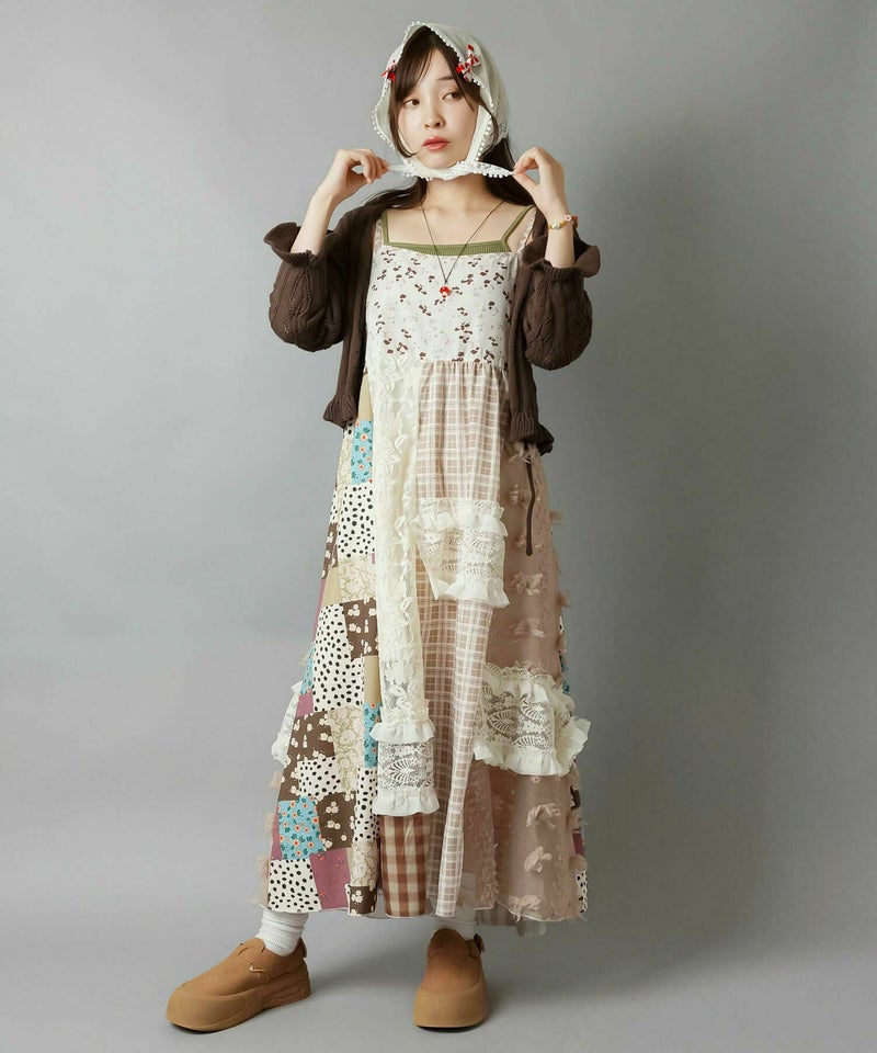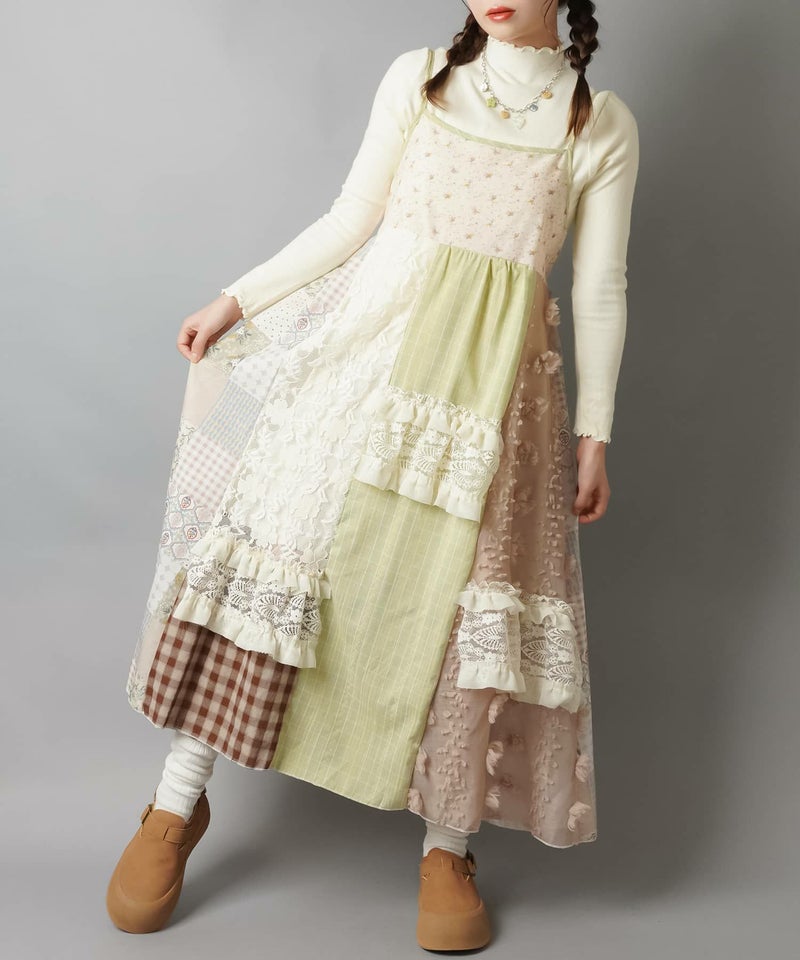 【レトロな雰囲気が可愛い!パッチワークロングキャミワンピ】