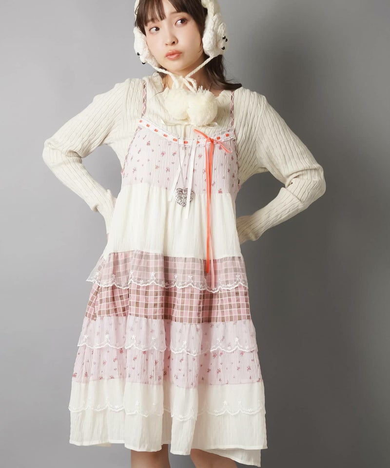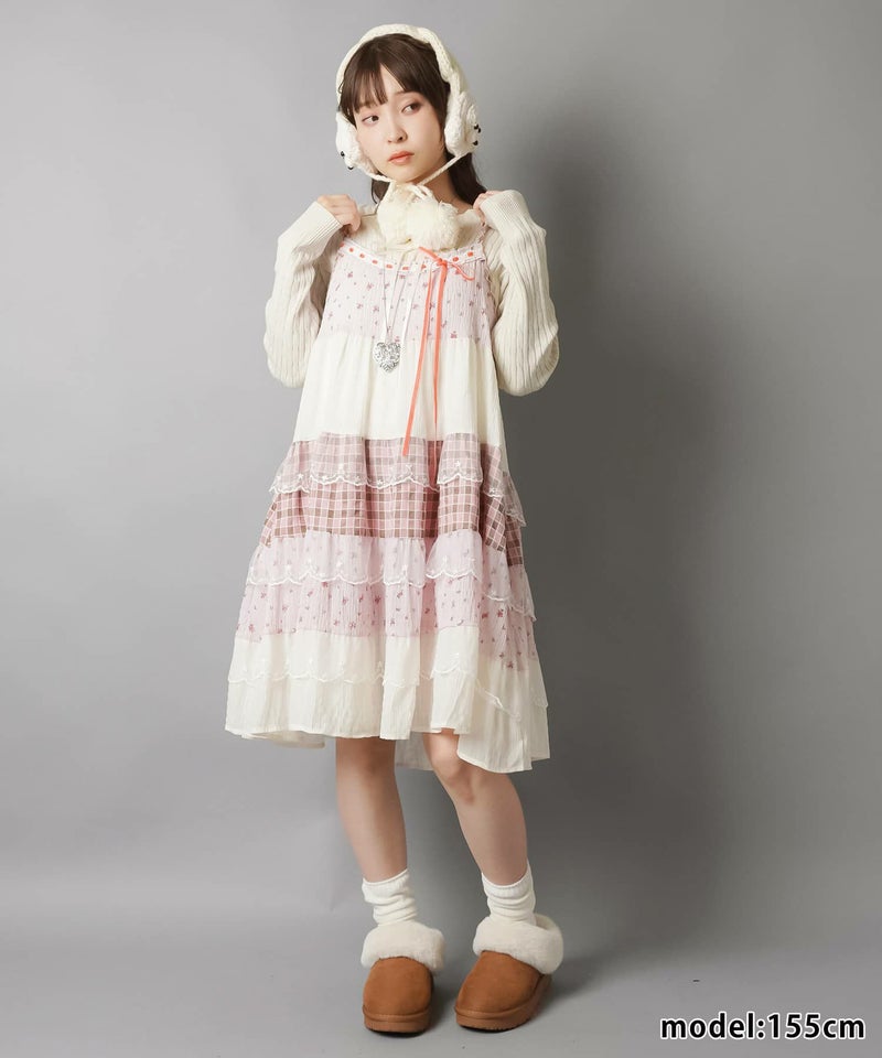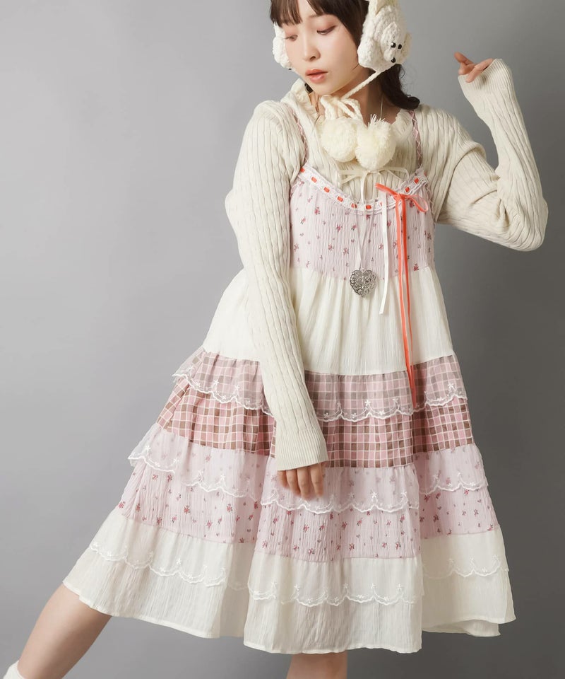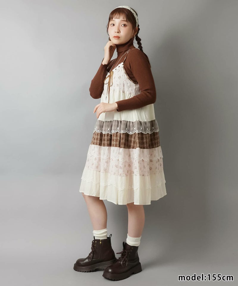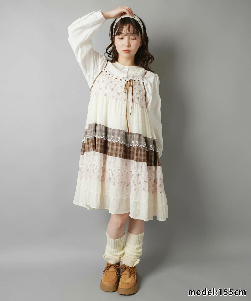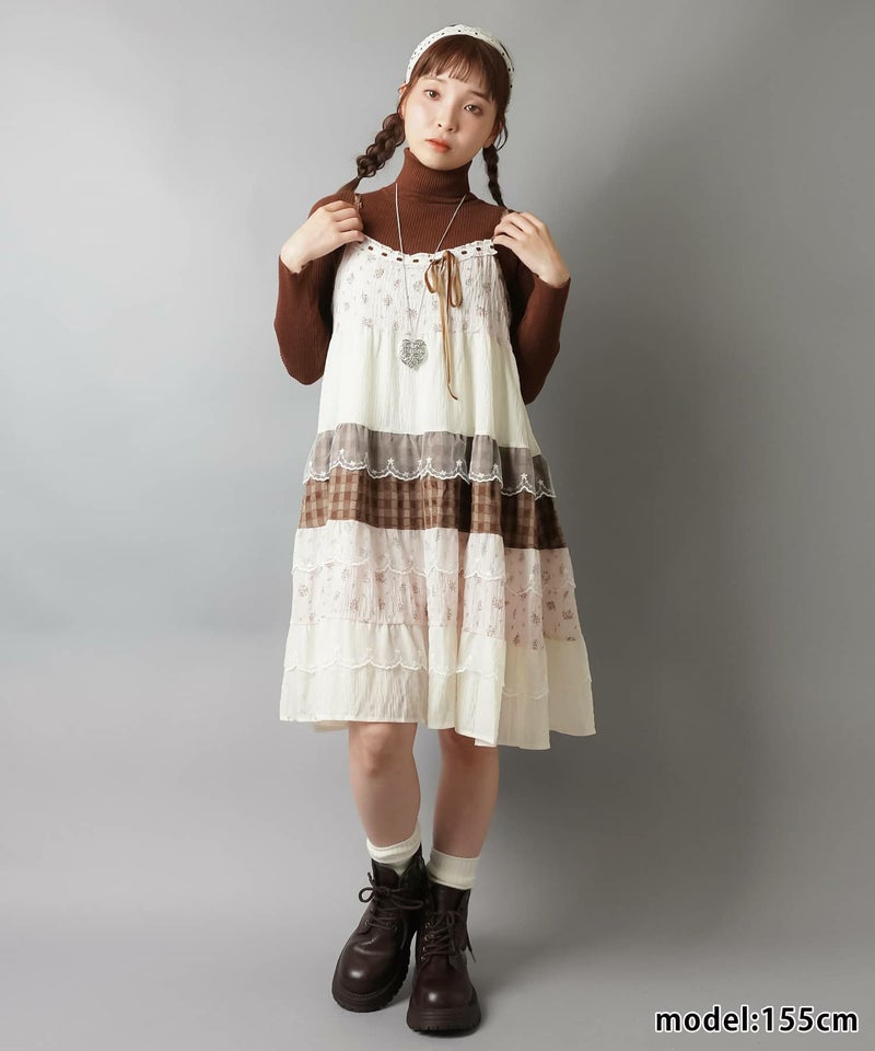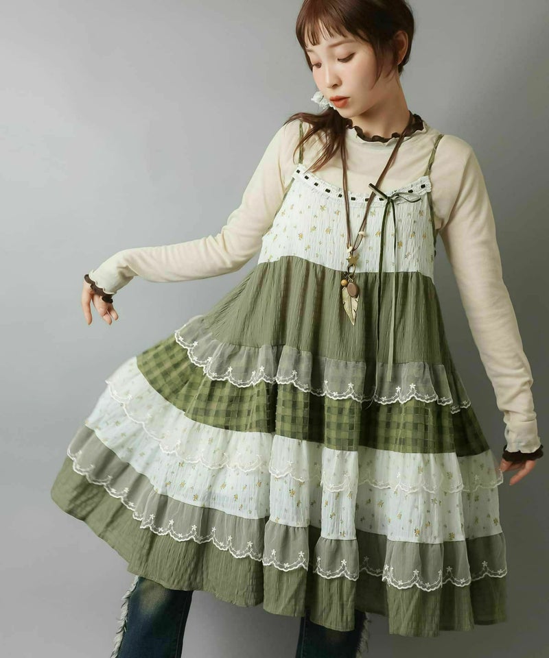 ヴィンテージ風ミニキャミワンピース/つぎはぎティアード/チェック/レース/全5色/#NEO森ガール