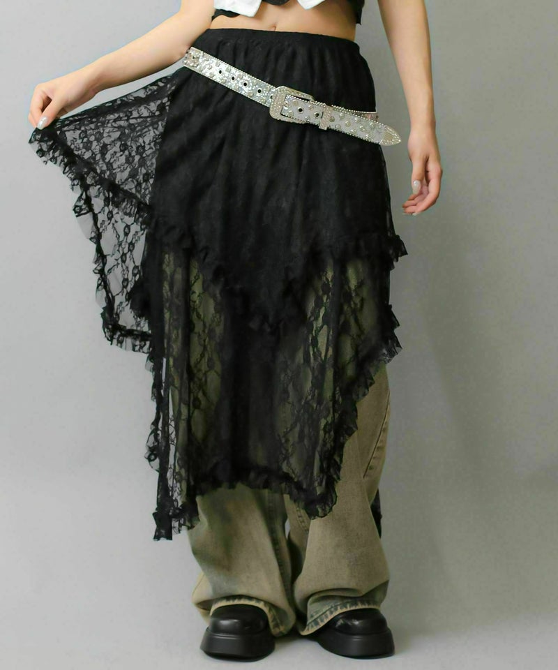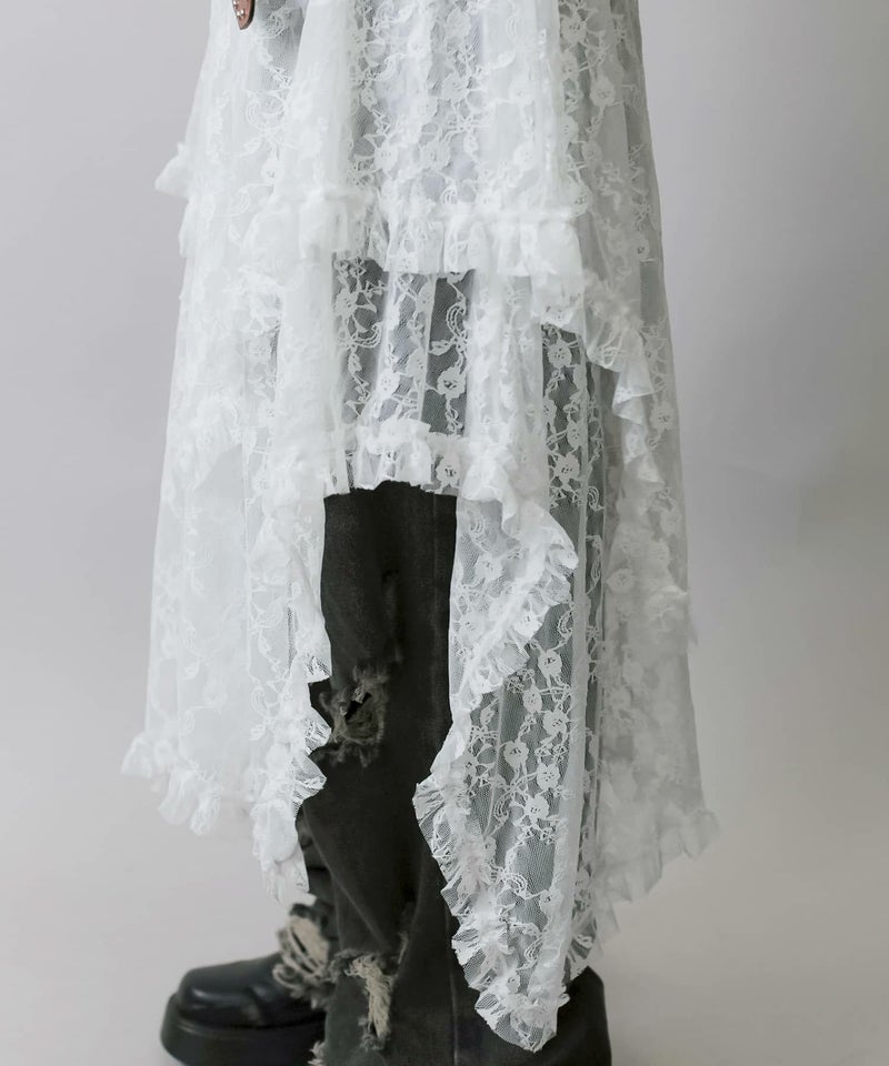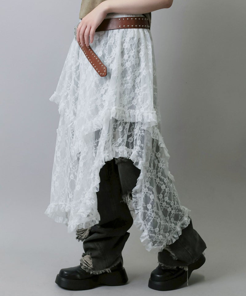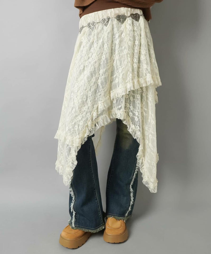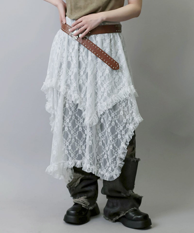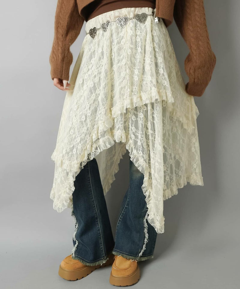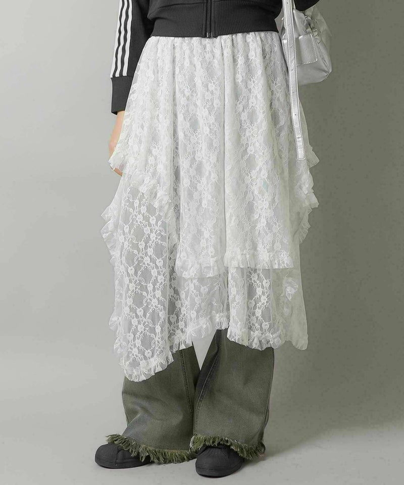 様々なスタイリングに映えるイレギュラーヘムラインレーススカートです。