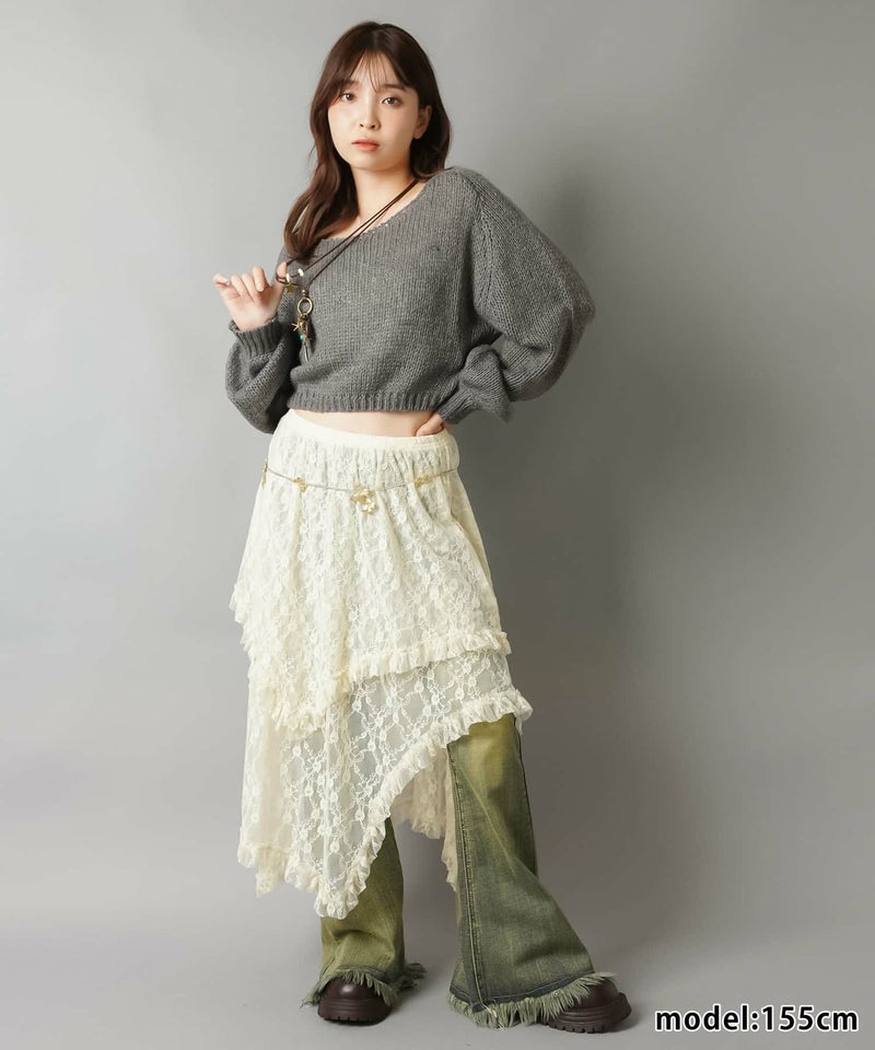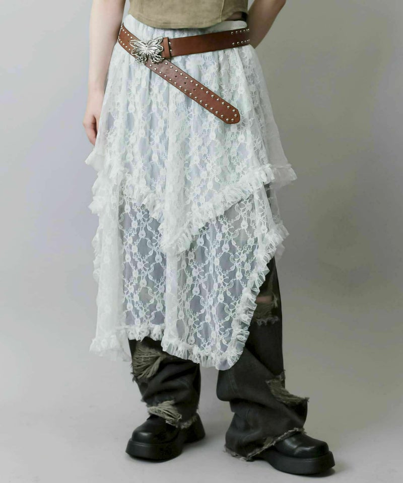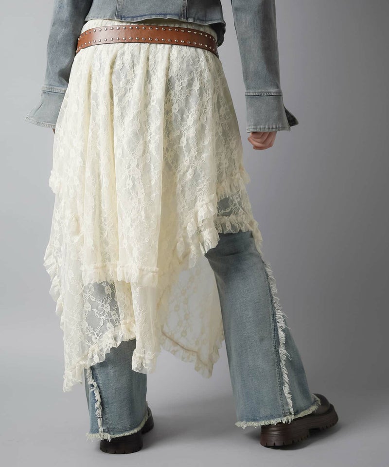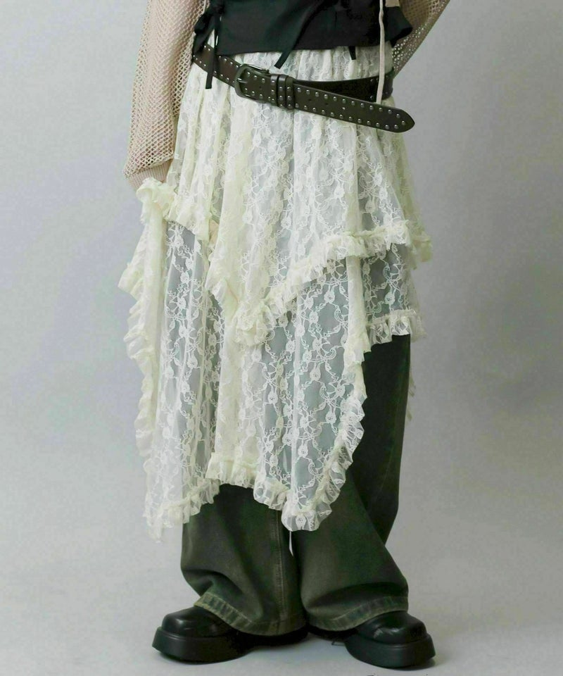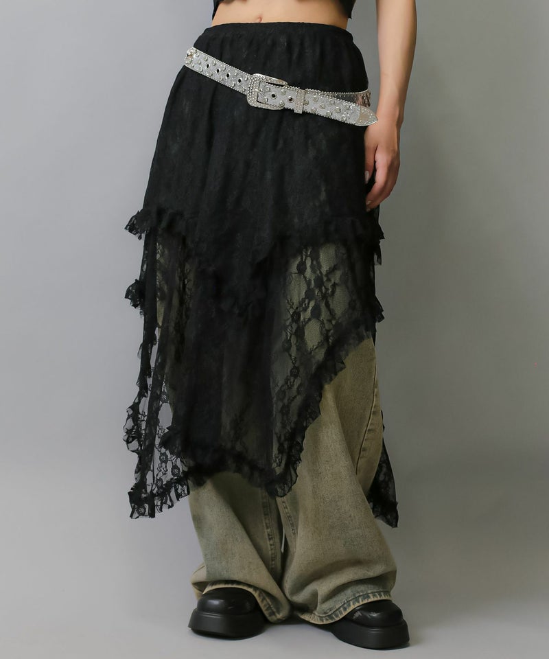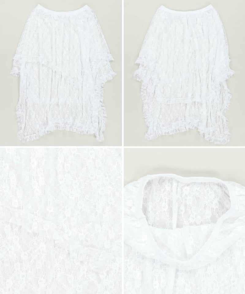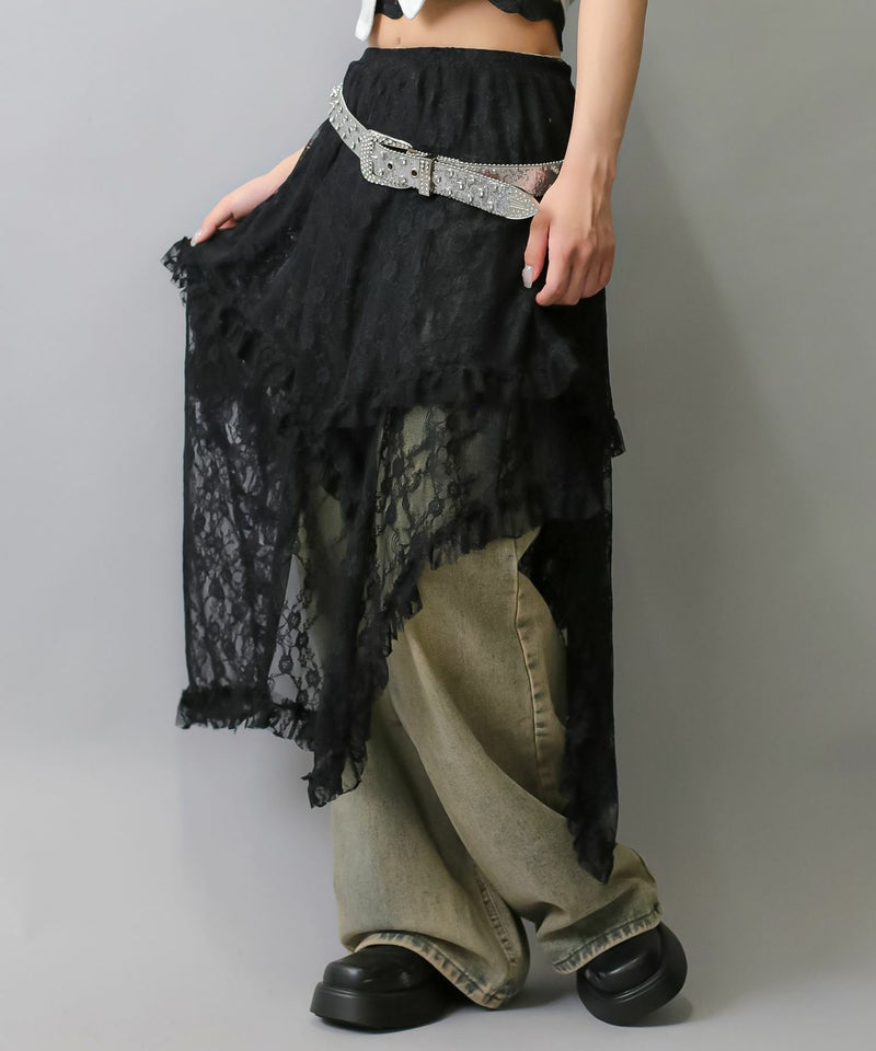 様々なスタイリングに映えるイレギュラーヘムラインレーススカートです。