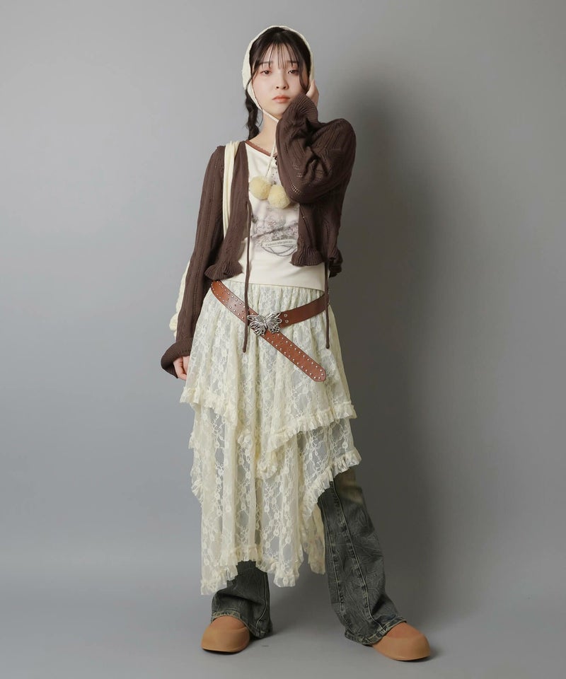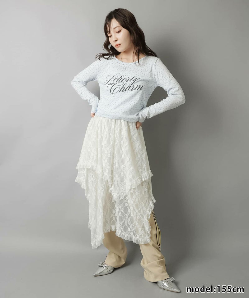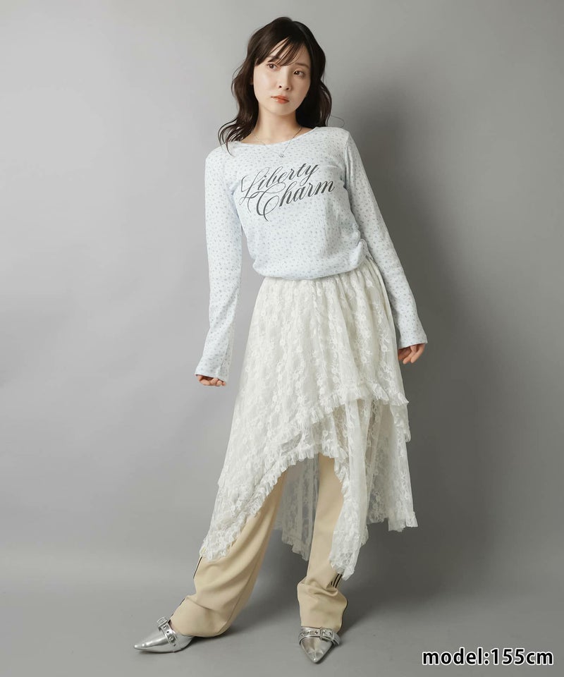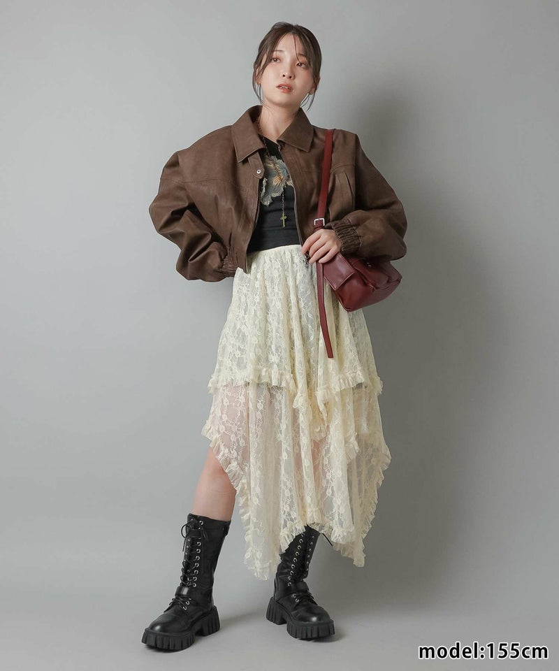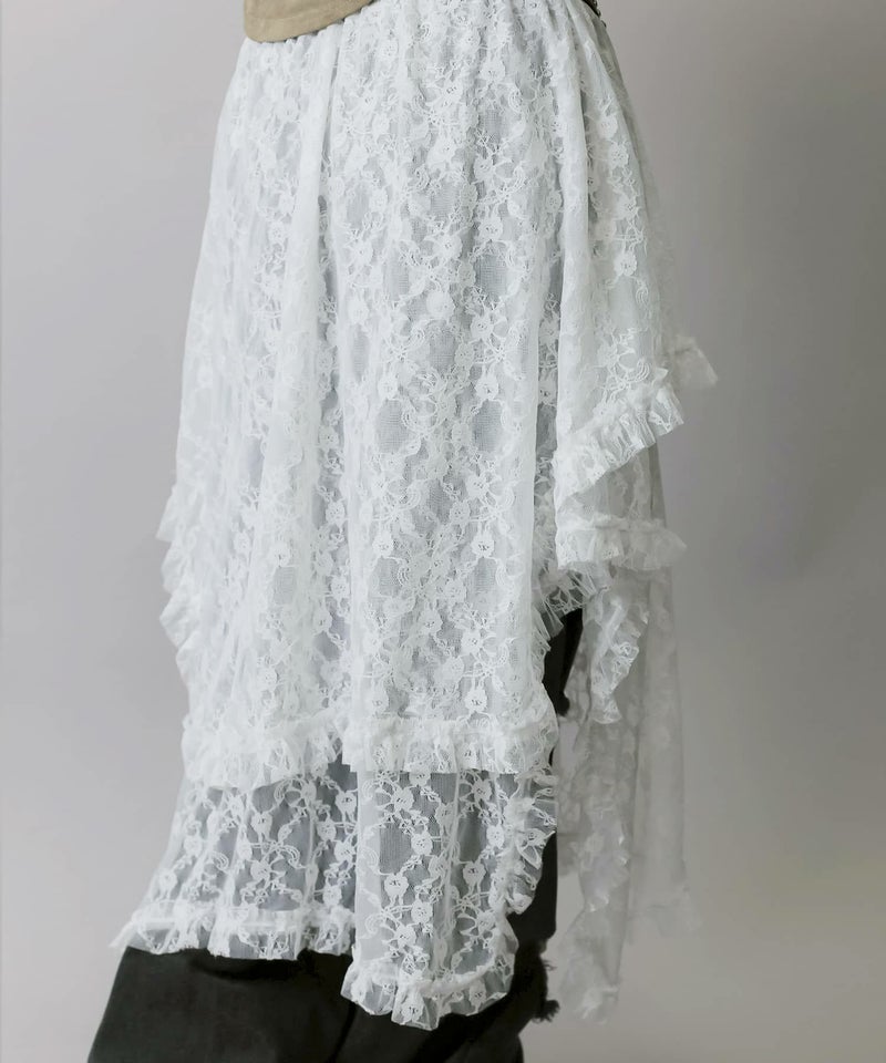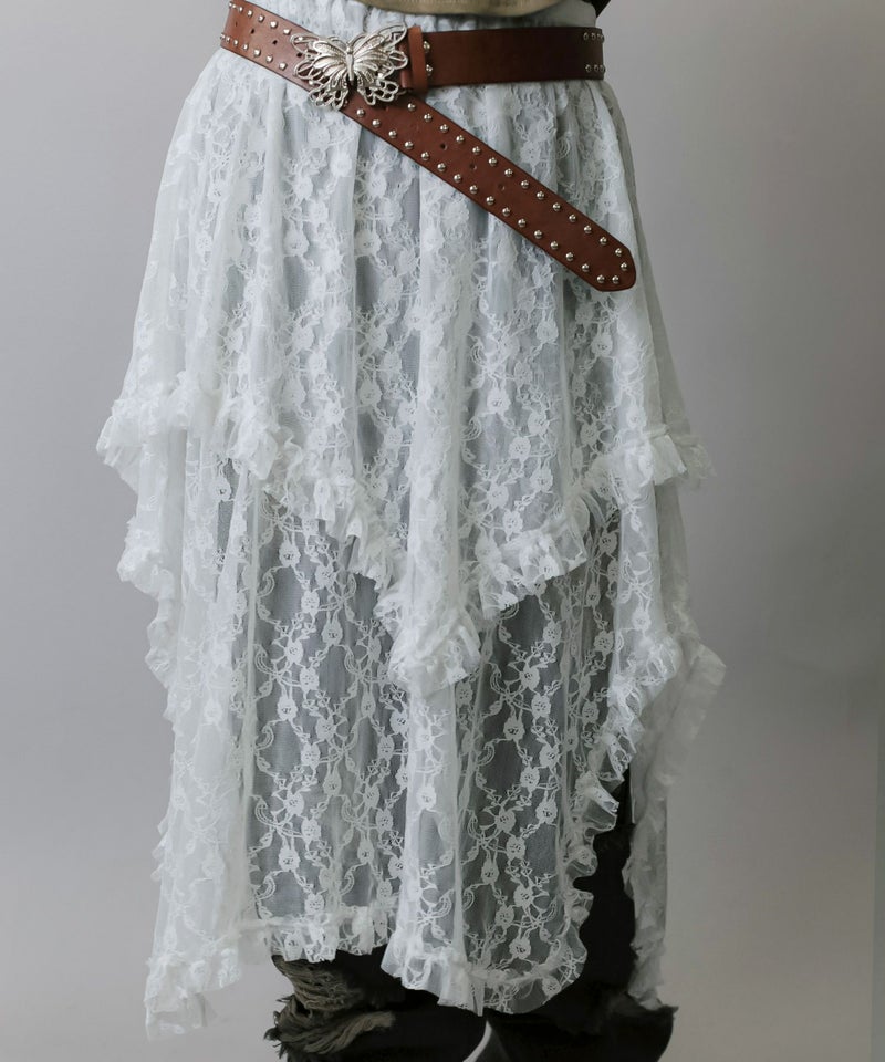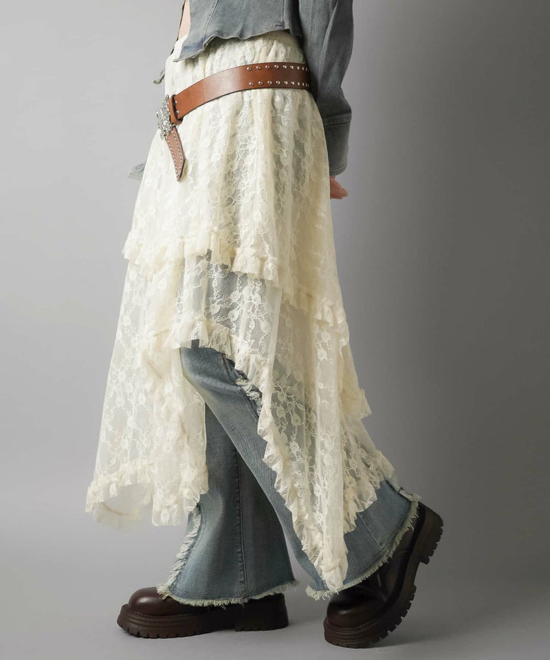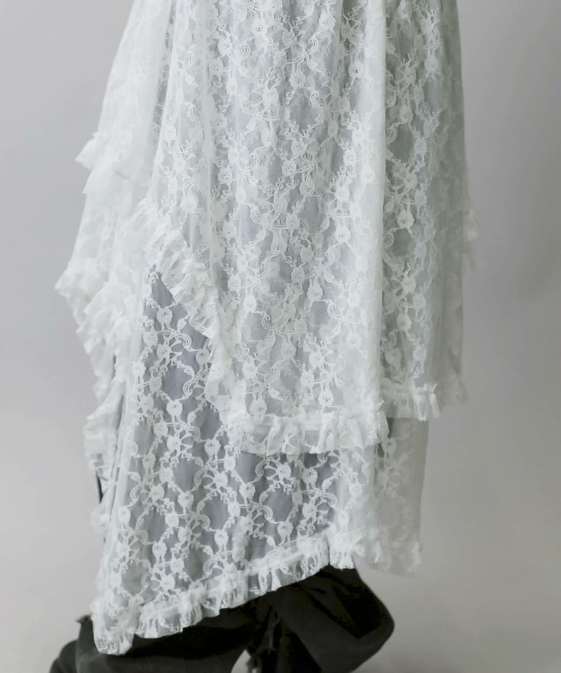 様々なスタイリングに映えるイレギュラーヘムラインレーススカートです。