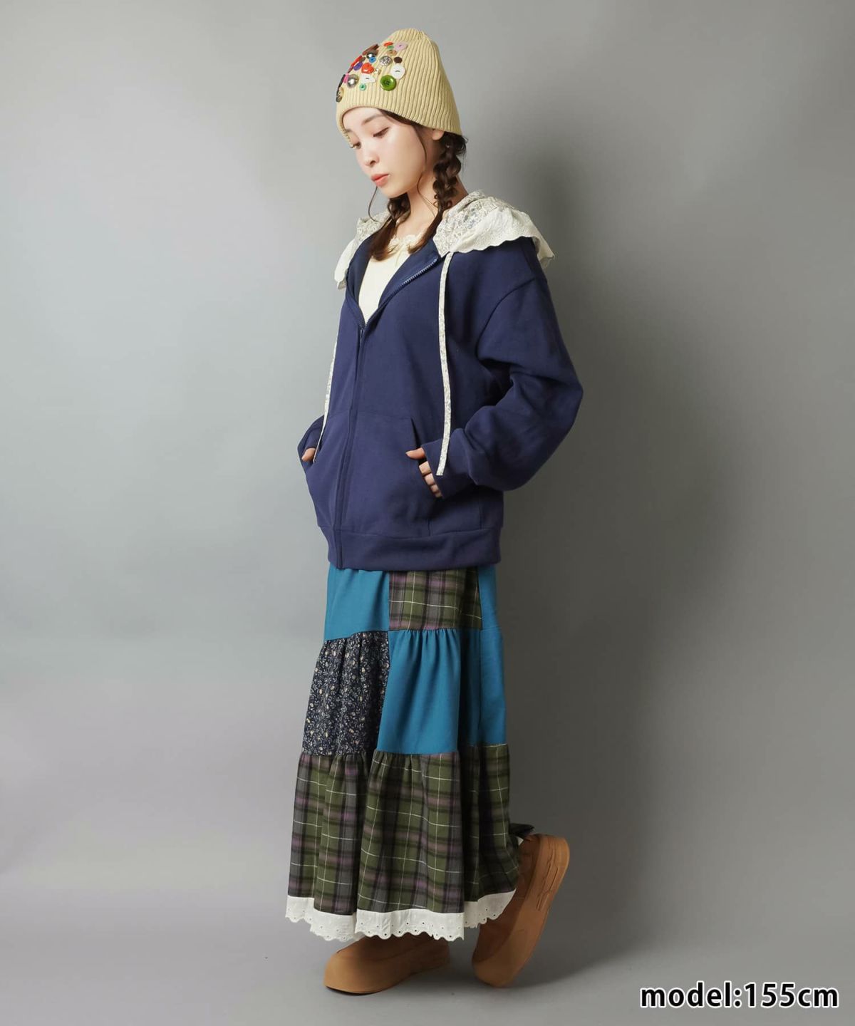 スカートにレギンスやタイツをレイヤードするのもポイント。
