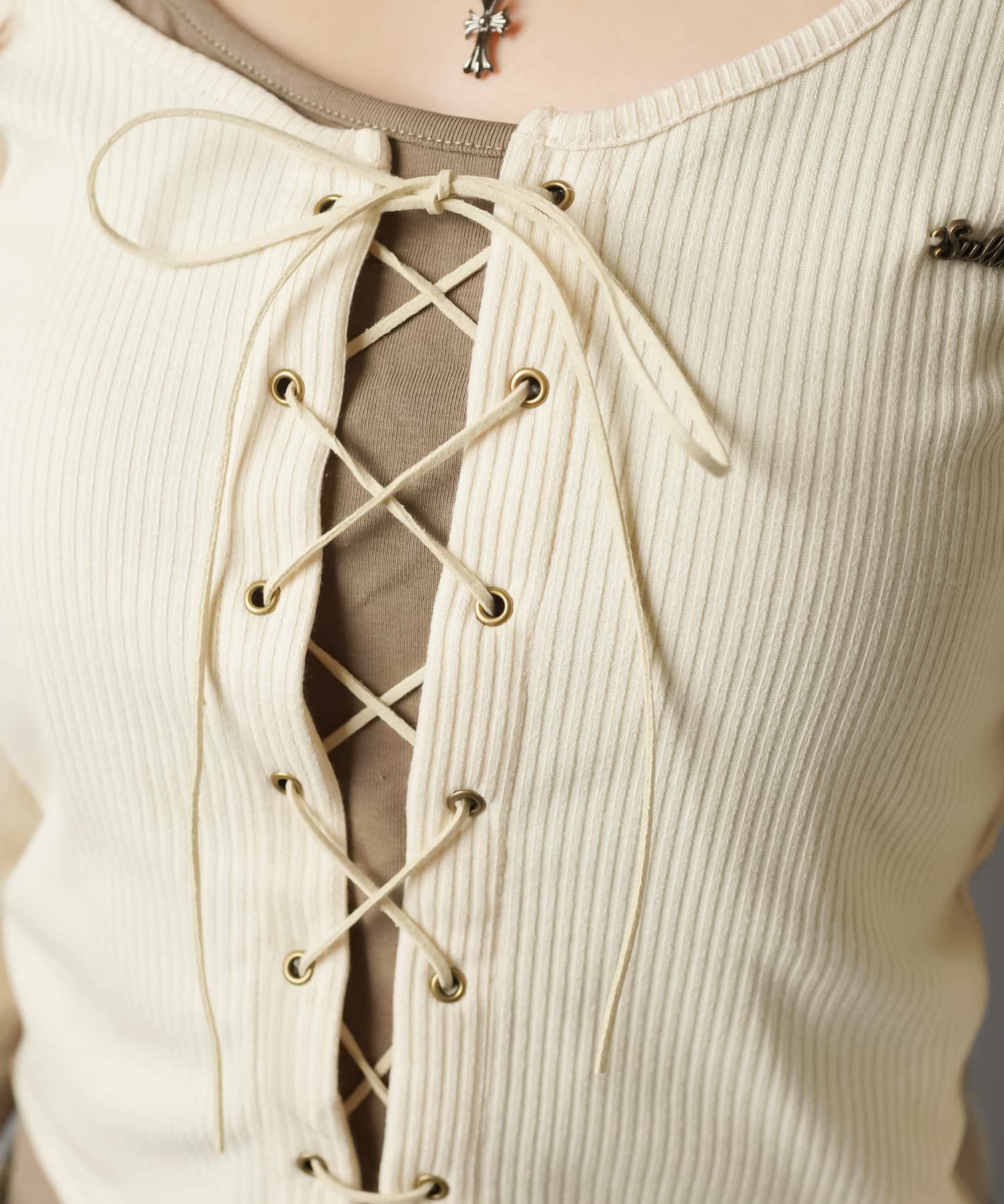 キャミソールレイヤード風長袖カットソー/レースアップ/#NEO森ガール