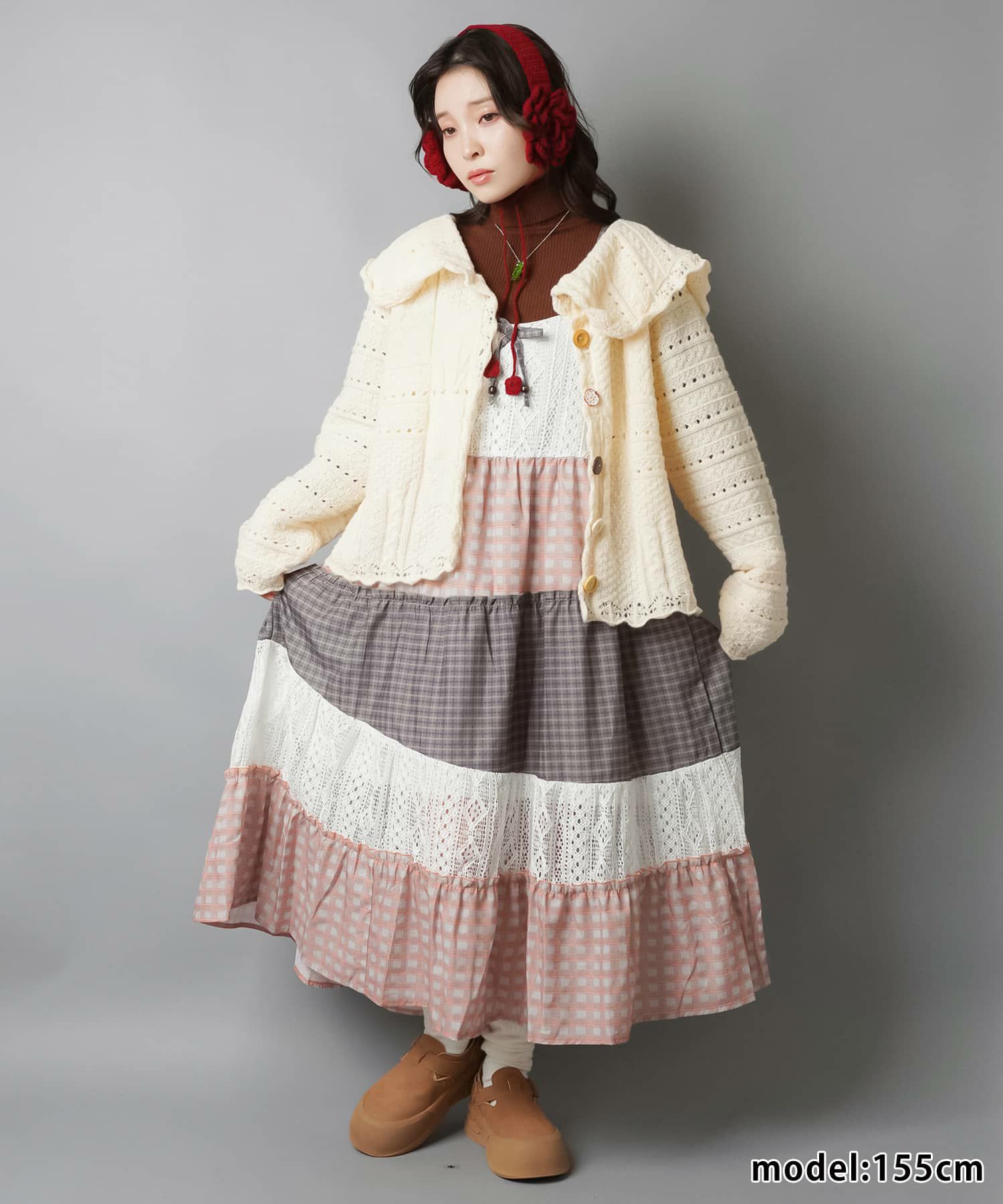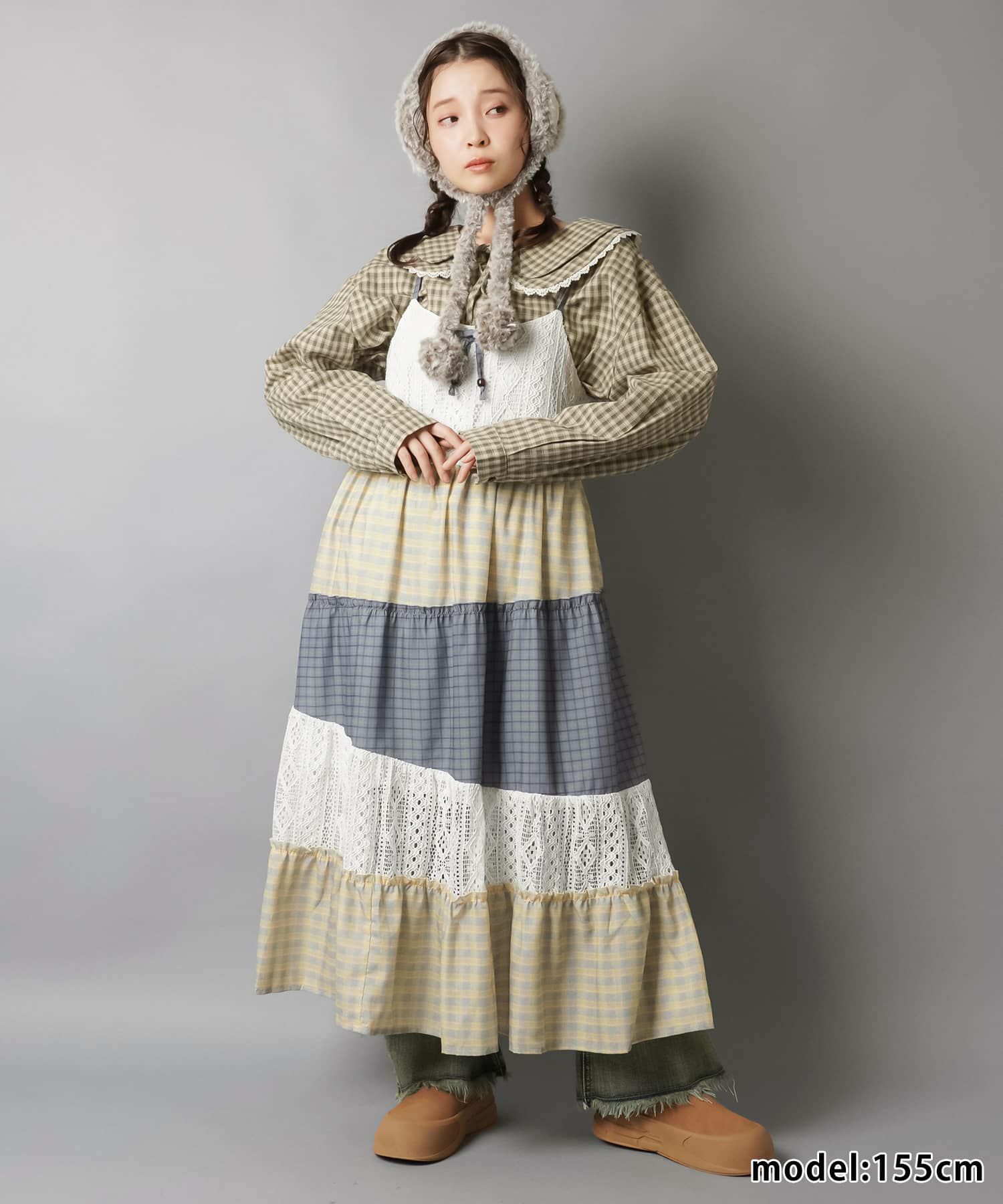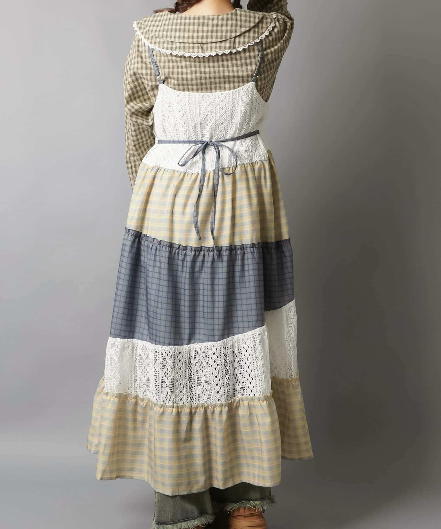 異素材のときめきをぎゅっと☆★ ヴィンテージ風ミニキャミワンピース/つぎはぎティアード/チェック/レース/全5色/#NEO森ガール