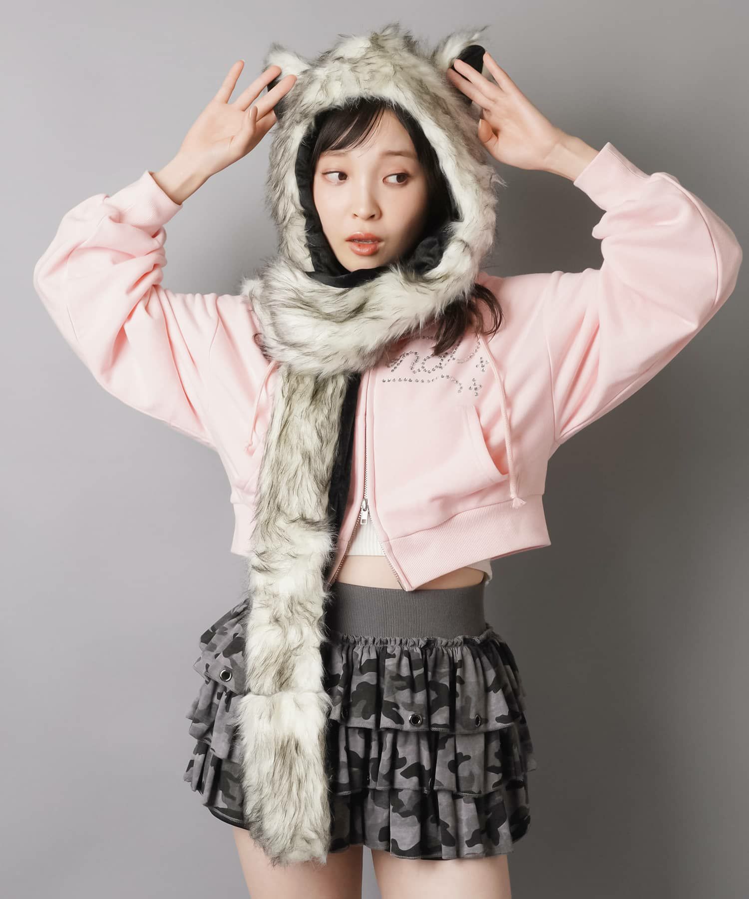 マフラーにもなる🐾 【50%OFF】耳付きフェイクファーアニマルキャップ/ロングポケット/ヒョウ/ウルフ/#平成ギャル
