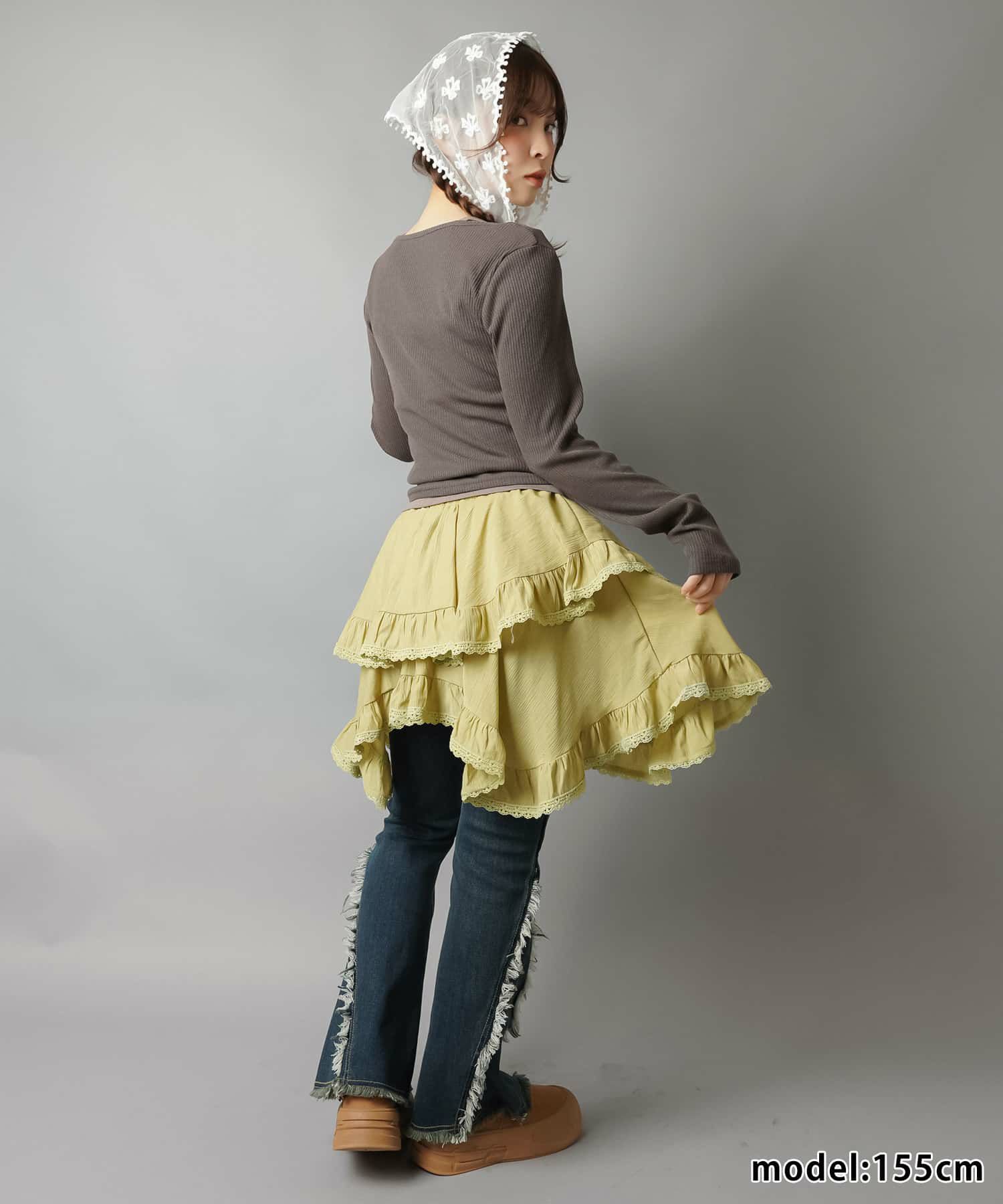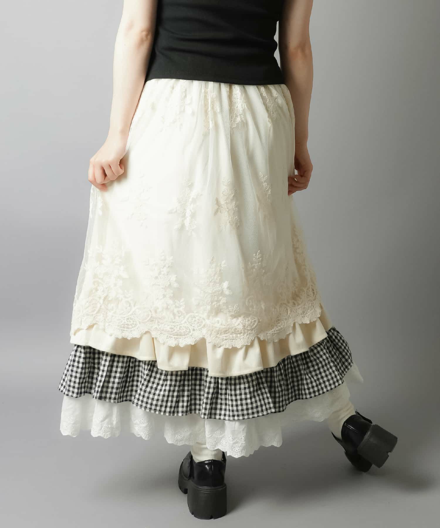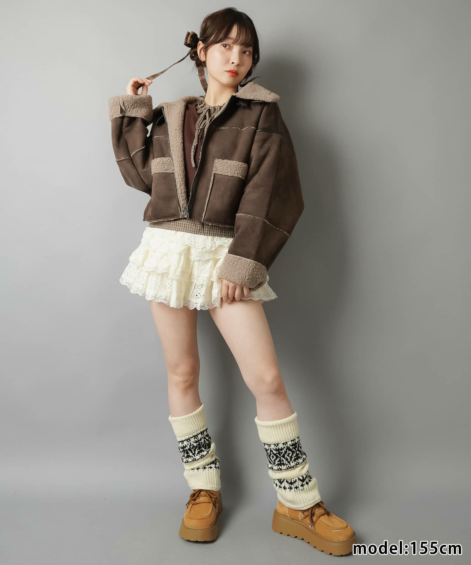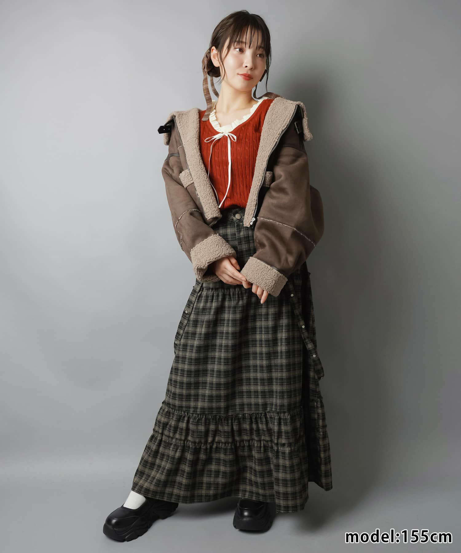 スカートにレギンスやタイツをレイヤードするのもポイント。