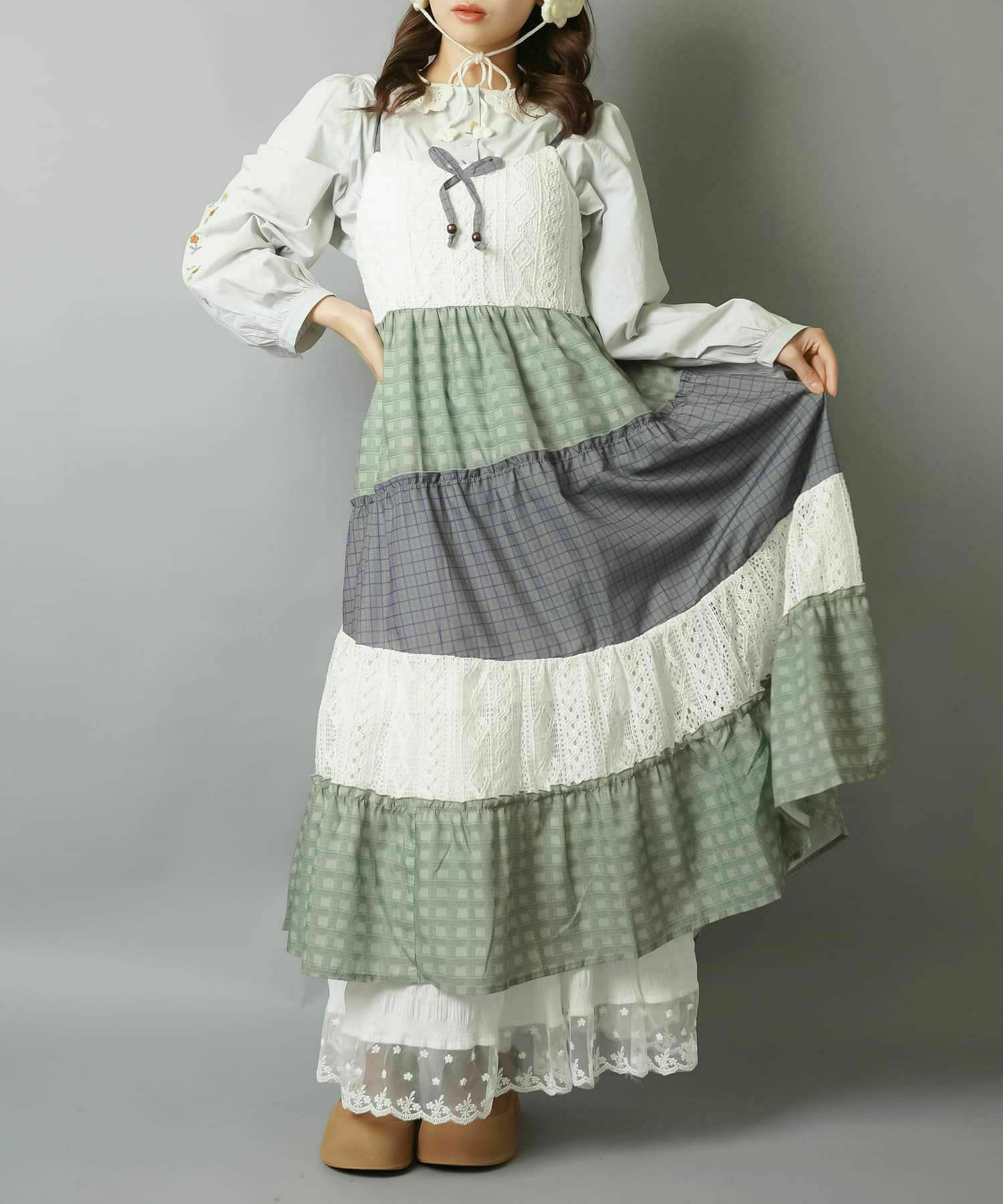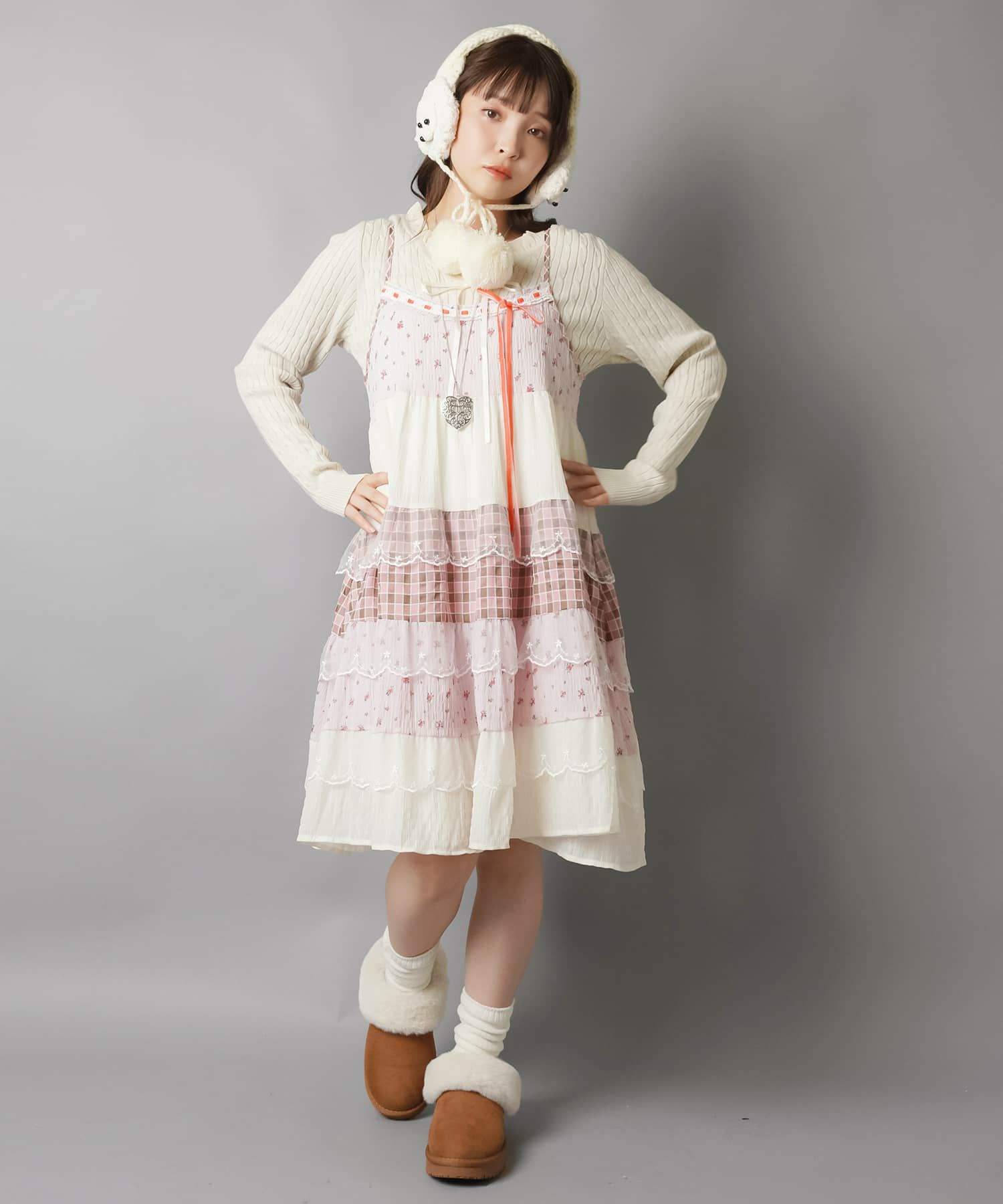 薄手のワンピースにニットベストを重ねたり、