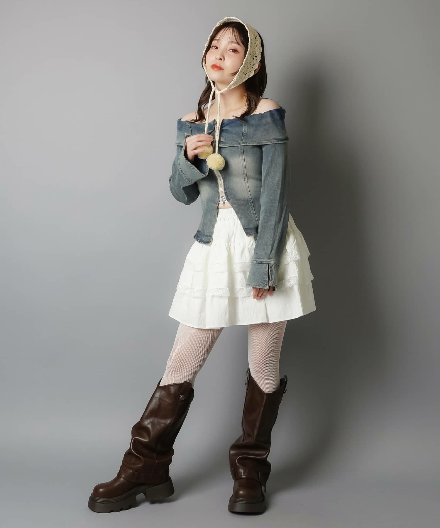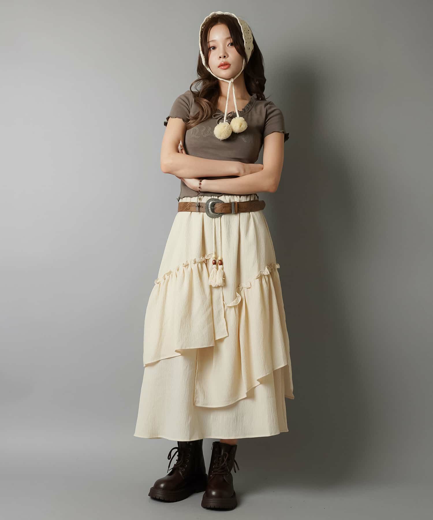 スカートにレギンスやタイツをレイヤードするのもポイント。