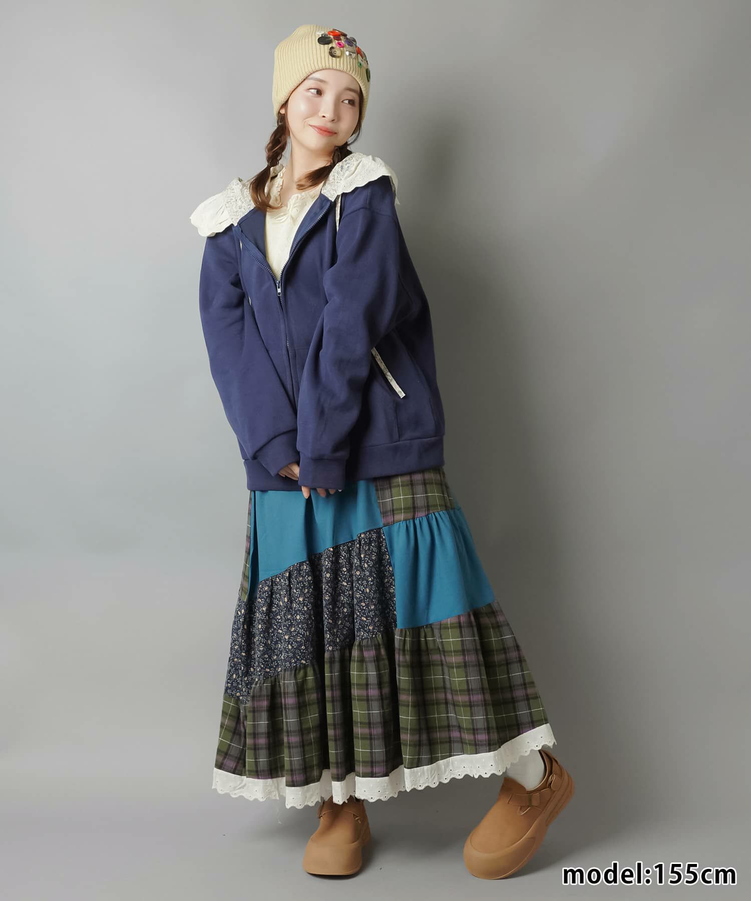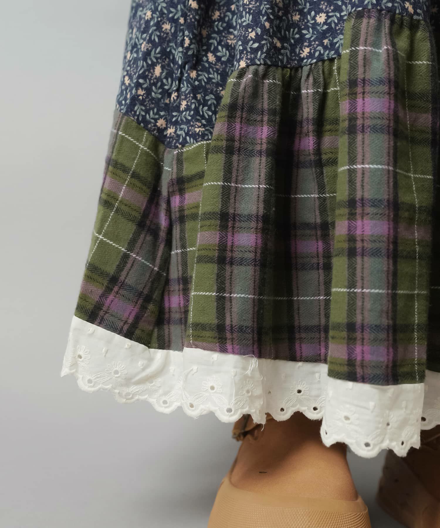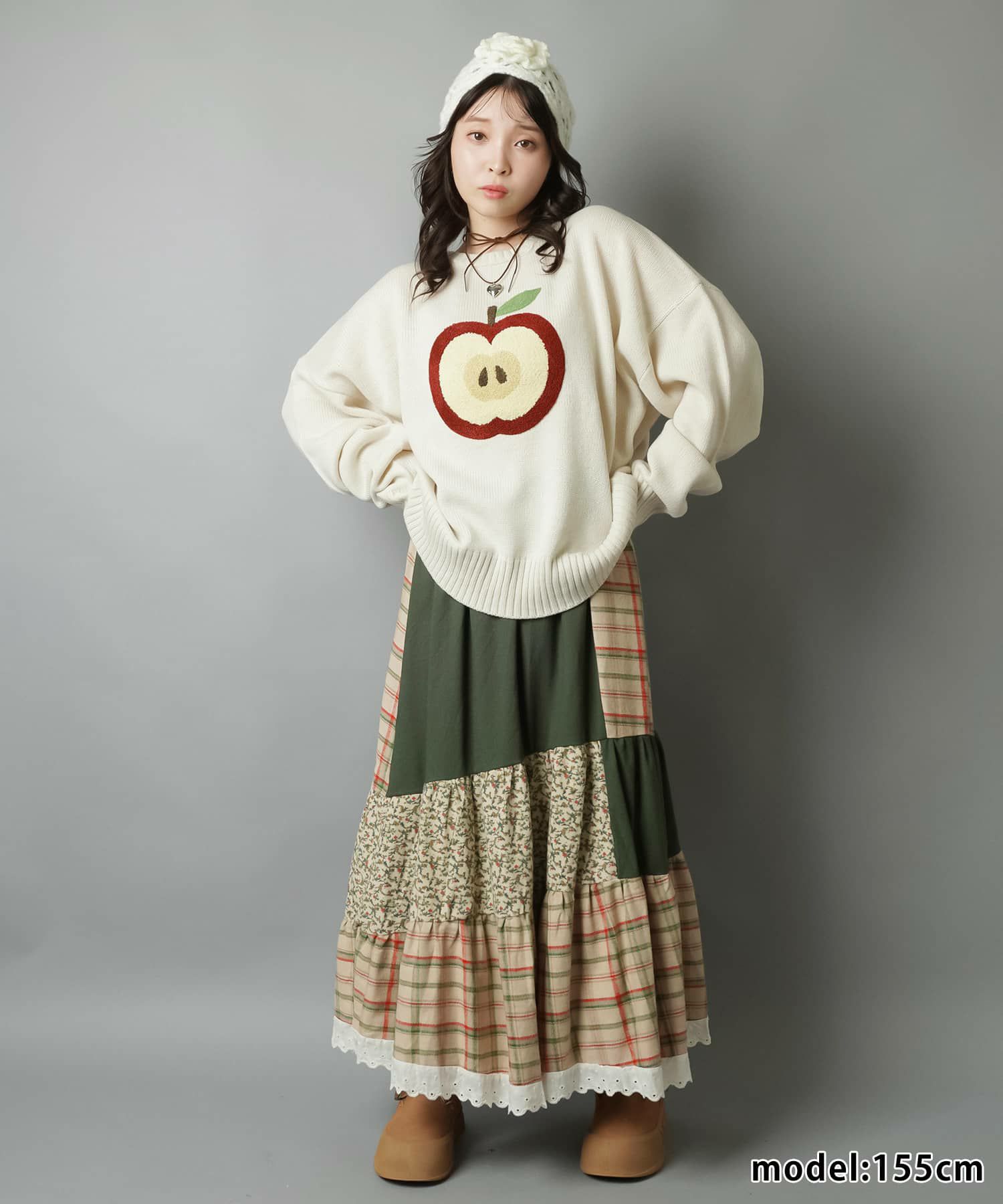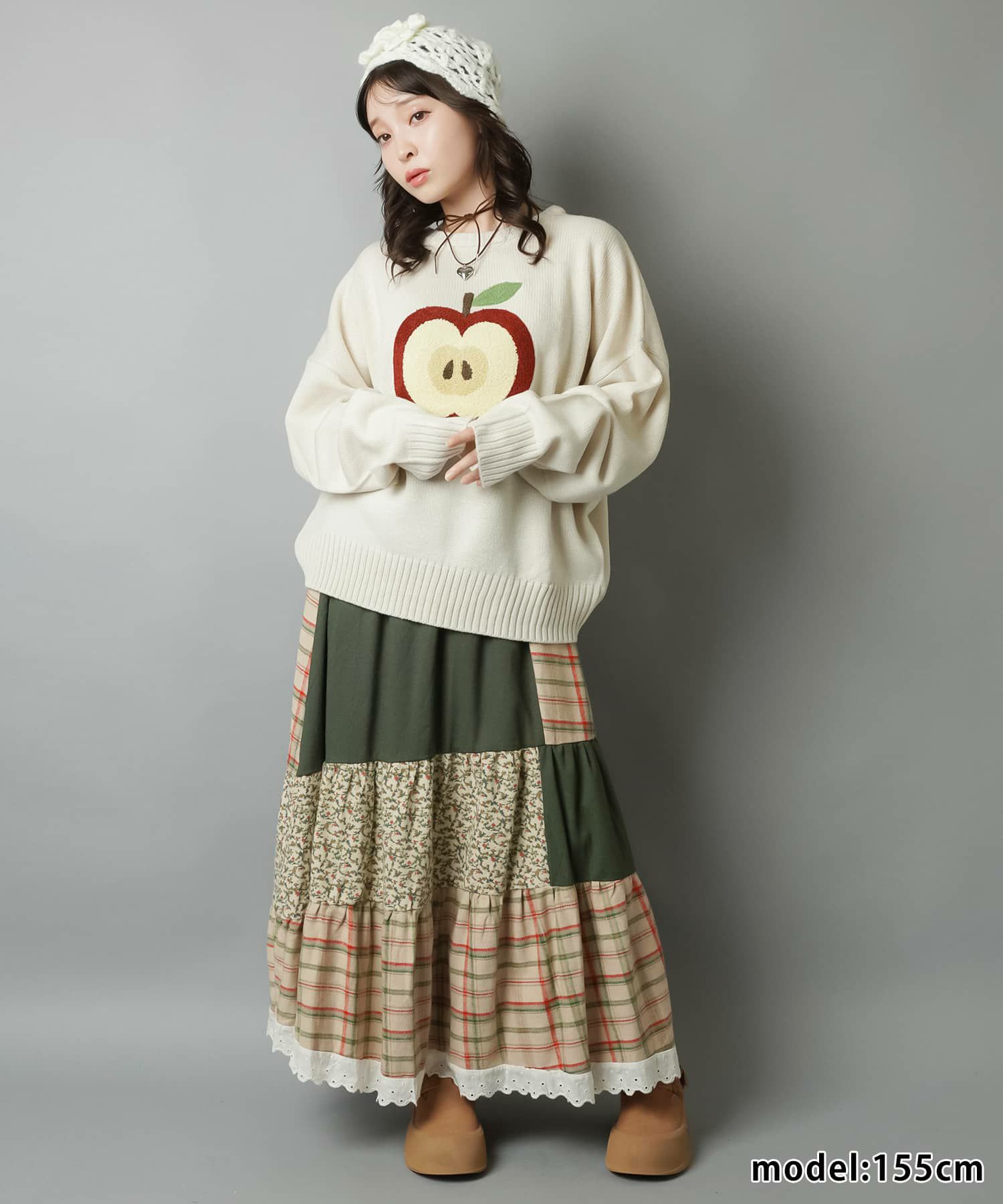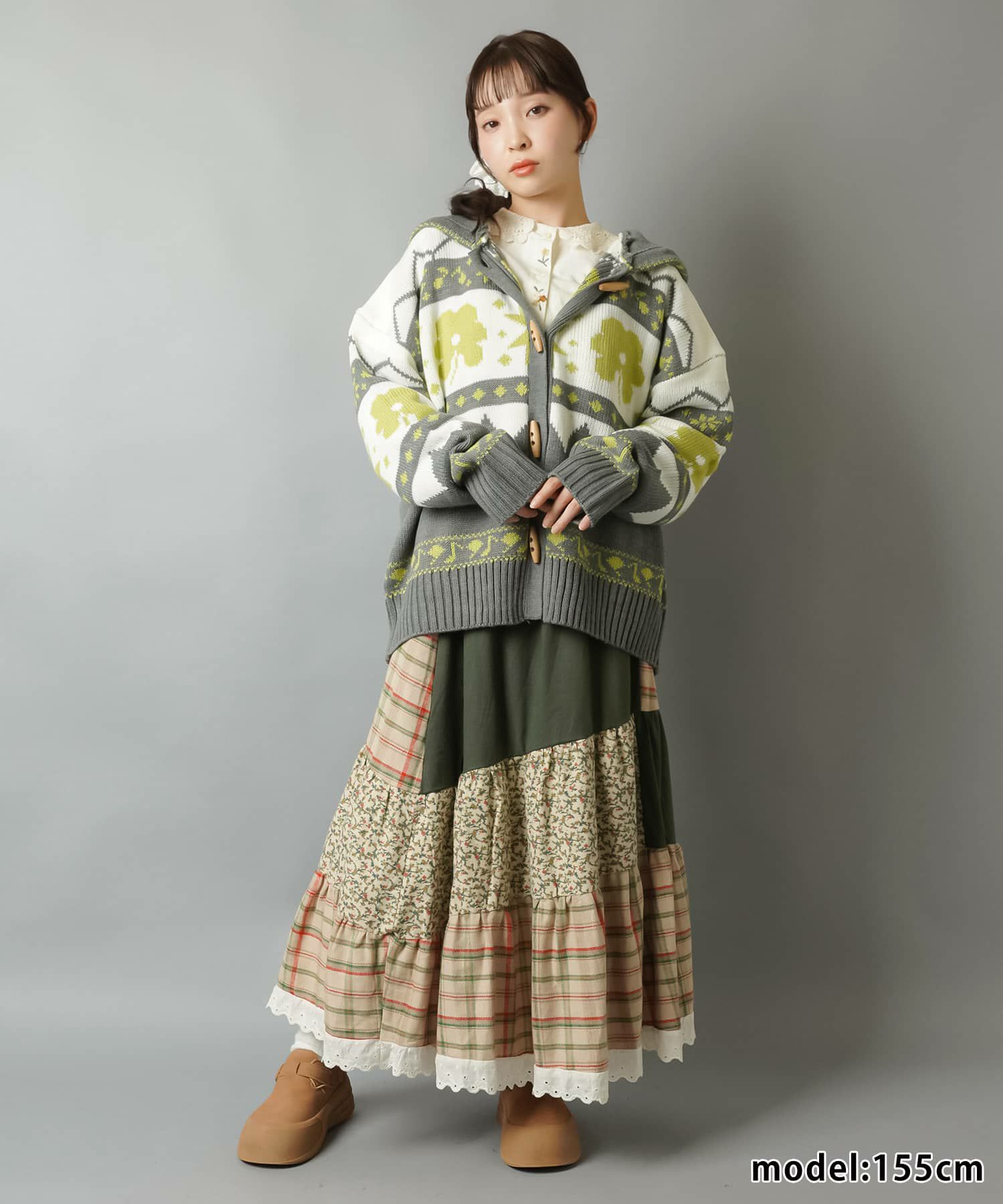 スカートにレギンスやタイツをレイヤードするのもポイント。