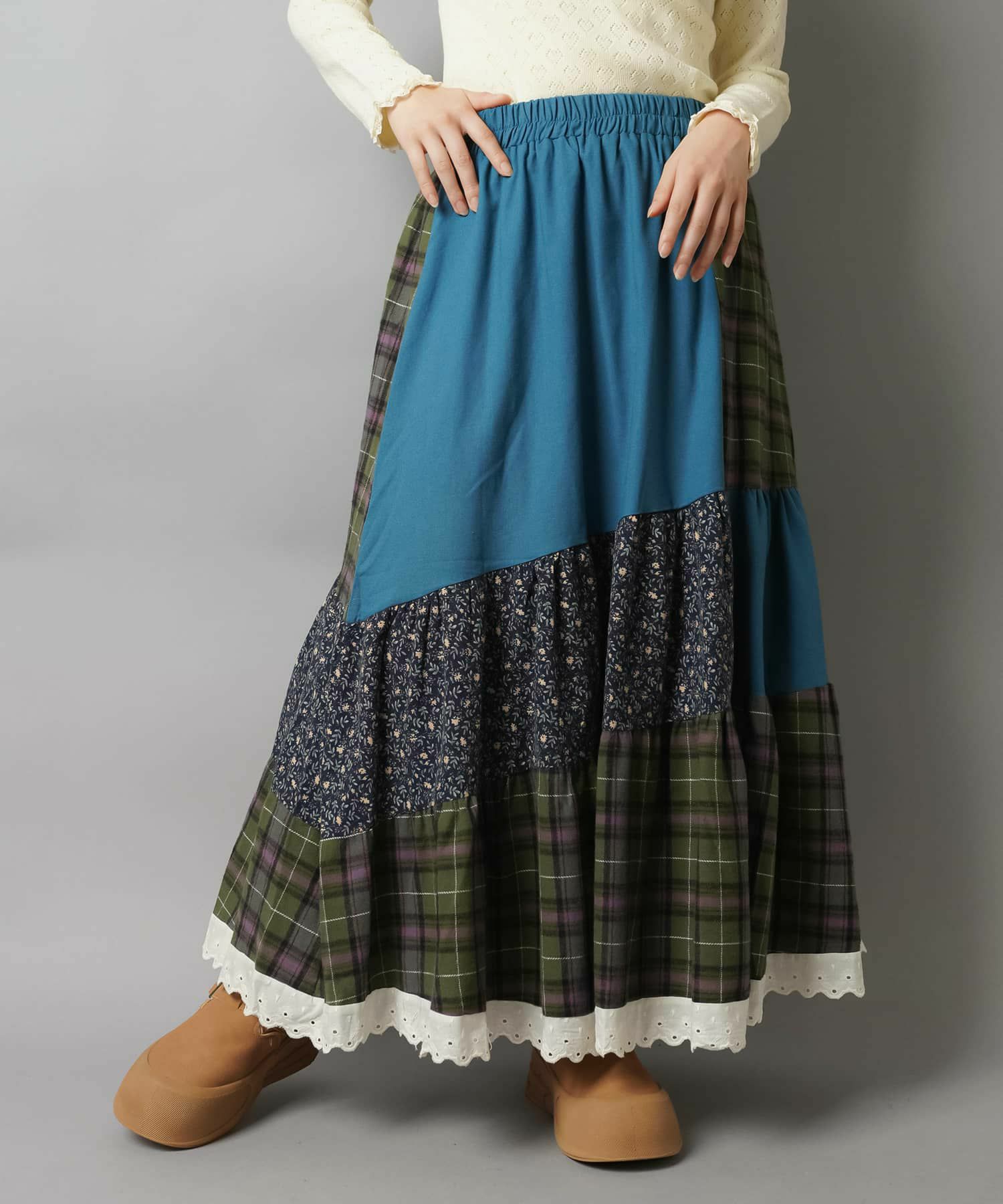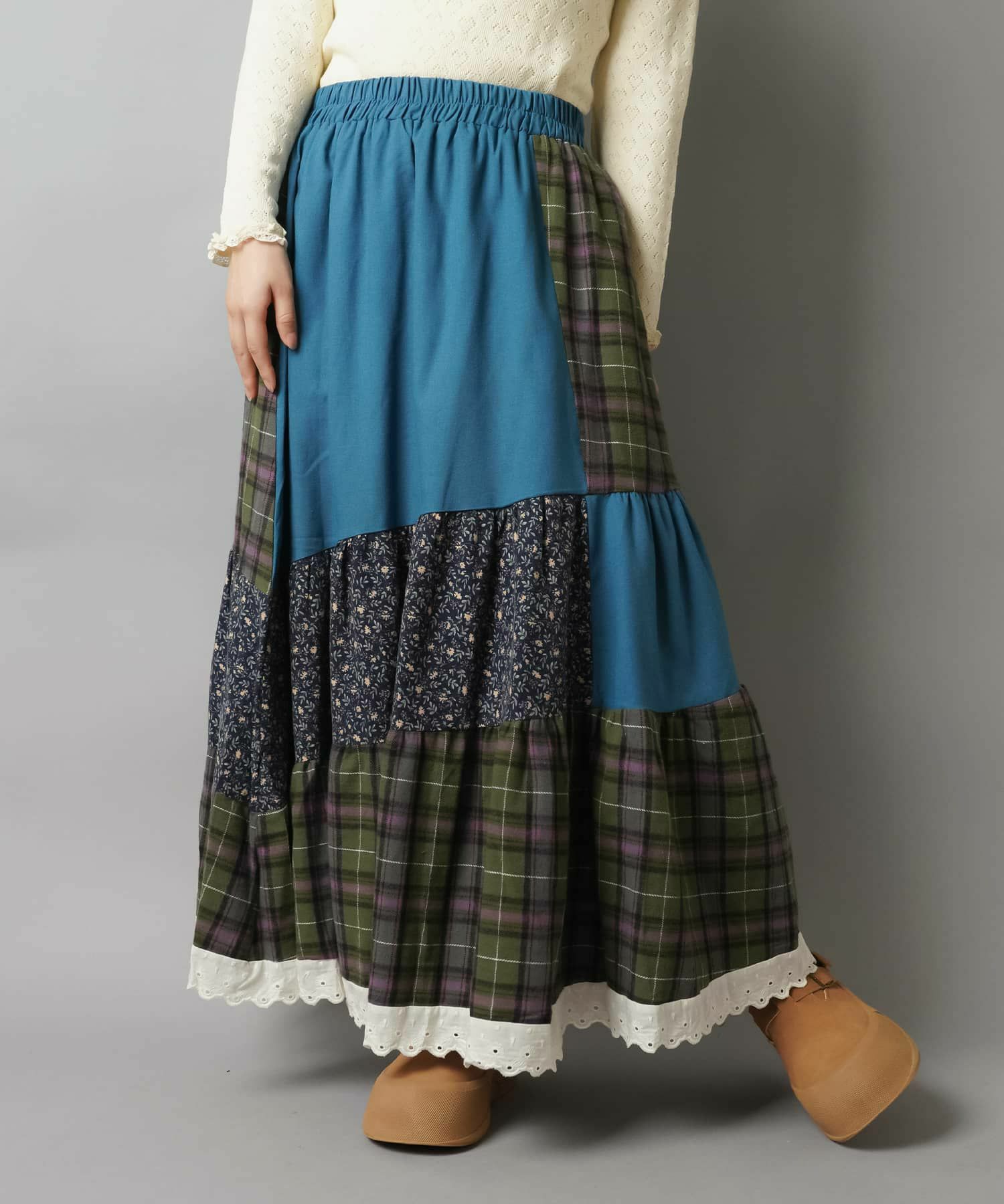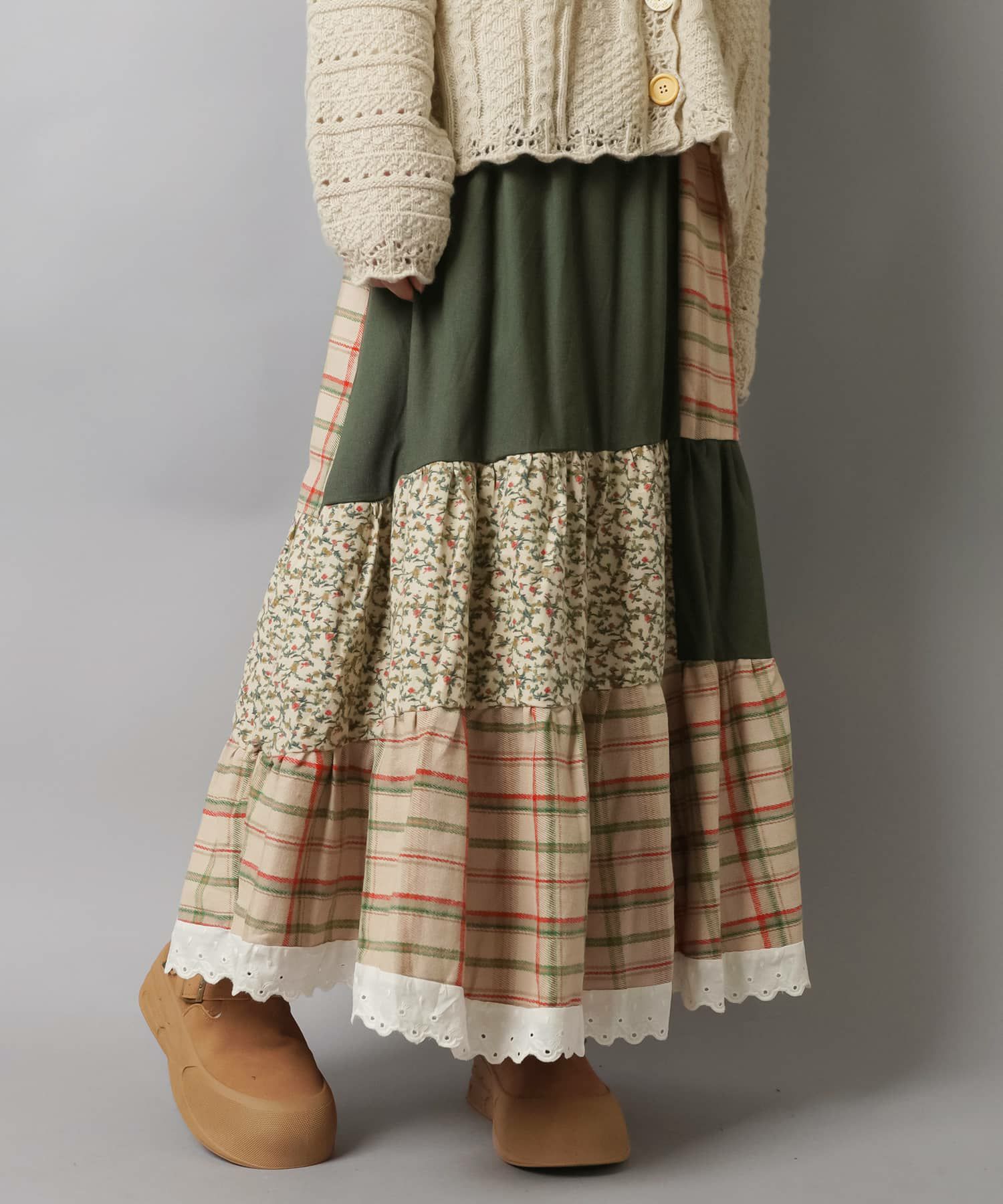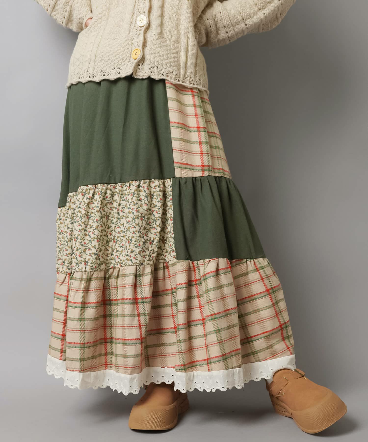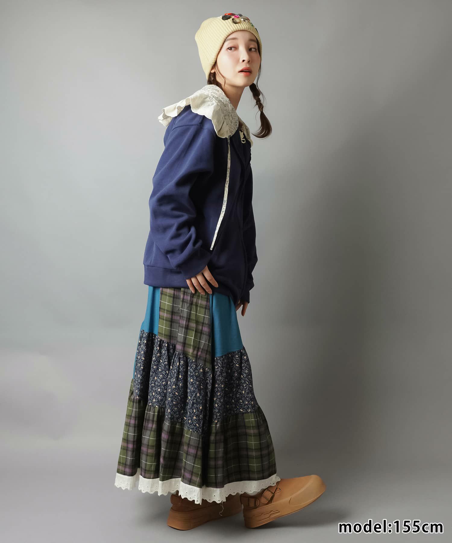 スカートにレギンスやタイツをレイヤードするのもポイント。