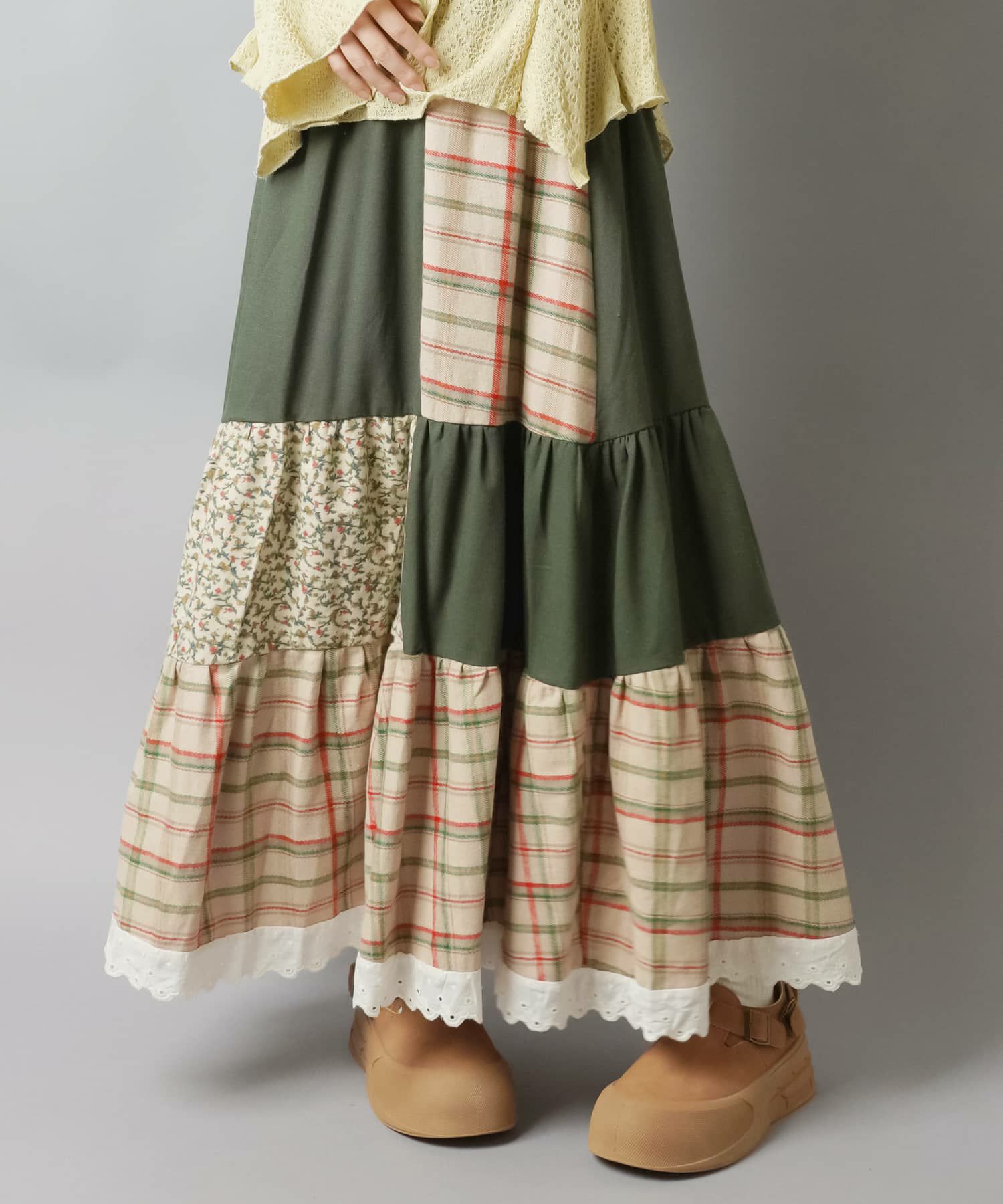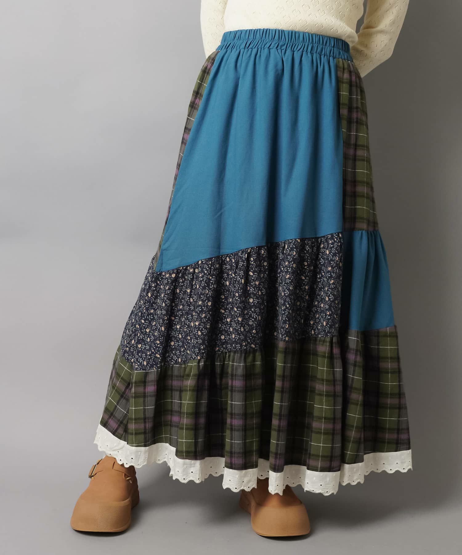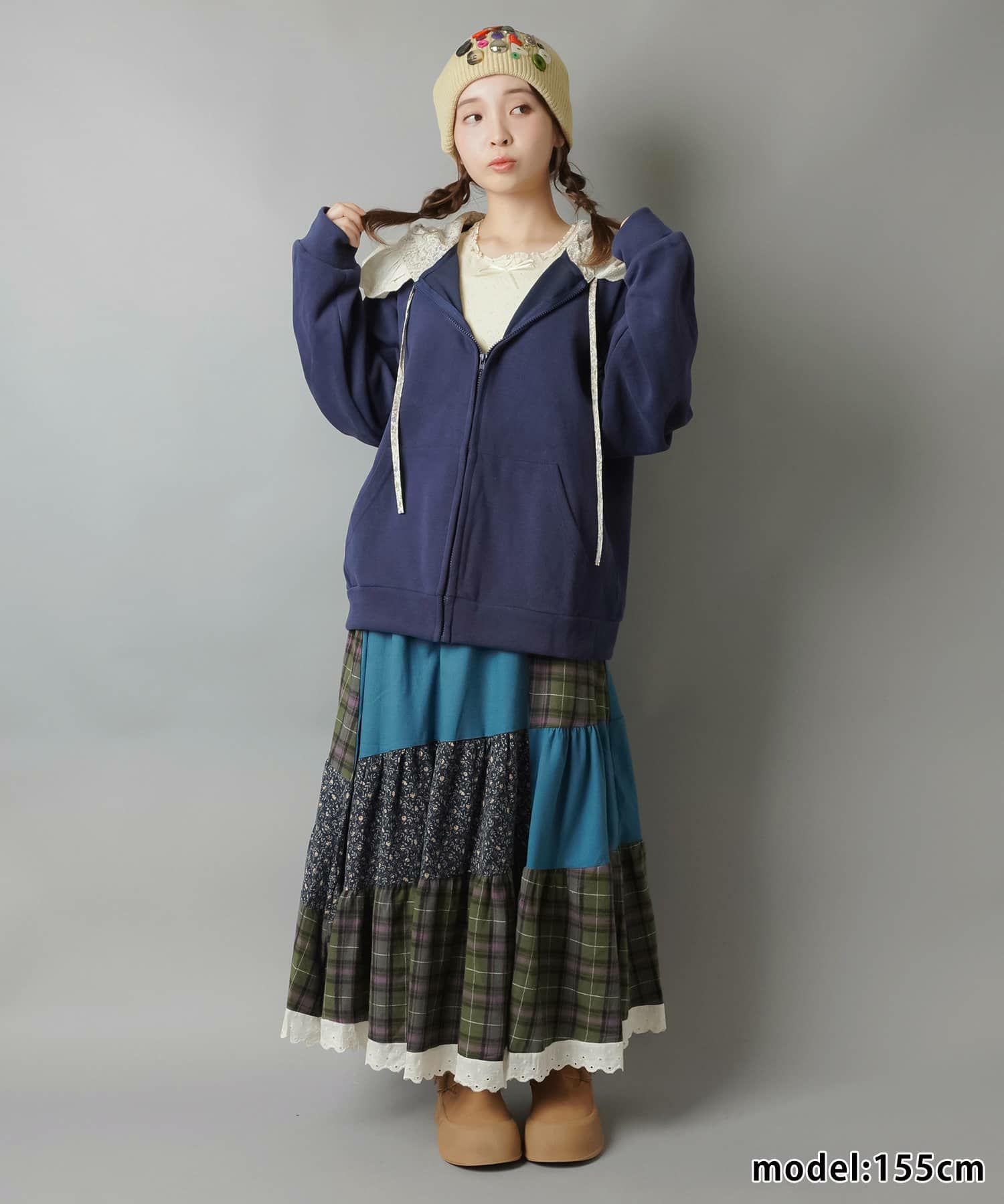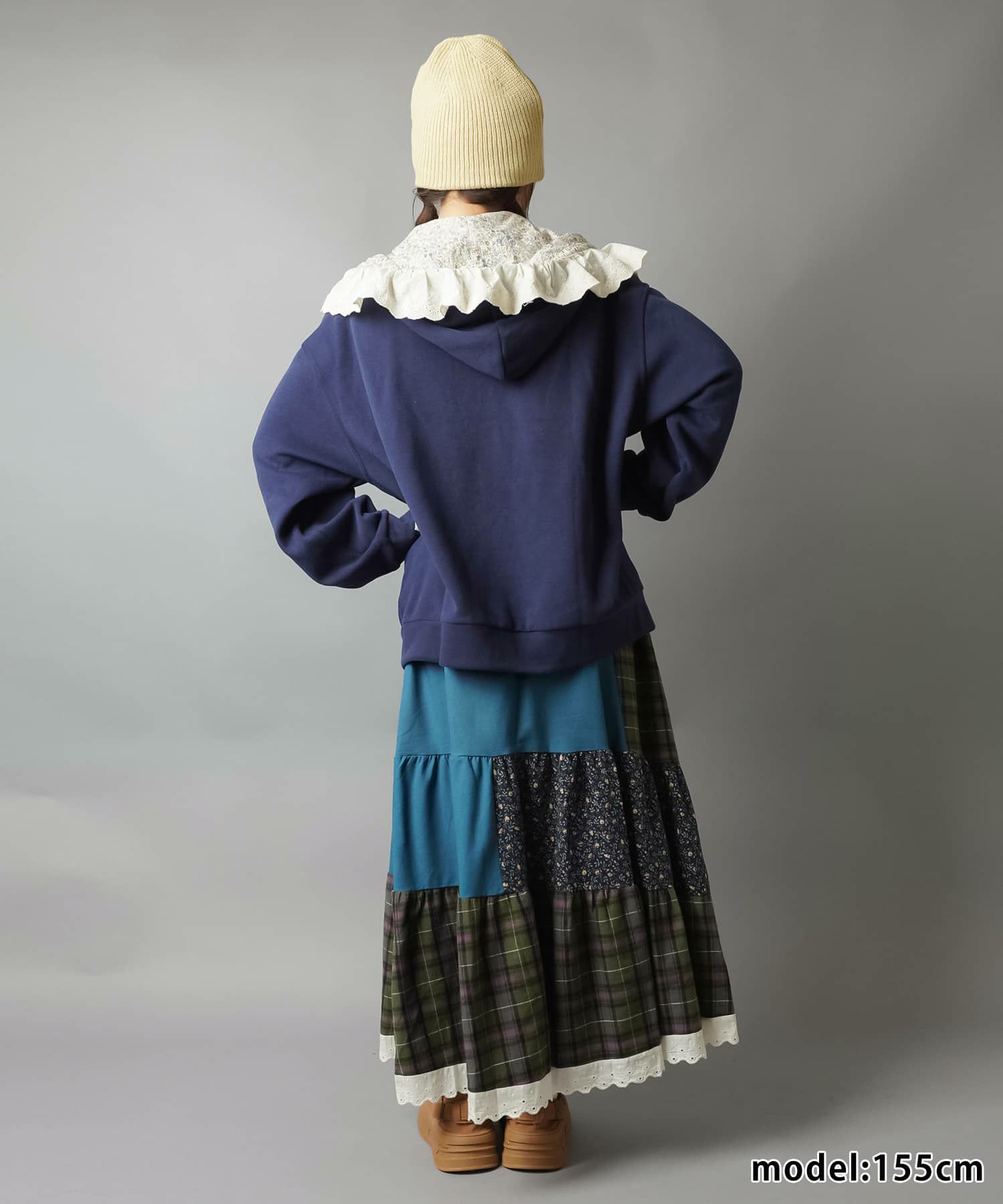 スカートにレギンスやタイツをレイヤードするのもポイント。