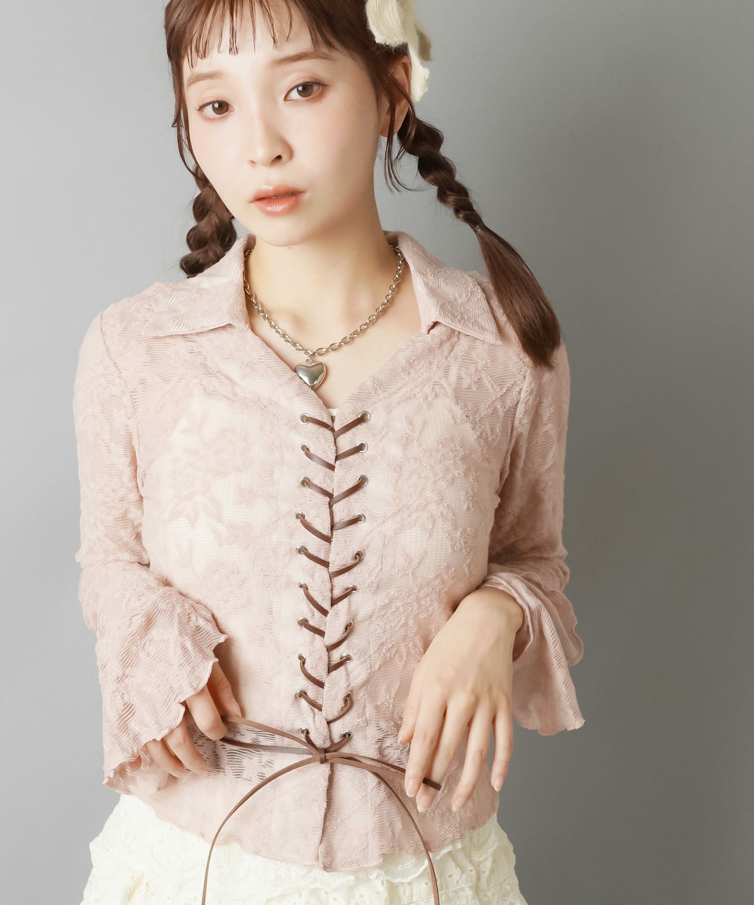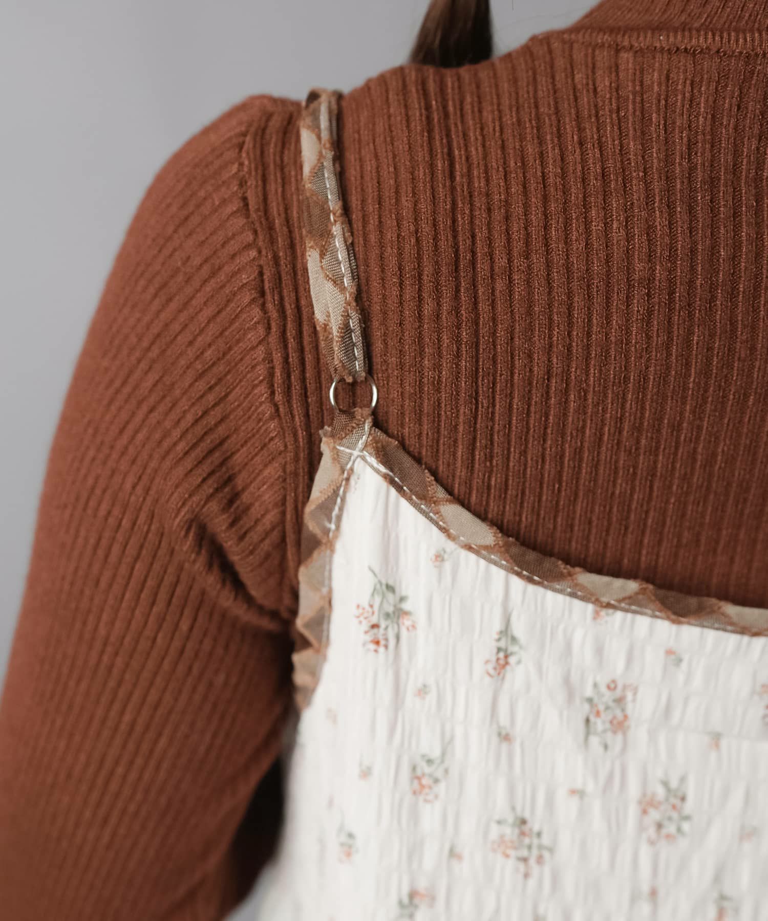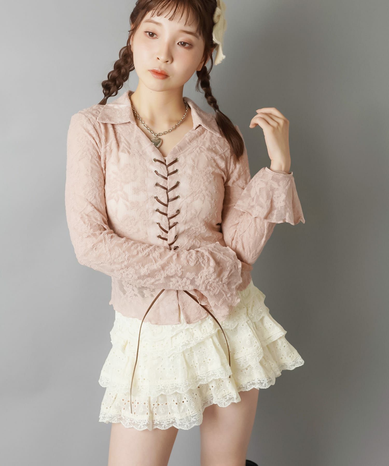 キャミソールレイヤード風長袖カットソー/レースアップ/#NEO森ガール