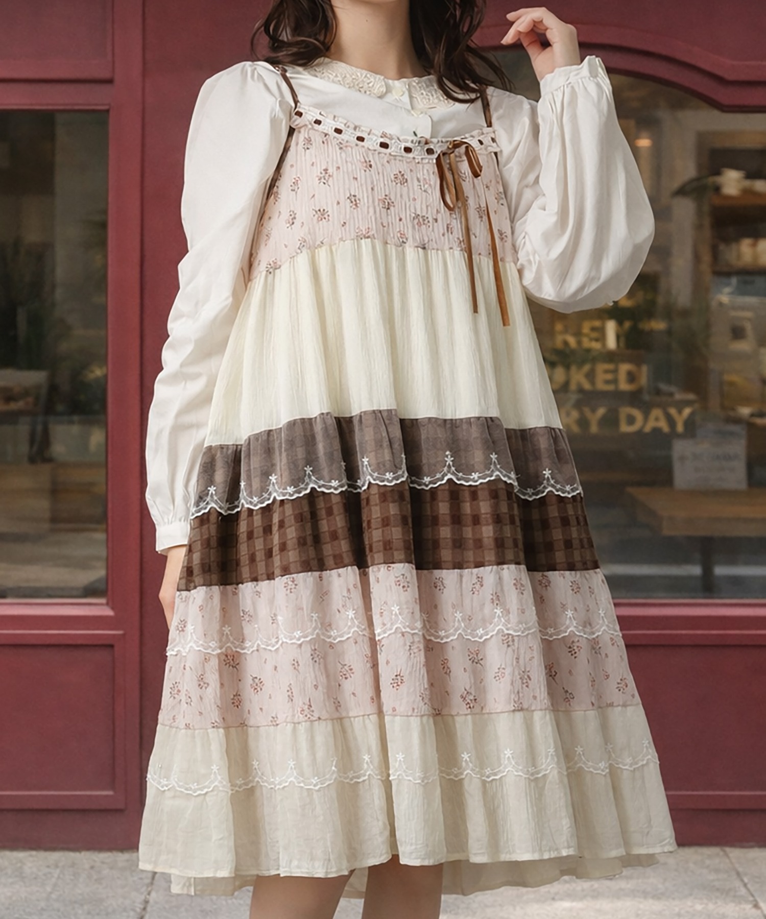 異素材のときめきをぎゅっと☆★ ヴィンテージ風ミニキャミワンピース/つぎはぎティアード/チェック/レース/全5色/#NEO森ガール