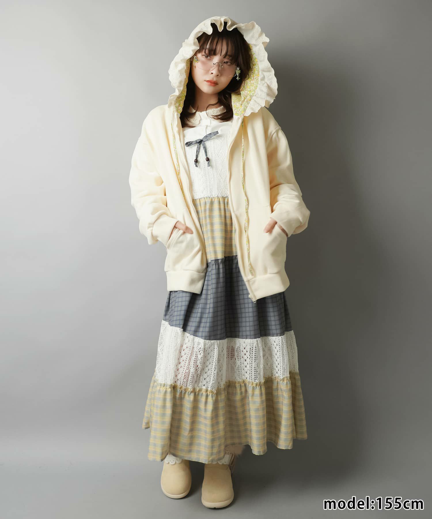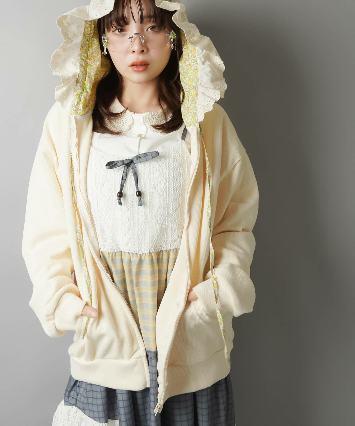 フード付きジップパーカー/花柄レース/#NEO森ガール