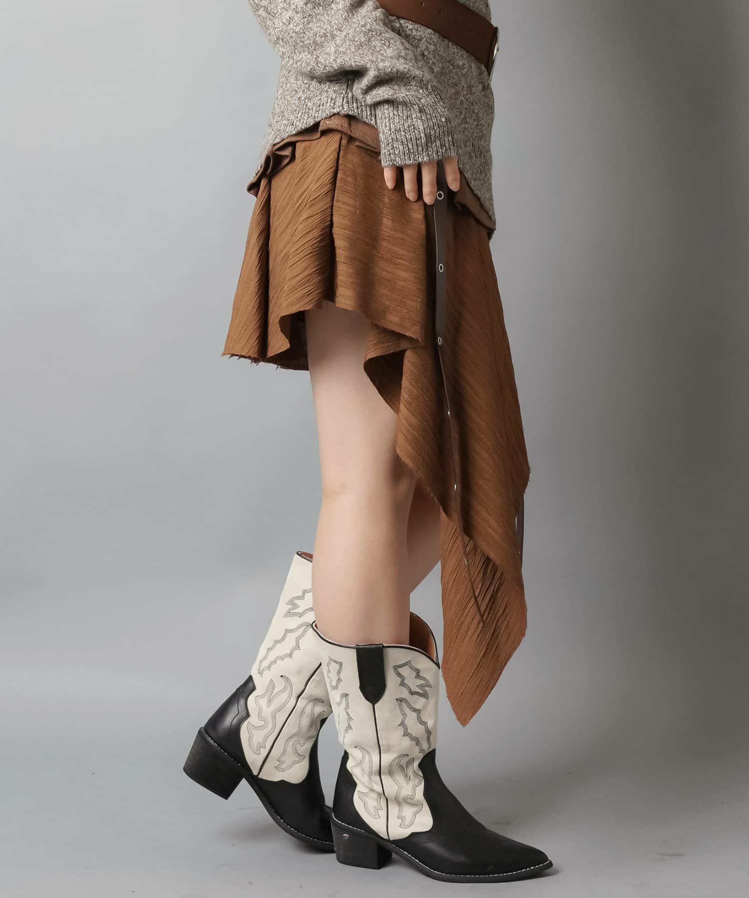 スカートにレギンスやタイツをレイヤードするのもポイント。