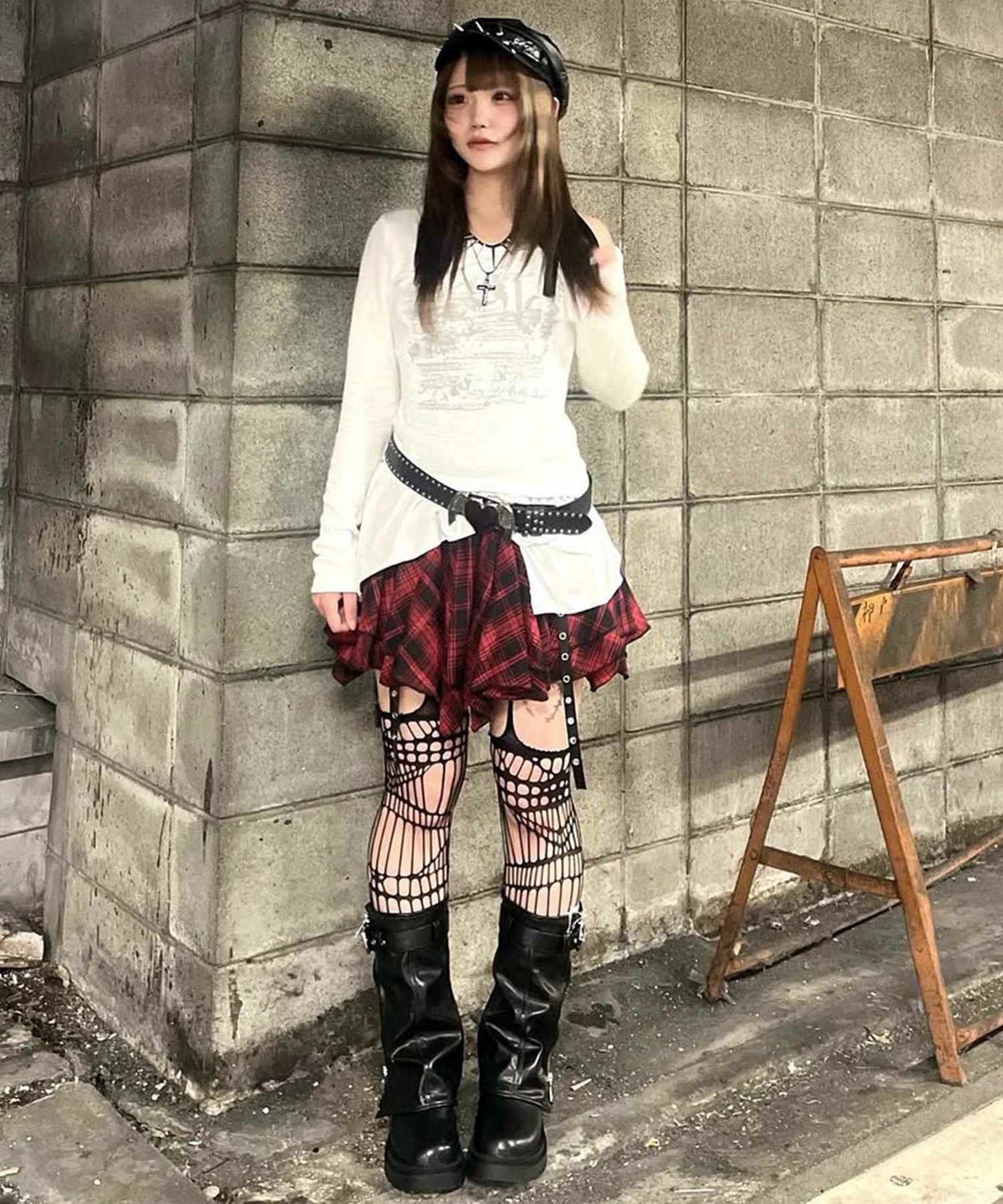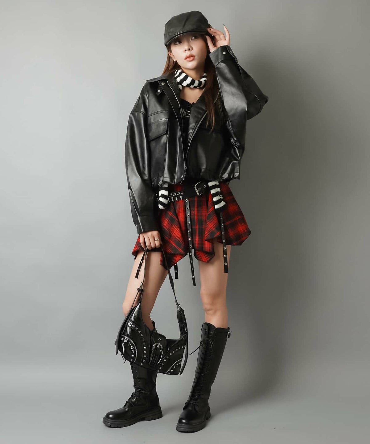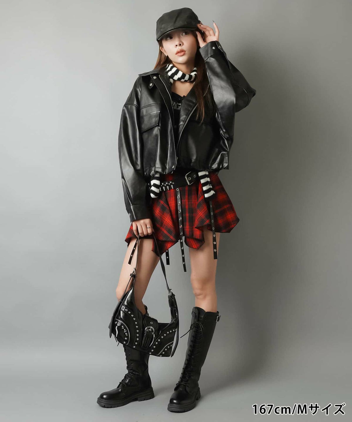 赤チェックワンピース、レザーミニスカート、ライダース