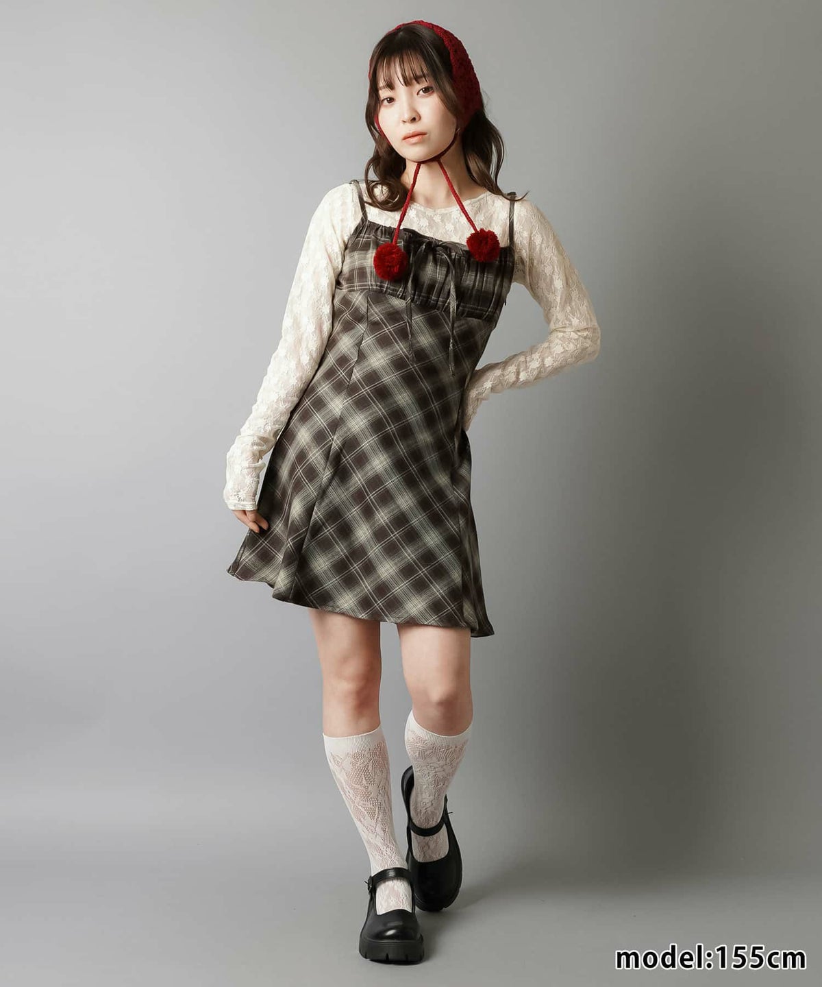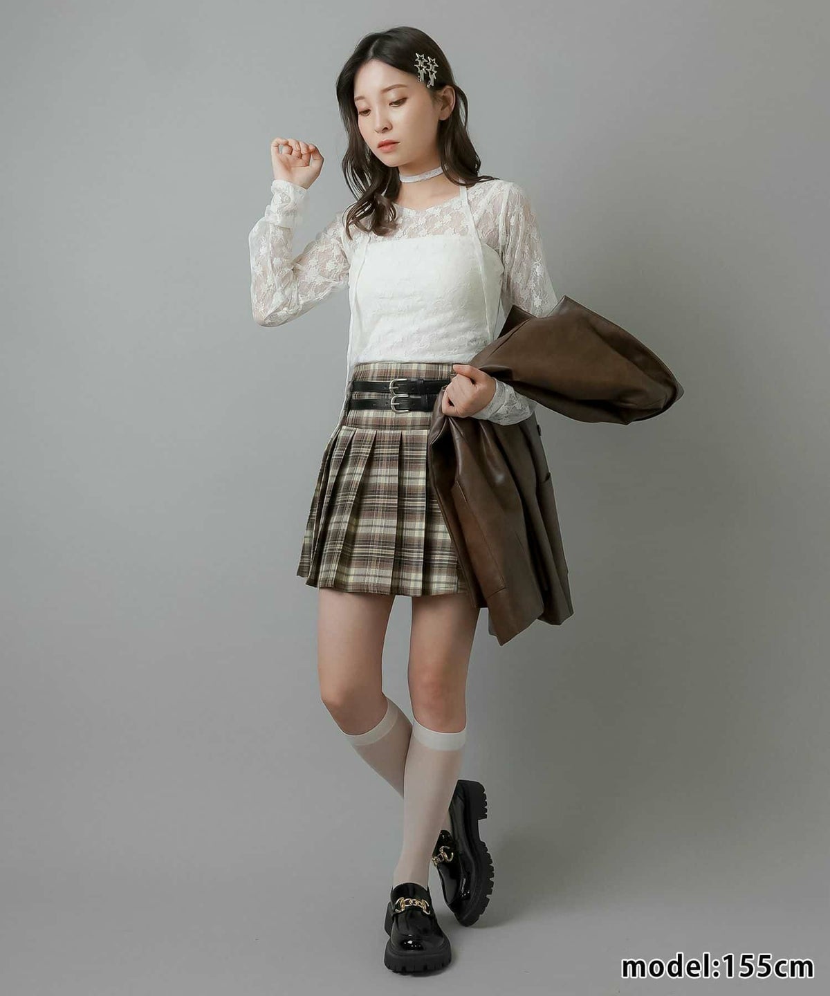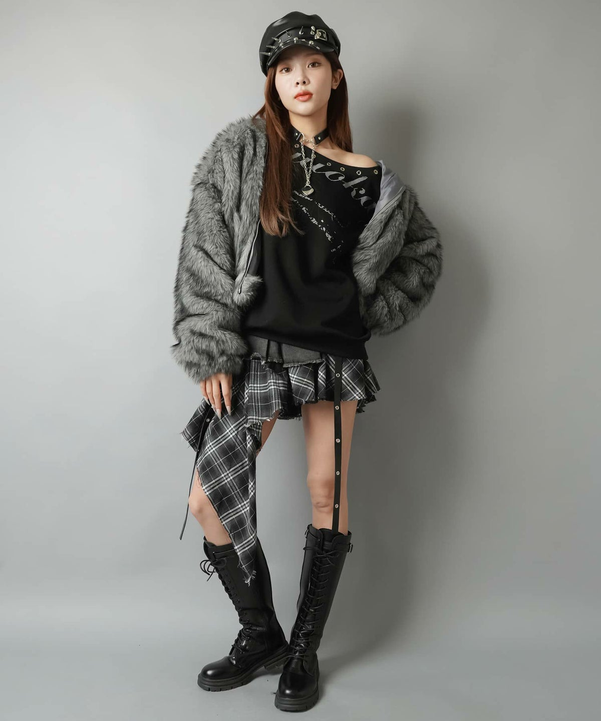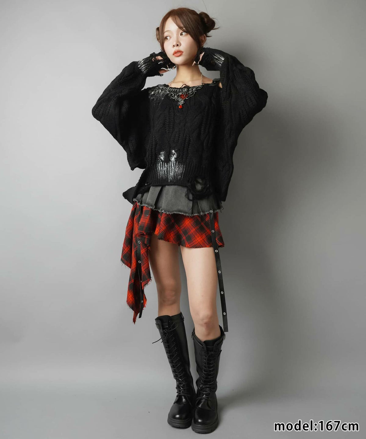 赤チェックワンピース、レザーミニスカート、ライダース