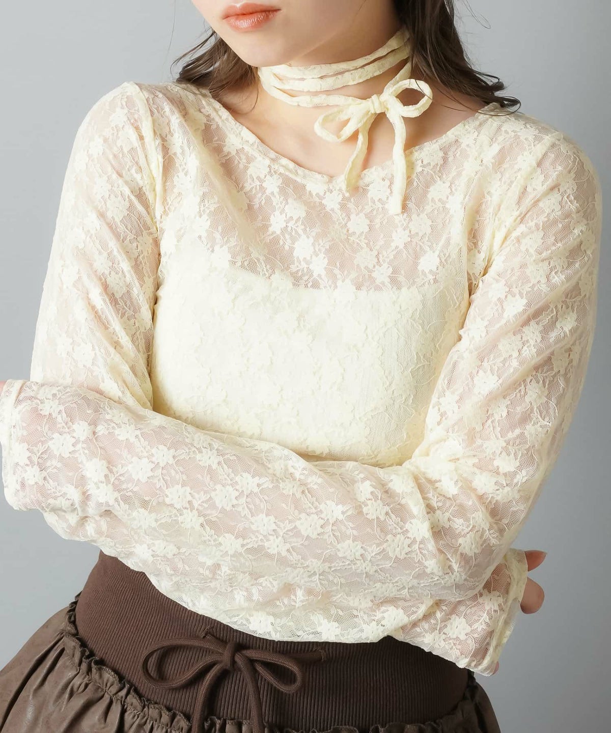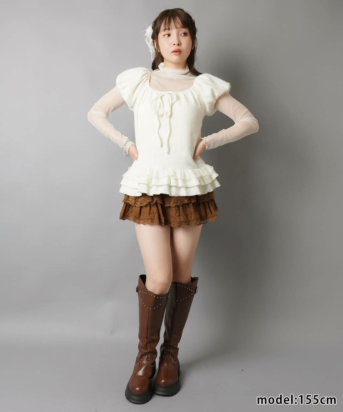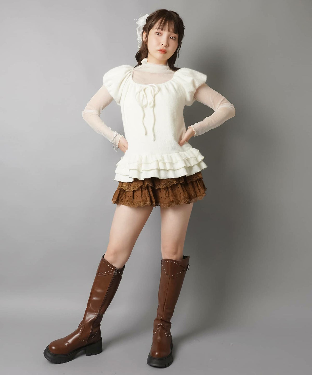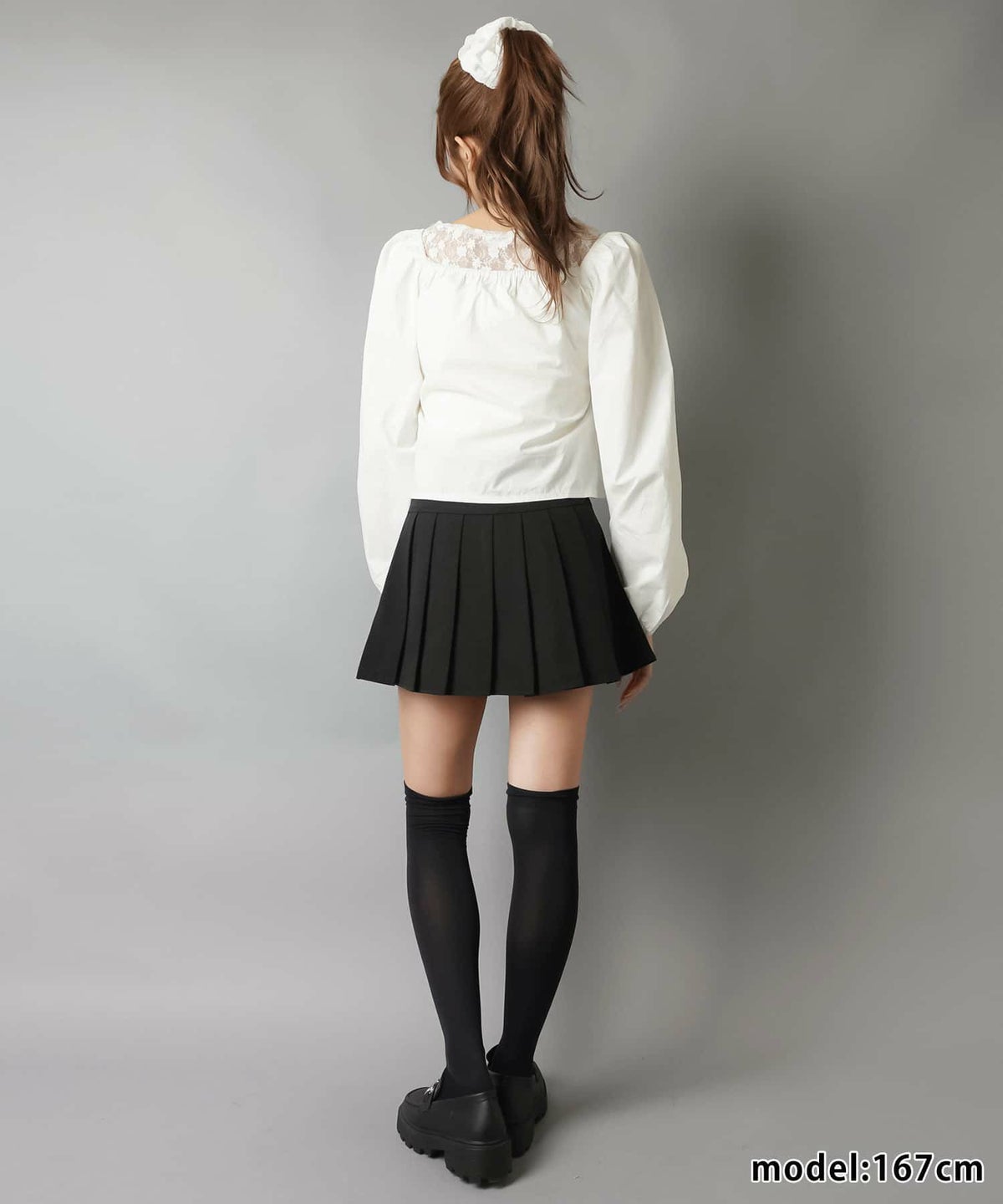 パフ袖ブラウス+ピタニット、ブラウス+スカーフ首巻き、