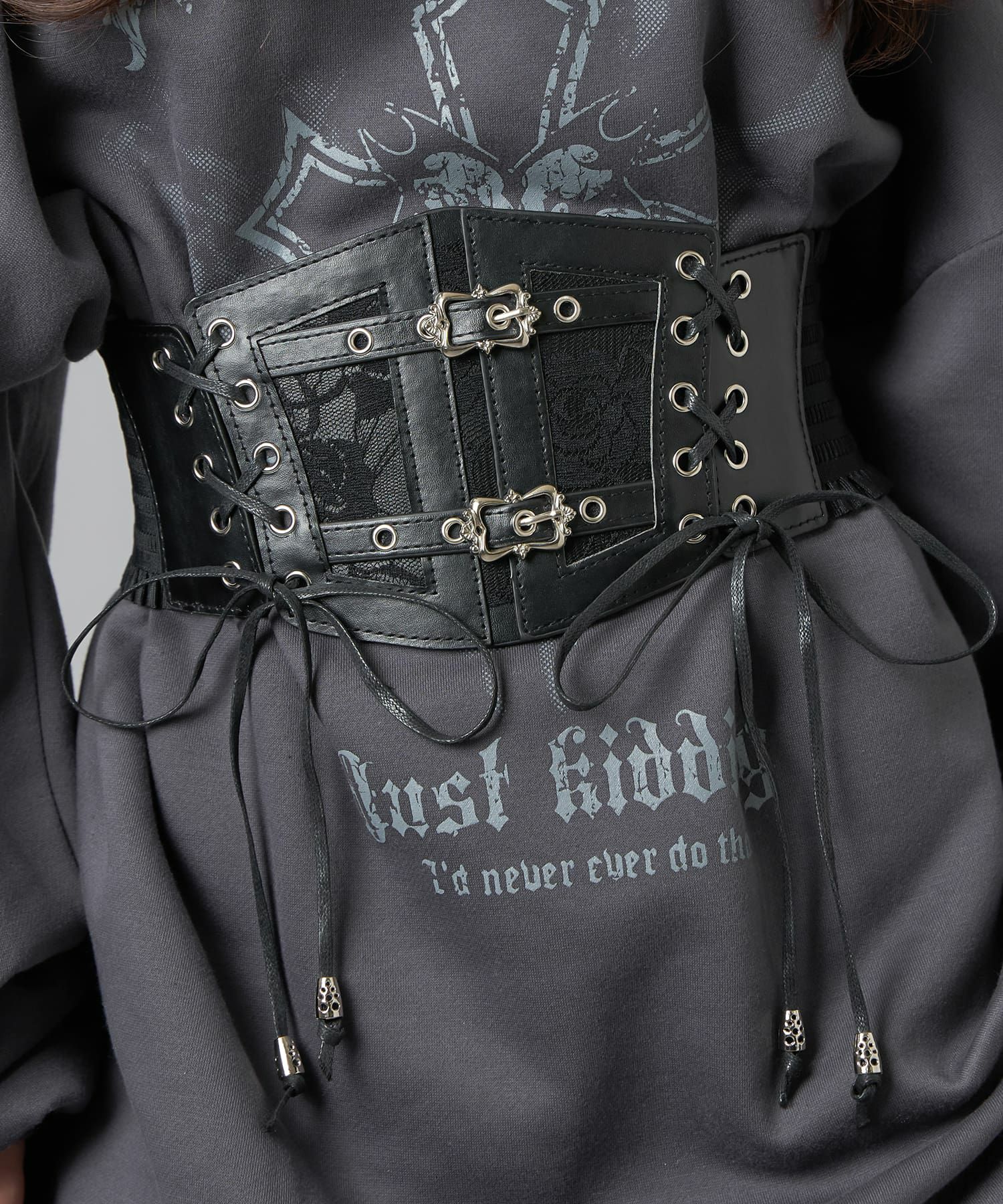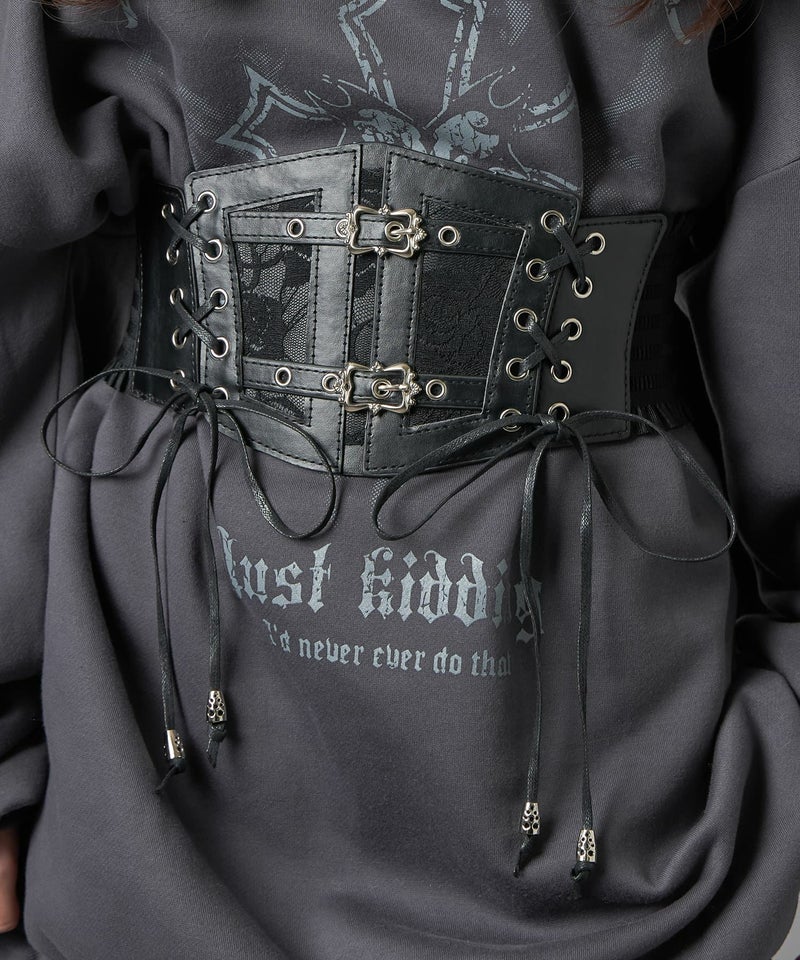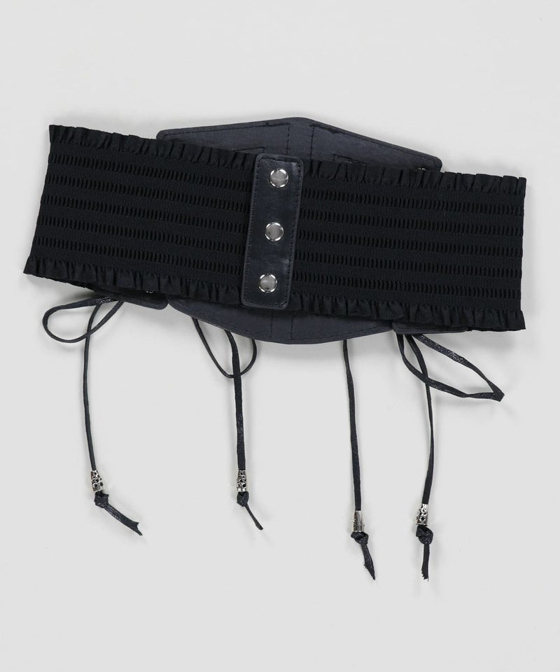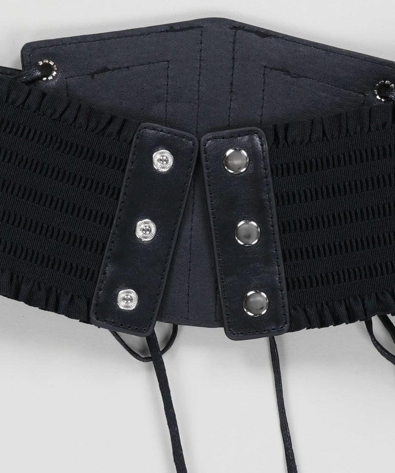 シンプルな腰回りを上品に演出するフェイクレザーコルセット。
