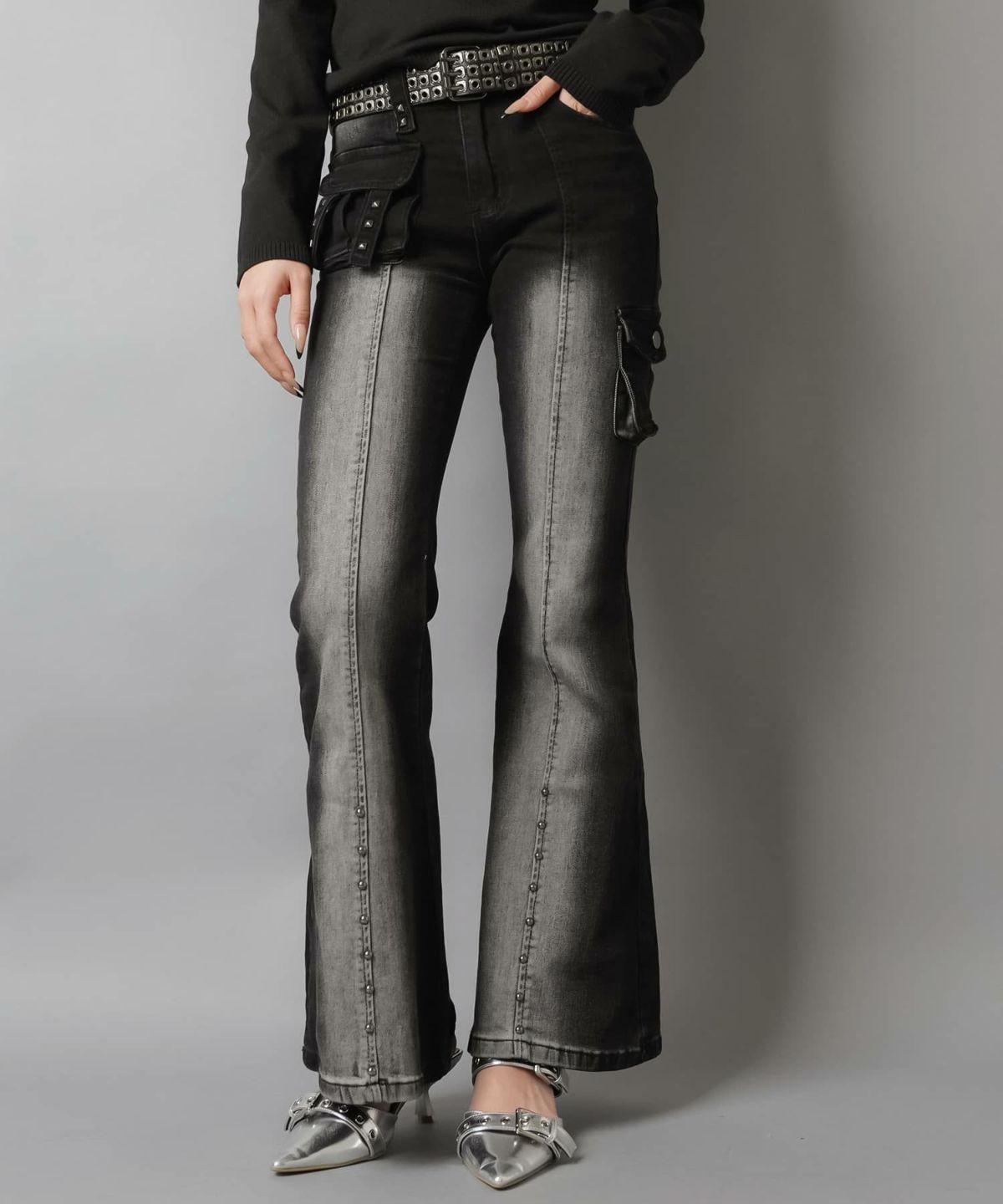 スタッズ付きデニムフレアパンツ/2ポケット/カモ柄/迷彩/#平成ギャル