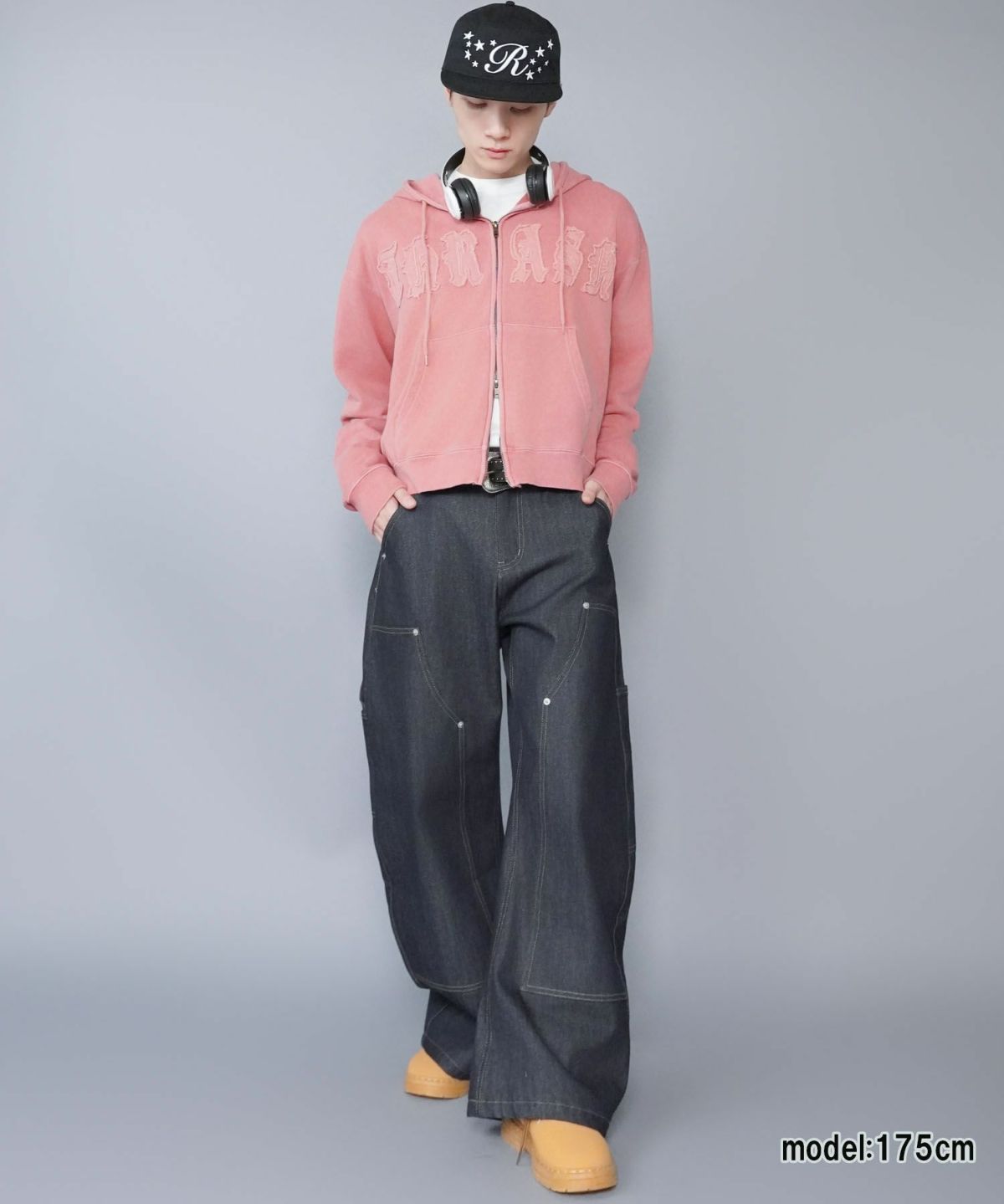 短丈ダブルジップパーカー/ストーンロゴ/バックプリント/スパイダーグラフィック/ショート丈