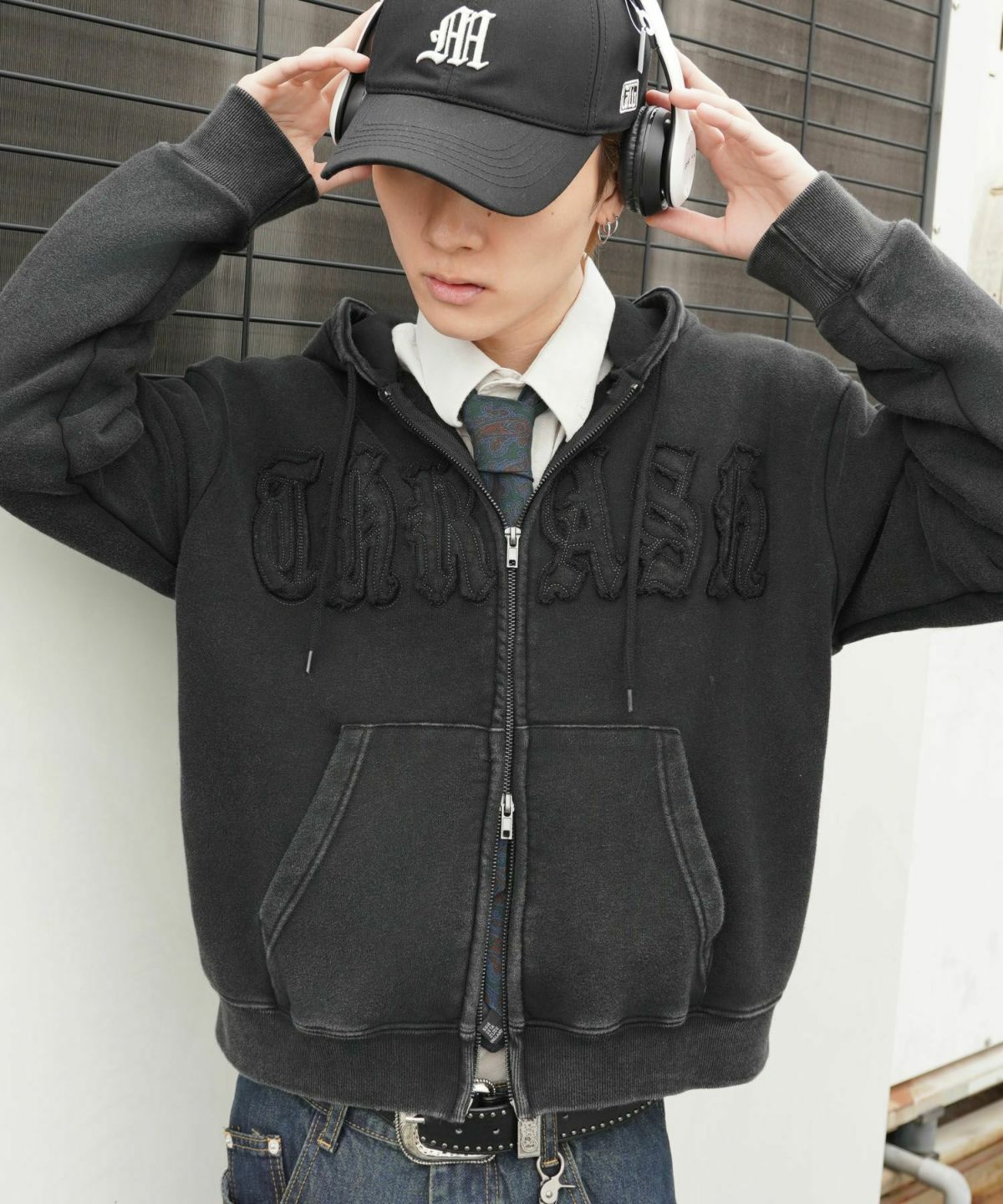 短丈ダブルジップパーカー/グランジ/刺繍袖ロゴ/ショート丈