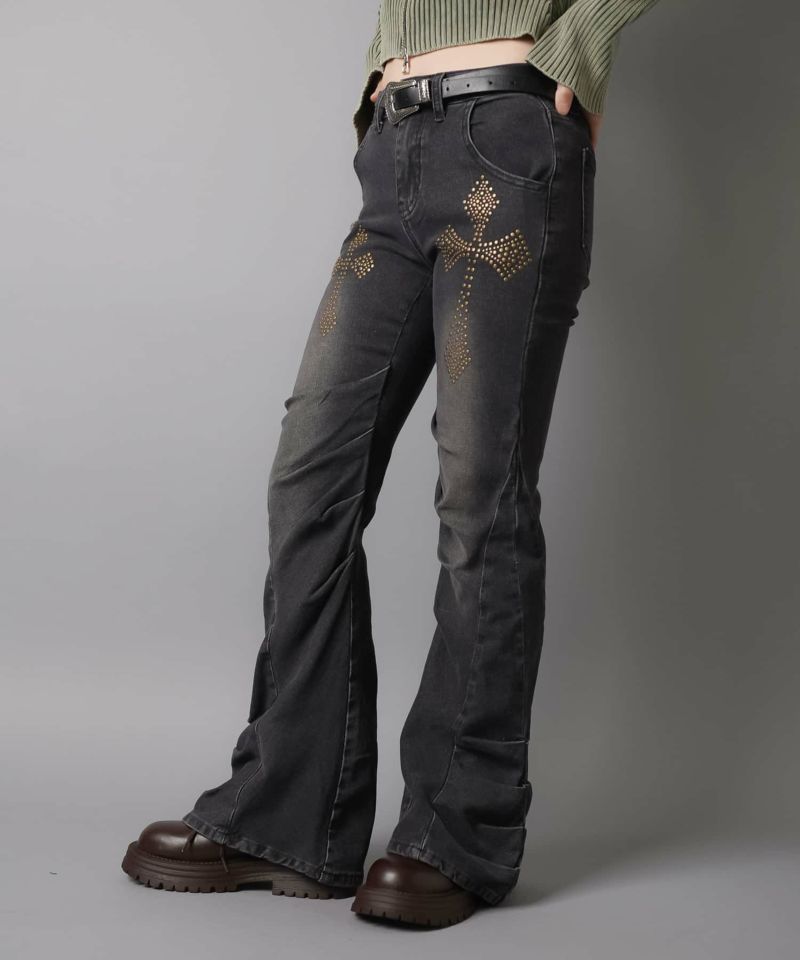 【ギャルがリバイバル⁉クロススタッズが目を惹くギャルっぽ☆なギャザーデニムパンツ】