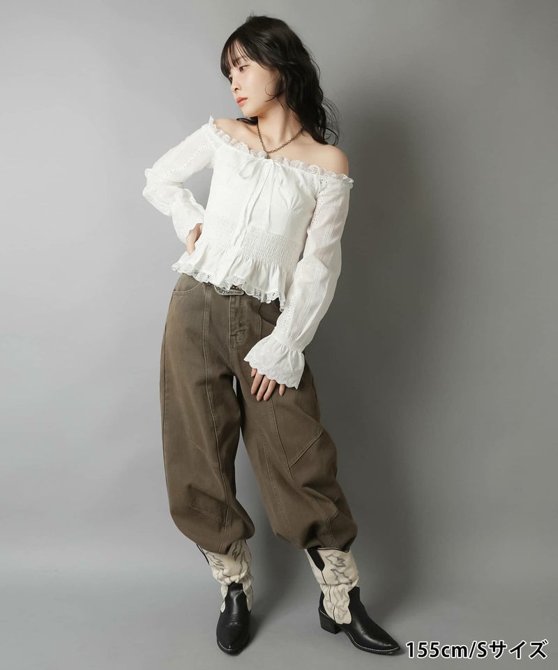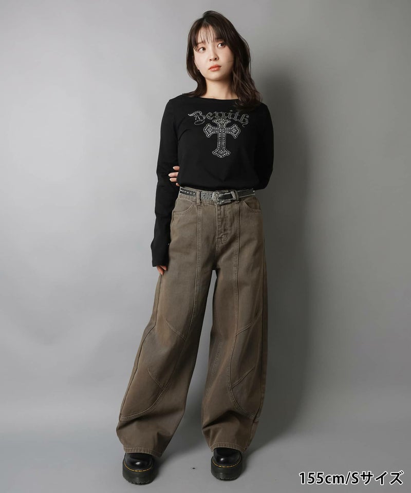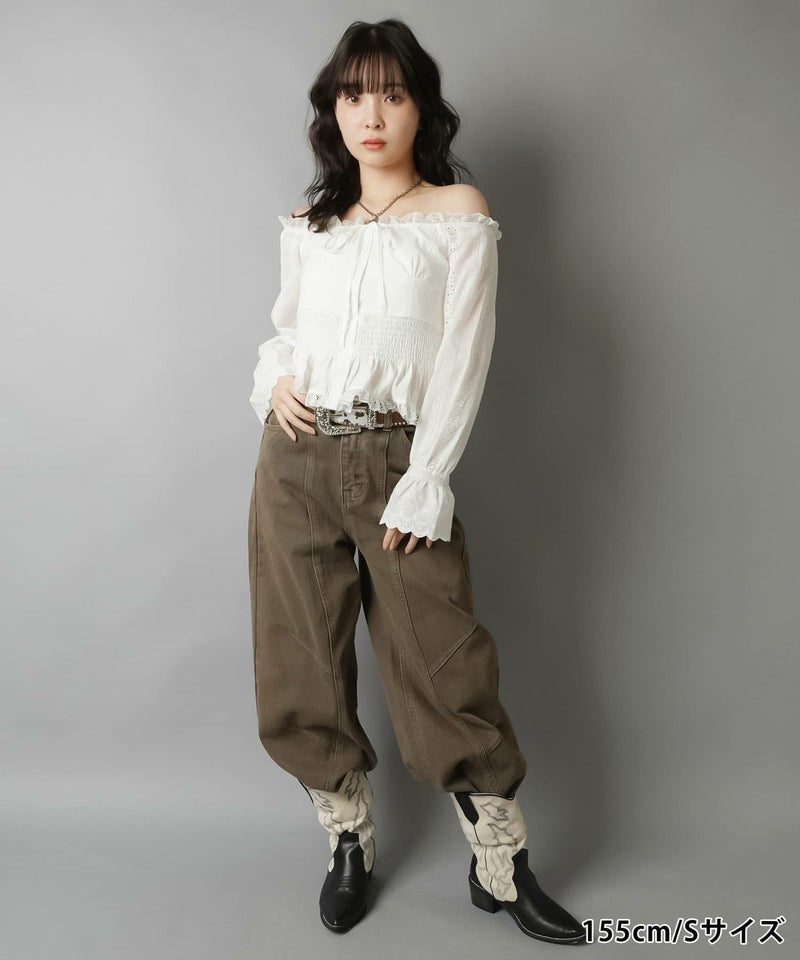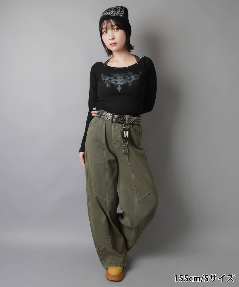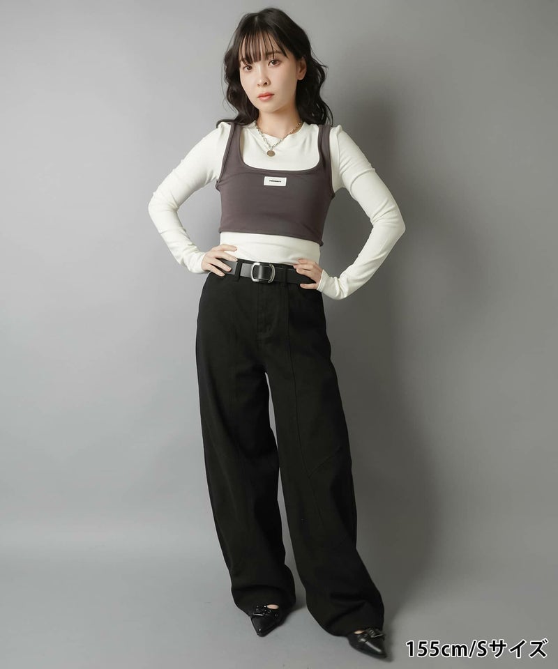 2:裾に溜まるボリューム感があるパンツでタイトなトップスとの相性抜群