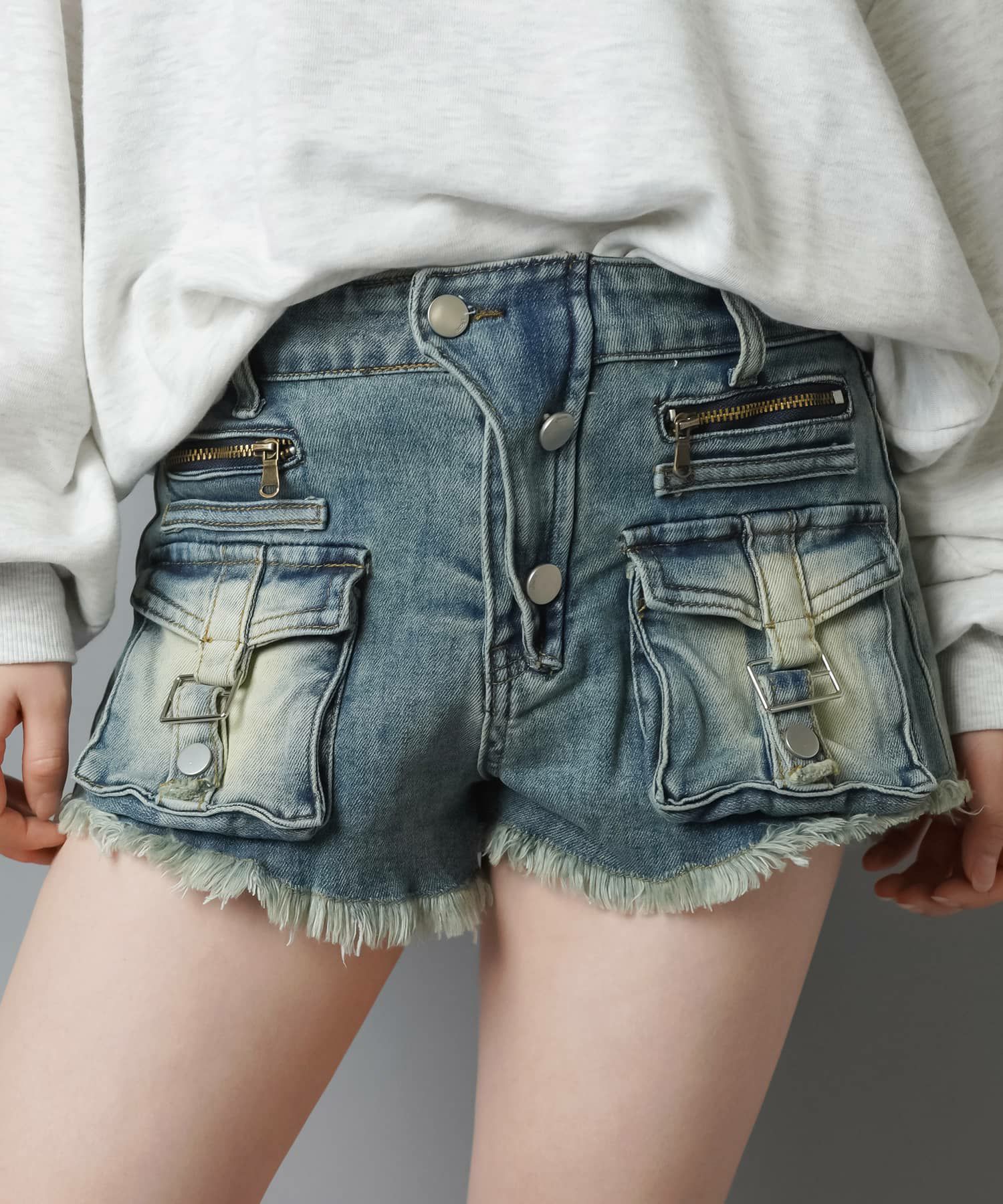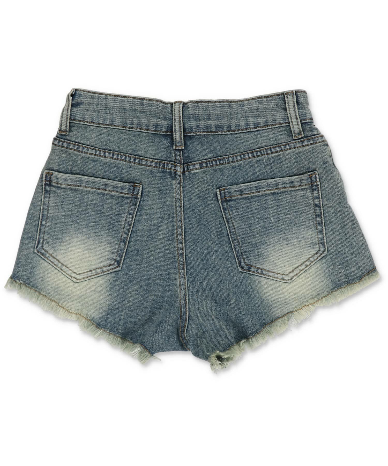 2サイズ展開 デニムショートパンツ/ポケットベルト/フリンジオーバーダイ
