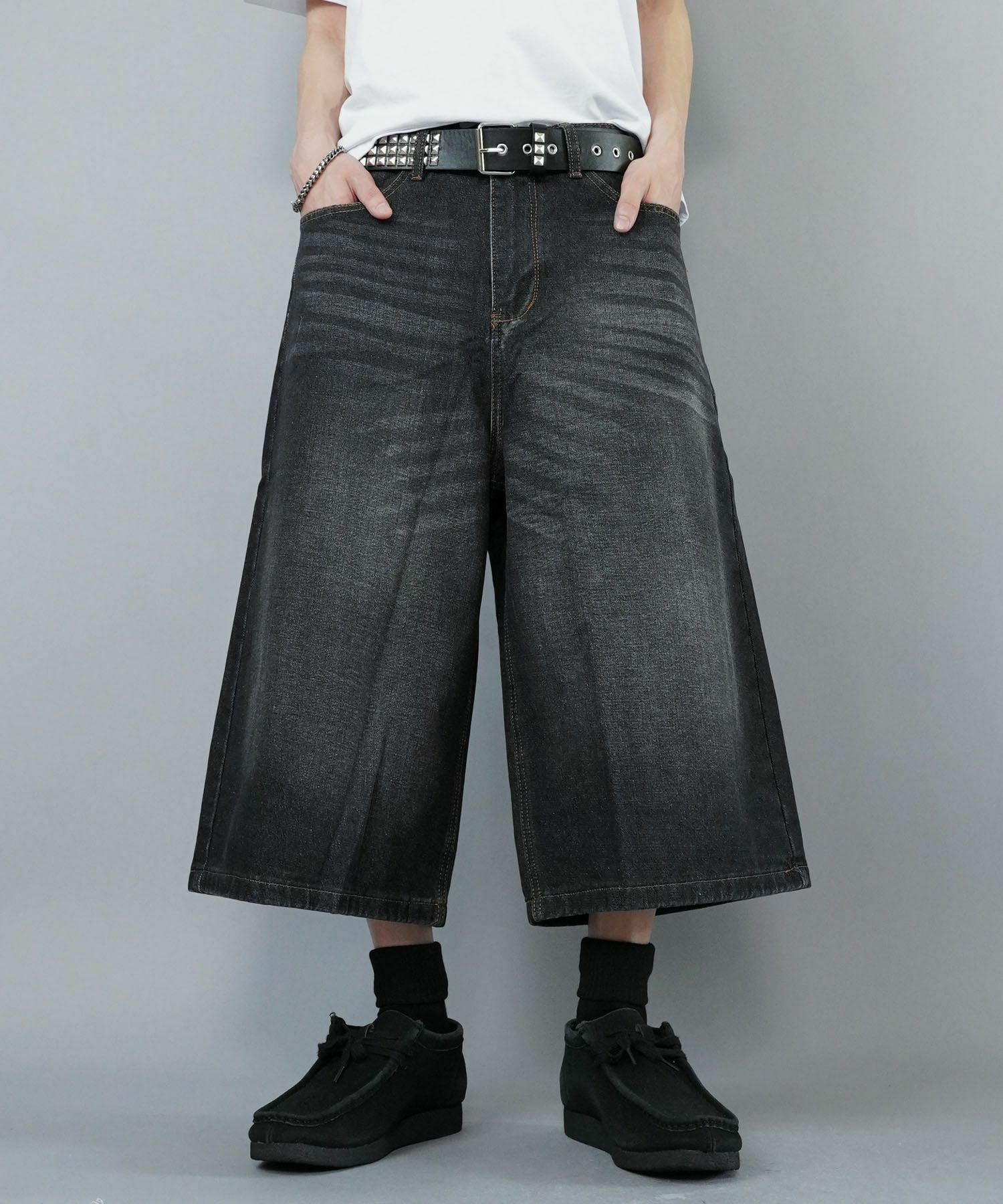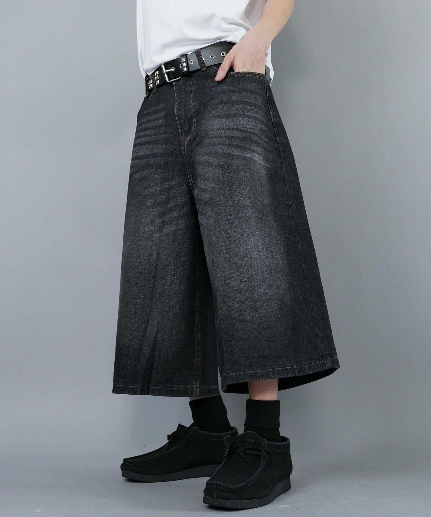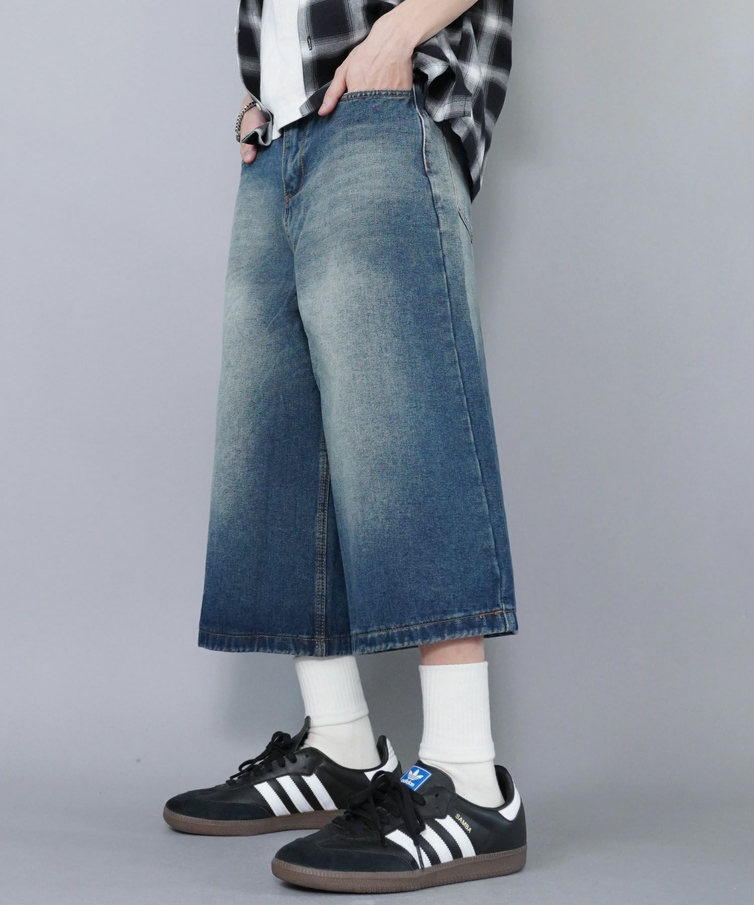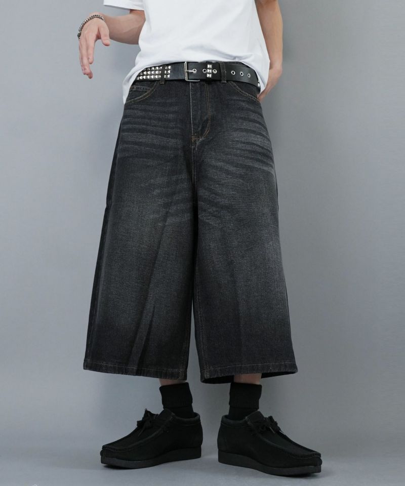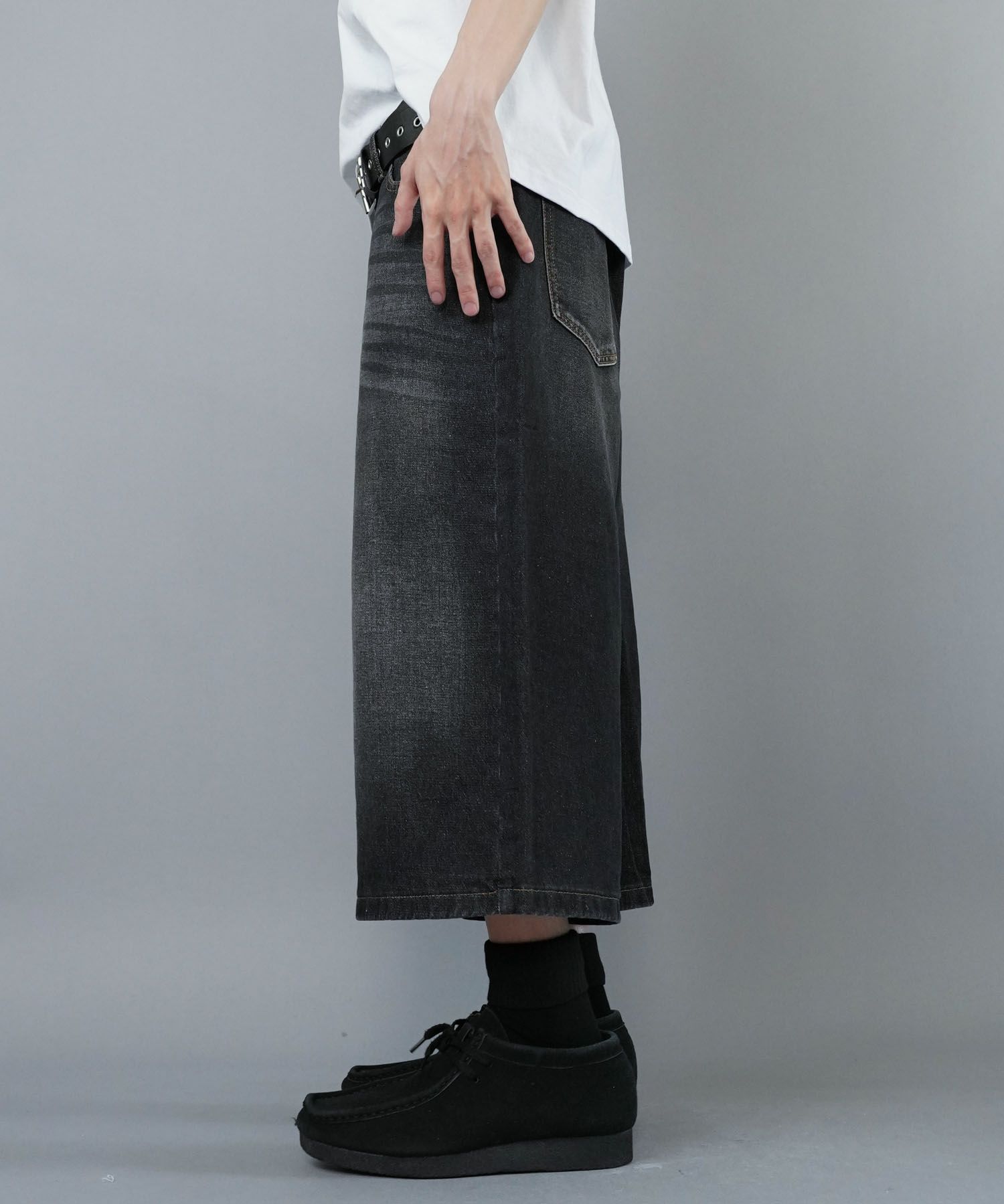 膝下丈デニムハーフパンツ。