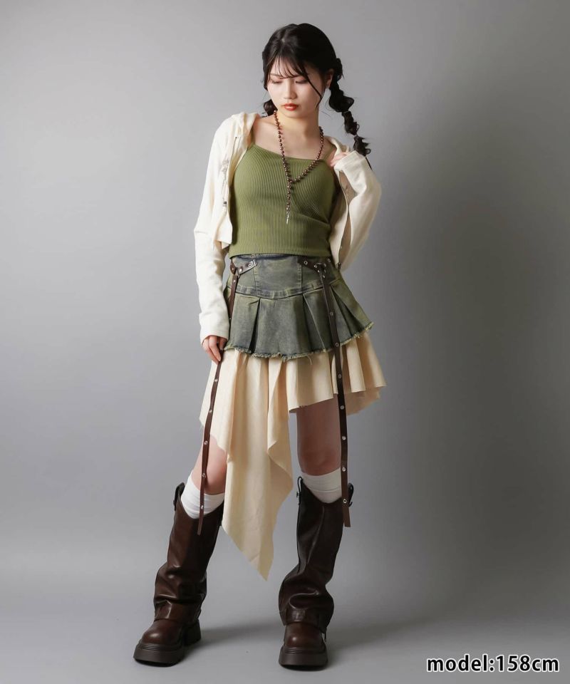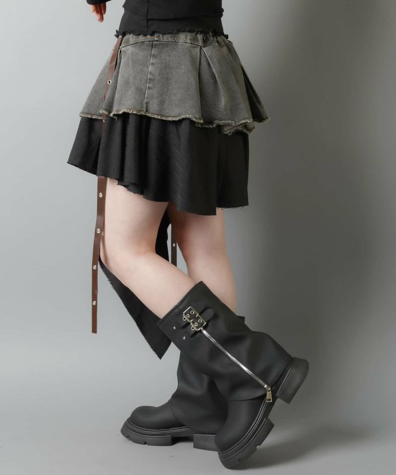 デニム×フリルの異素材を組み合わせた、着るだけで主役級のレイヤード風スカート。