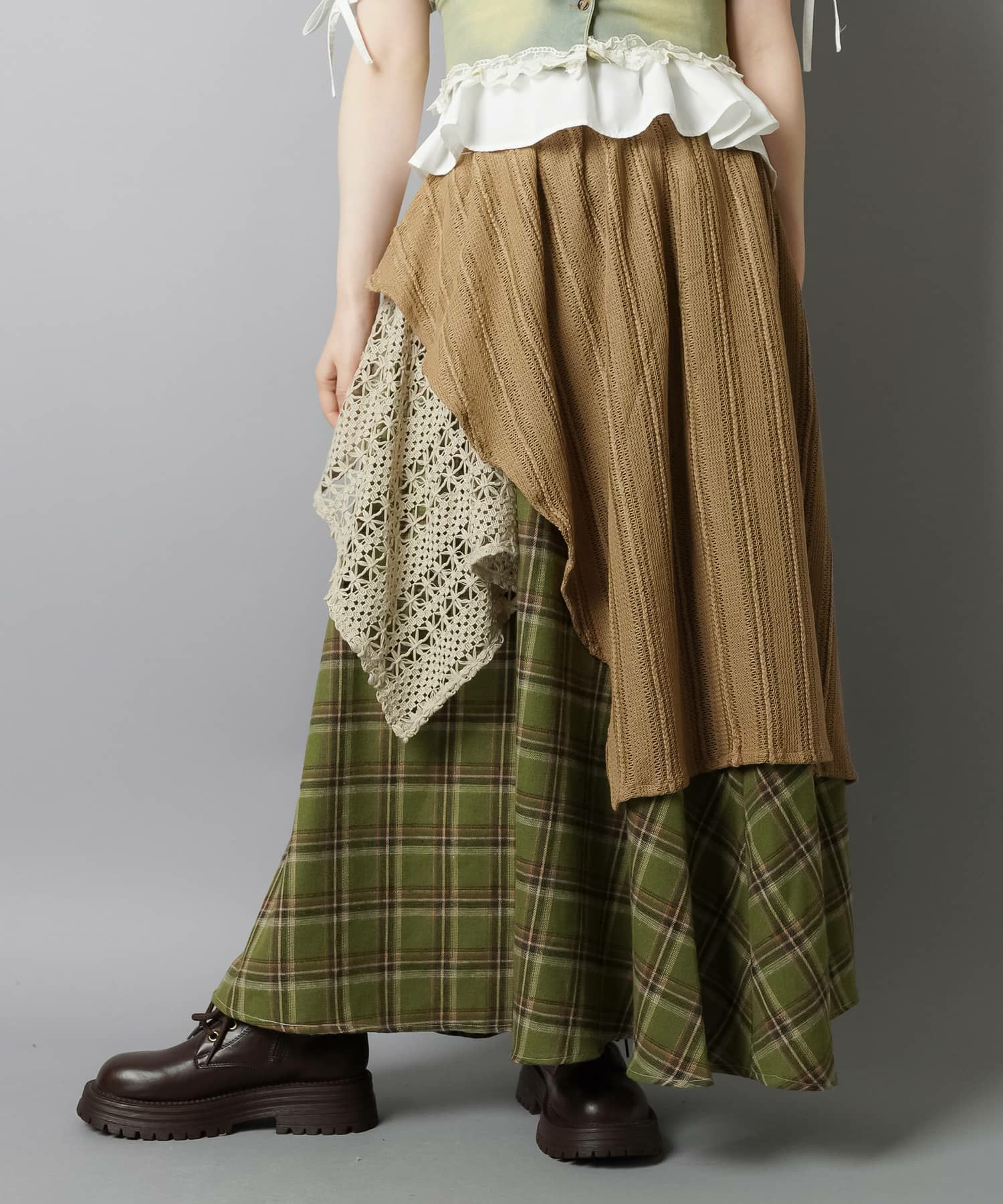 スカートにレギンスやタイツをレイヤードするのもポイント。