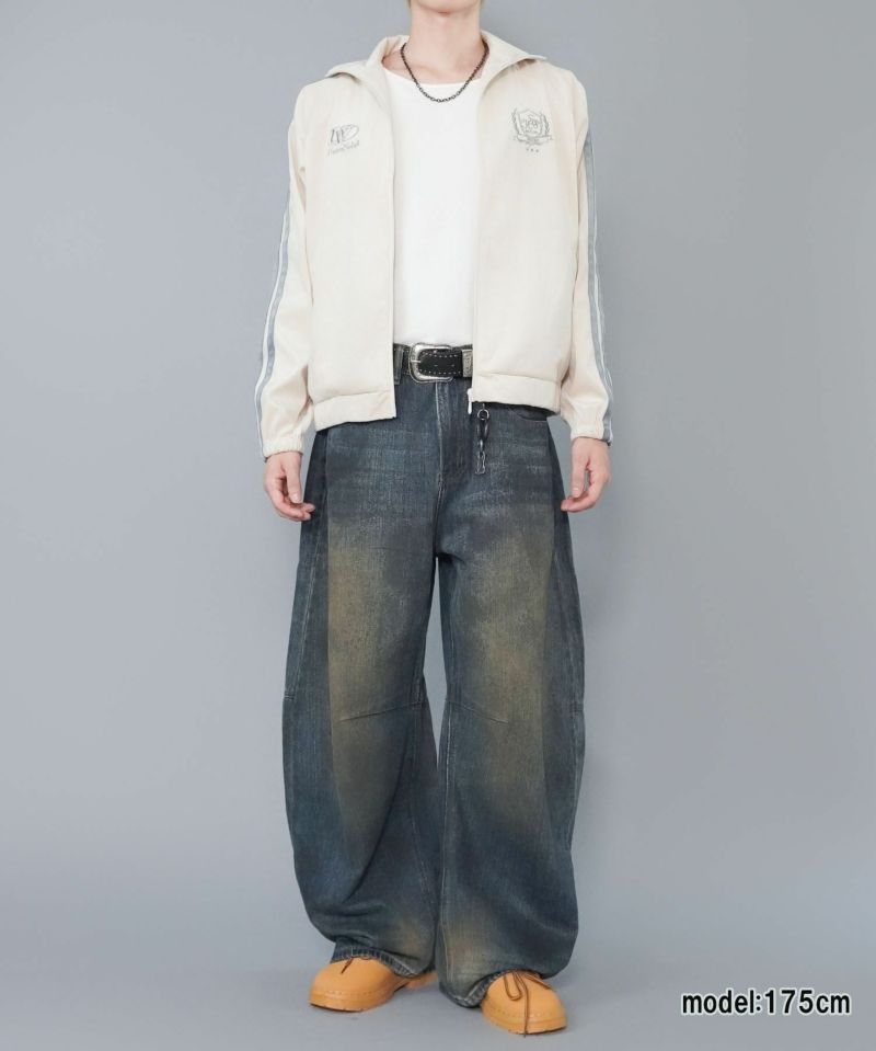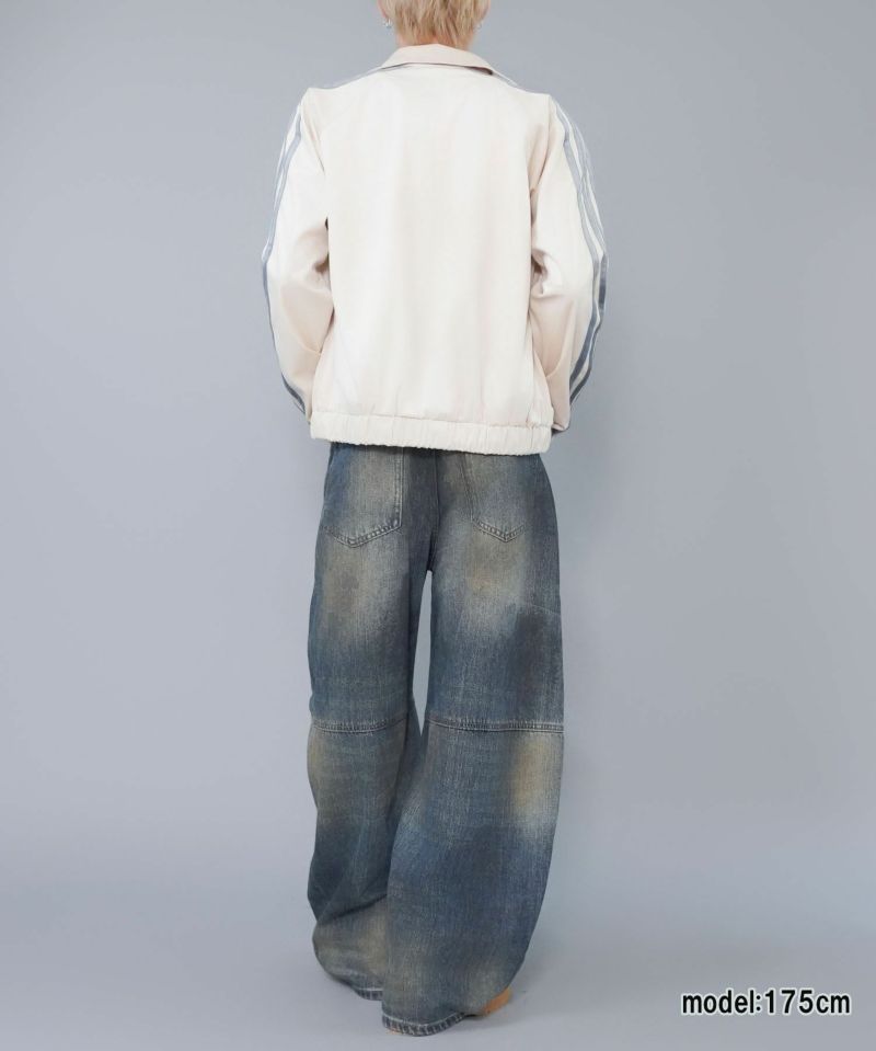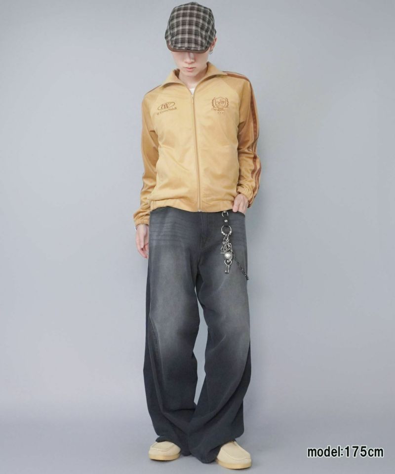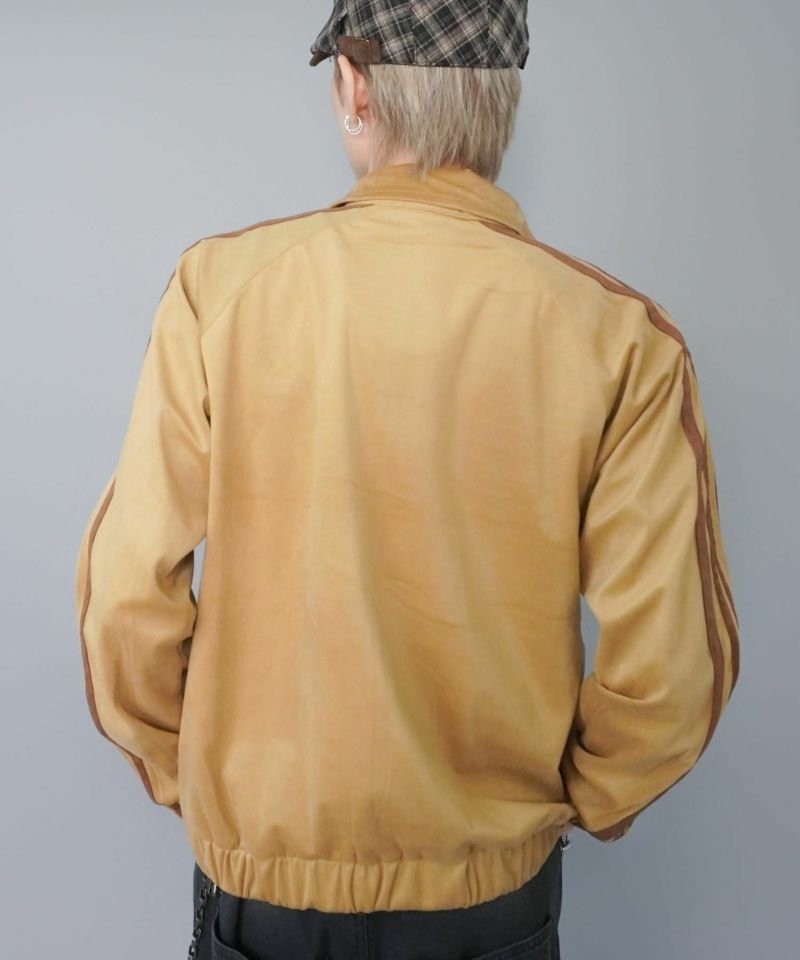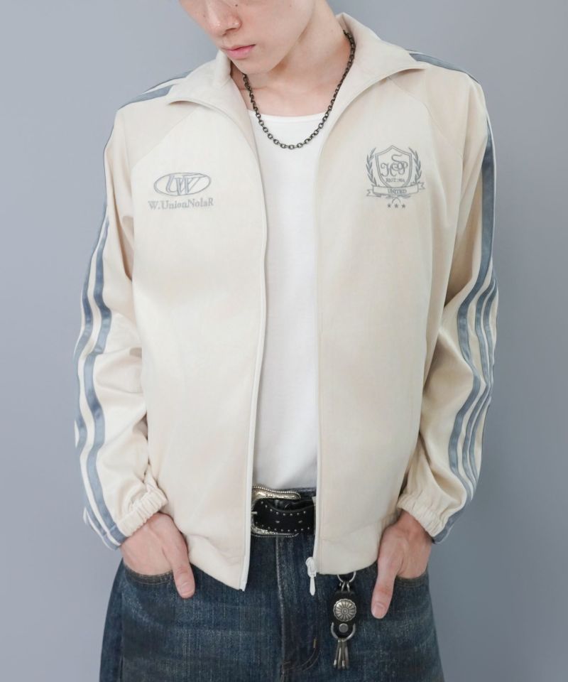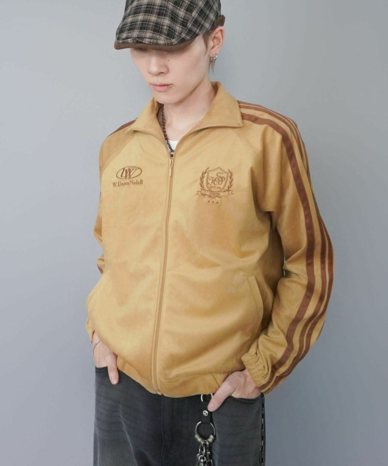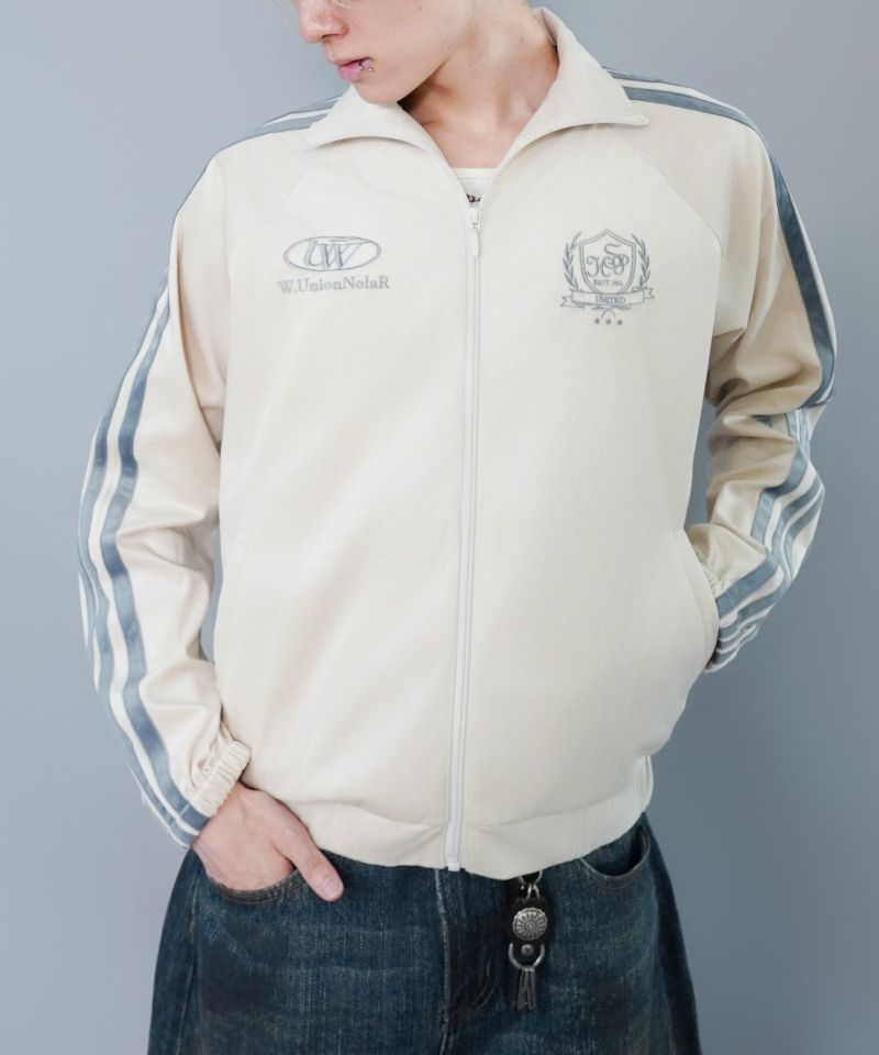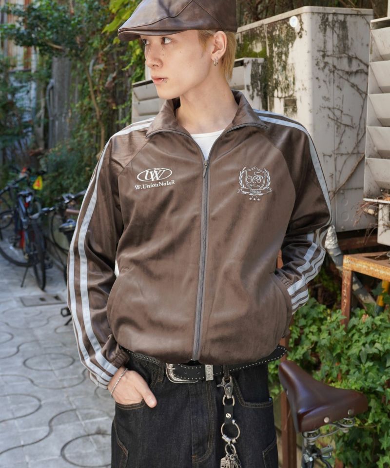 短丈ベロアトラックジャケット/エンブレム刺繍ロゴ/ジャージ風デザイン/ライン入り