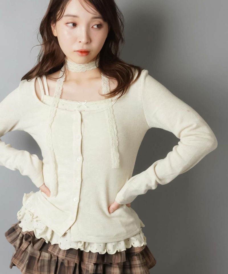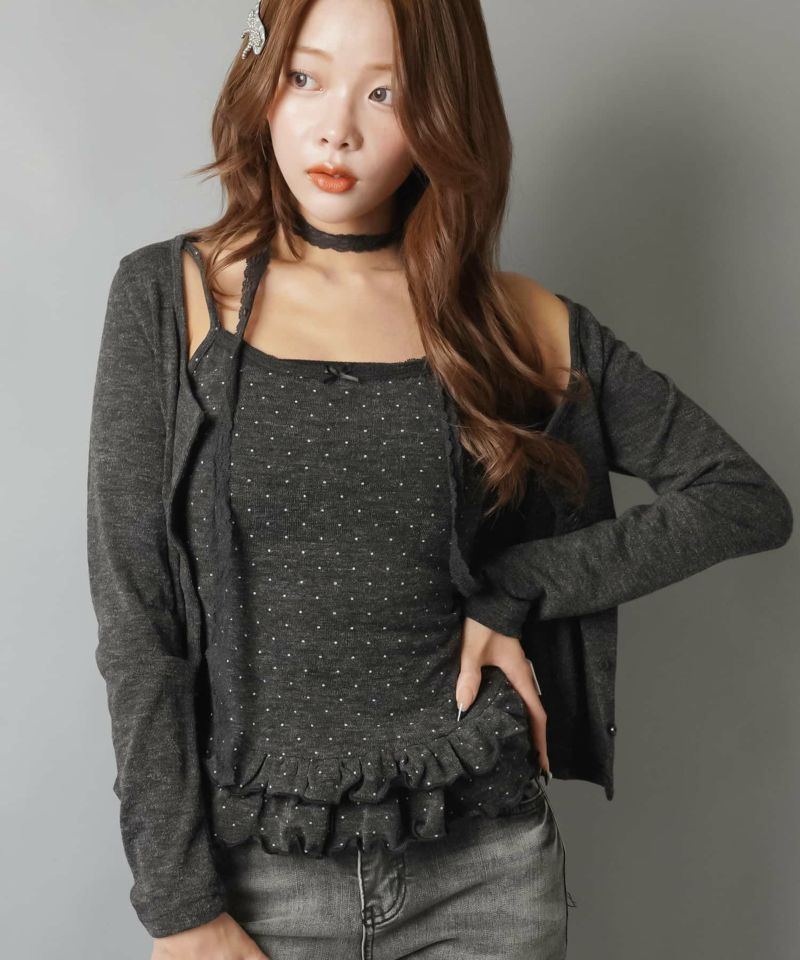 カーディガン+ドットキャミソール+レースタイ3点セット/裾フリル