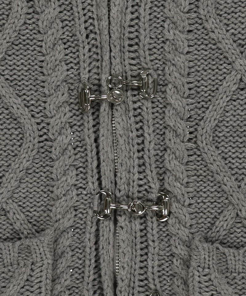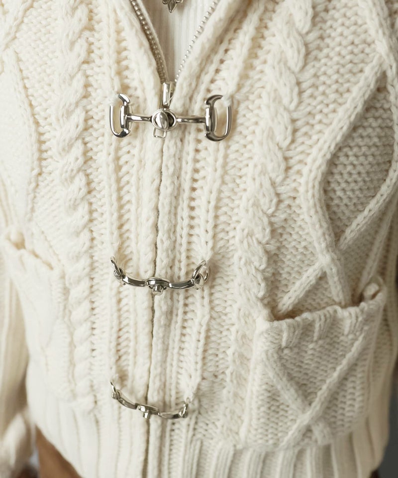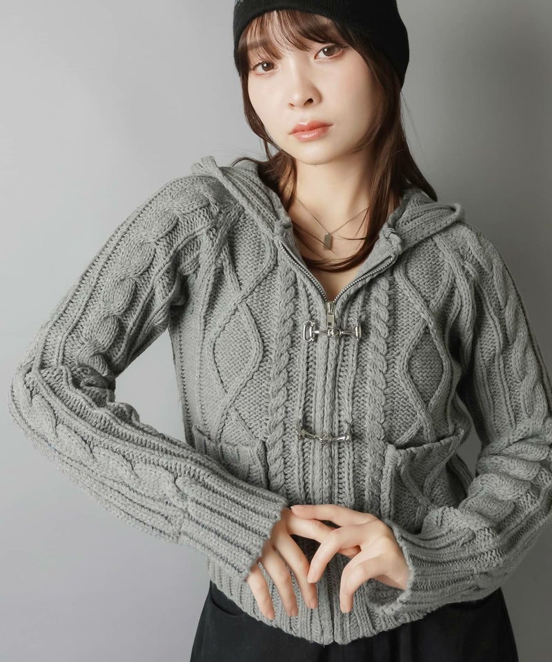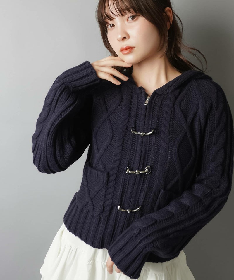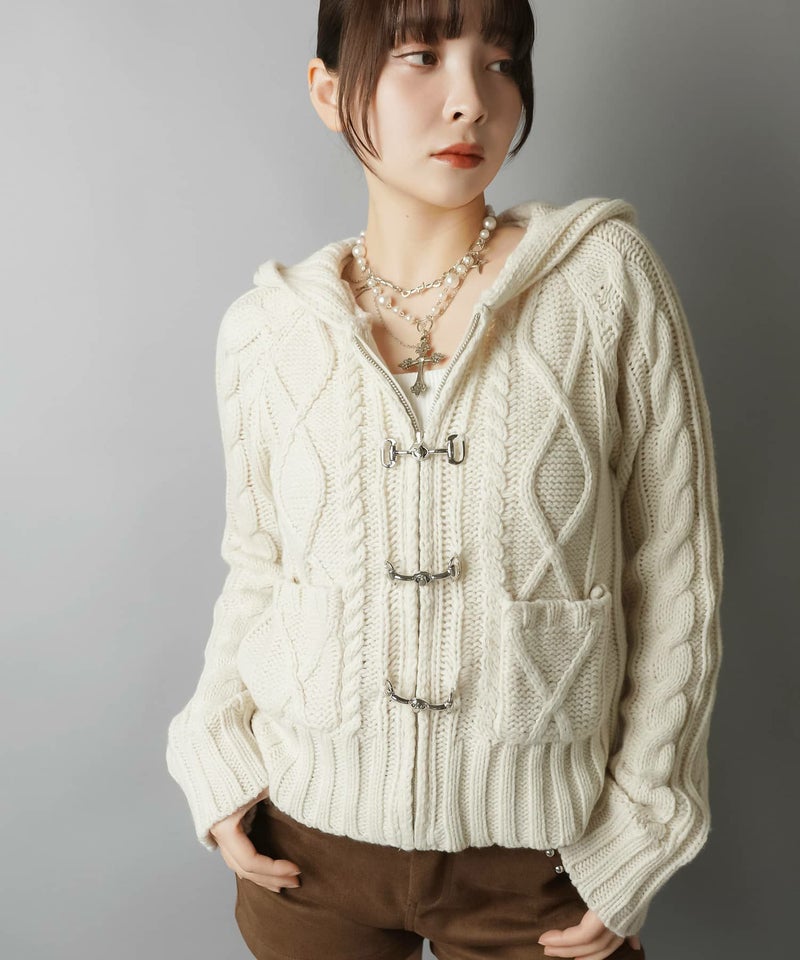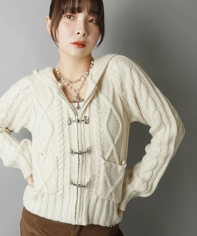 古着感のあるベルトボタンデザインがポイントの、フード付きWジップニットカーディガン。