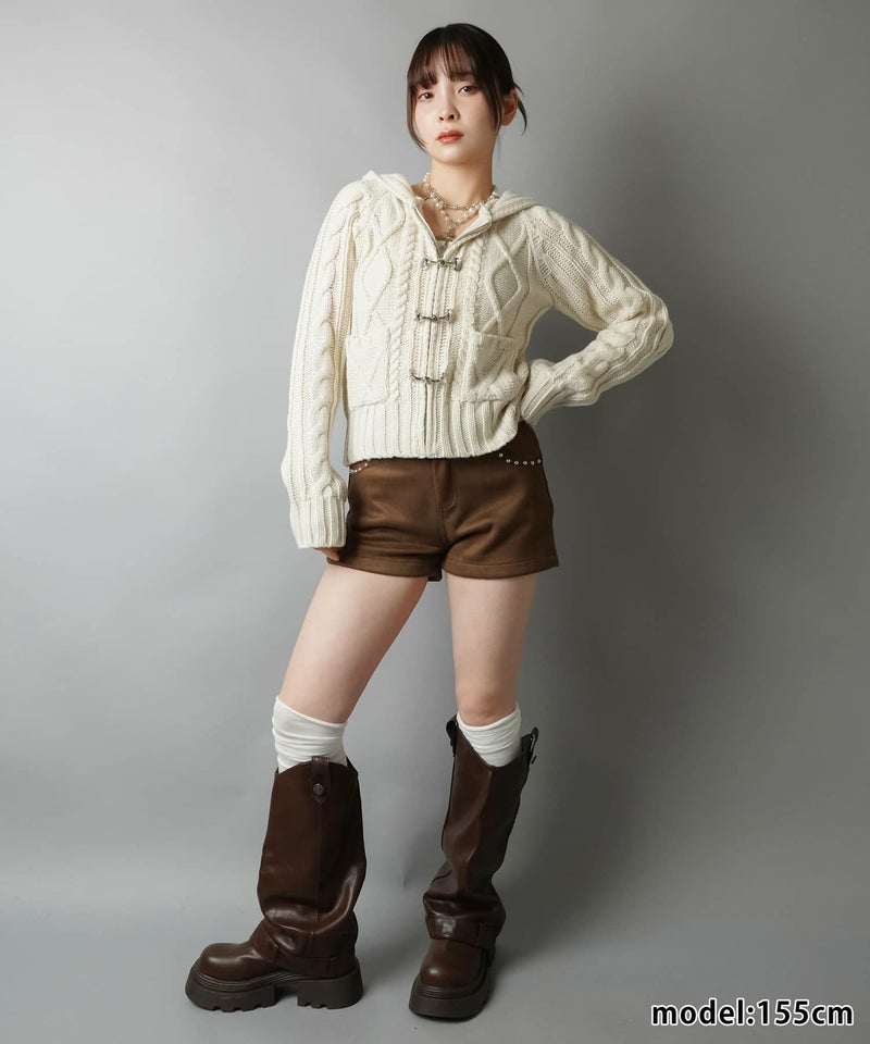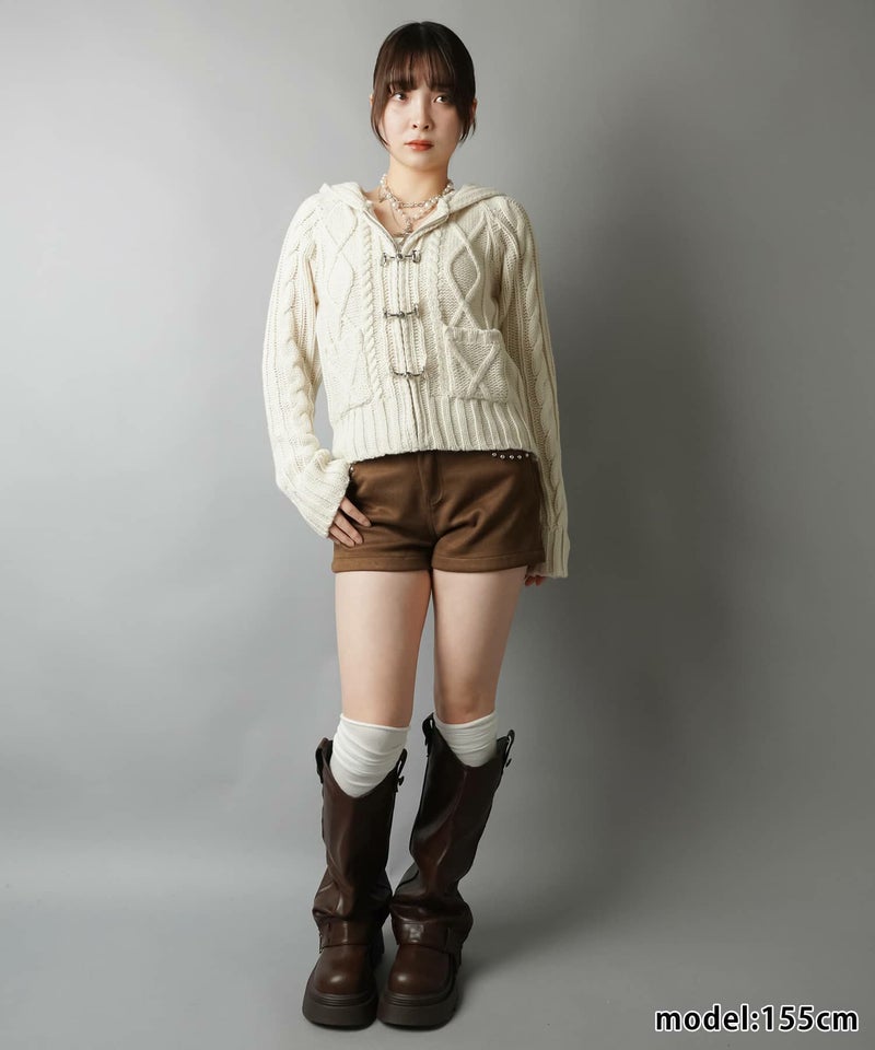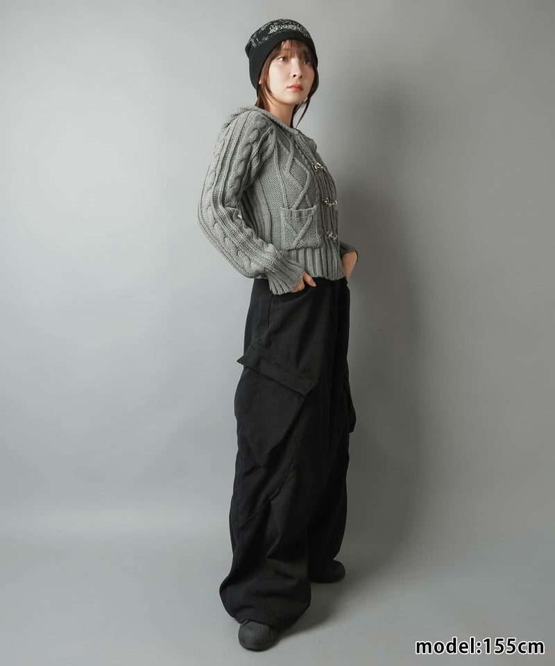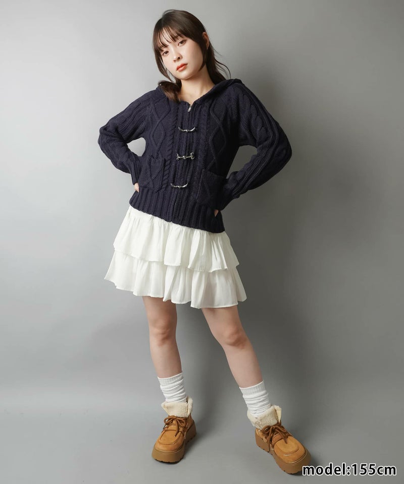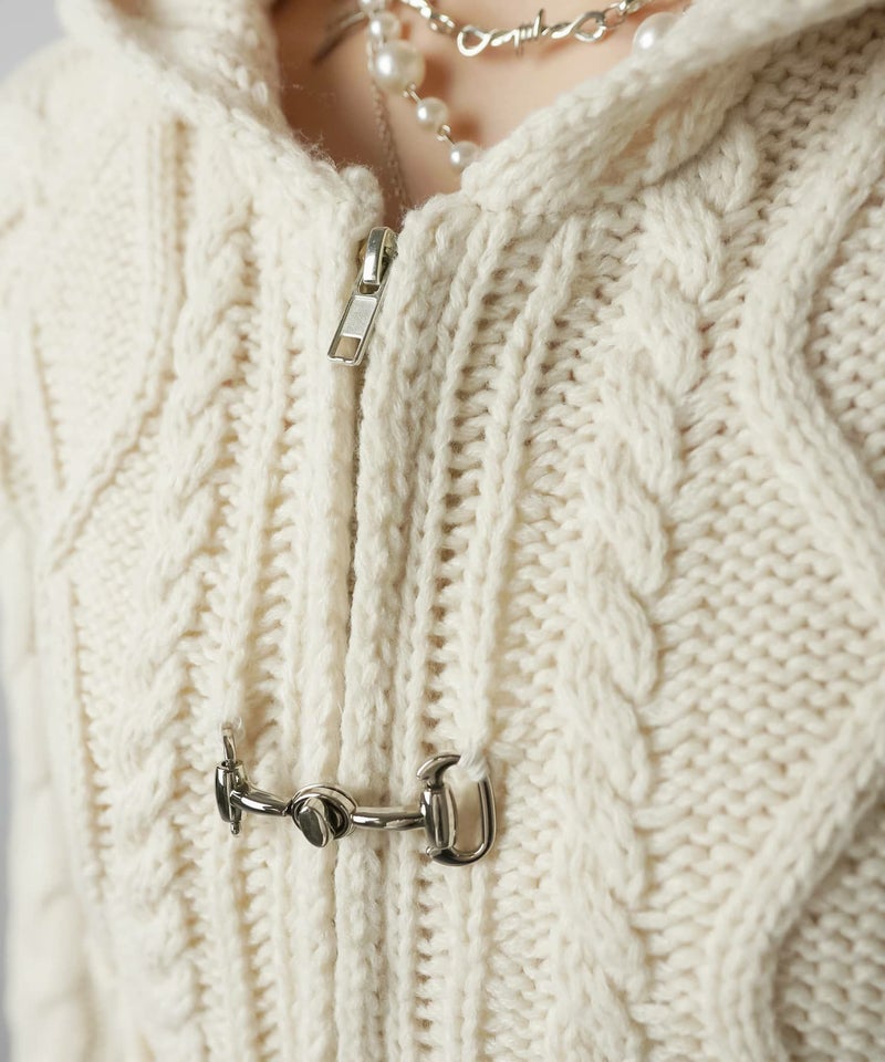 古着感のあるベルトボタンデザインがポイントの、フード付きWジップニットカーディガン。
