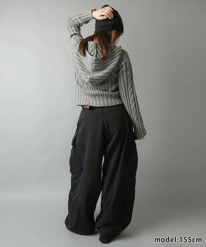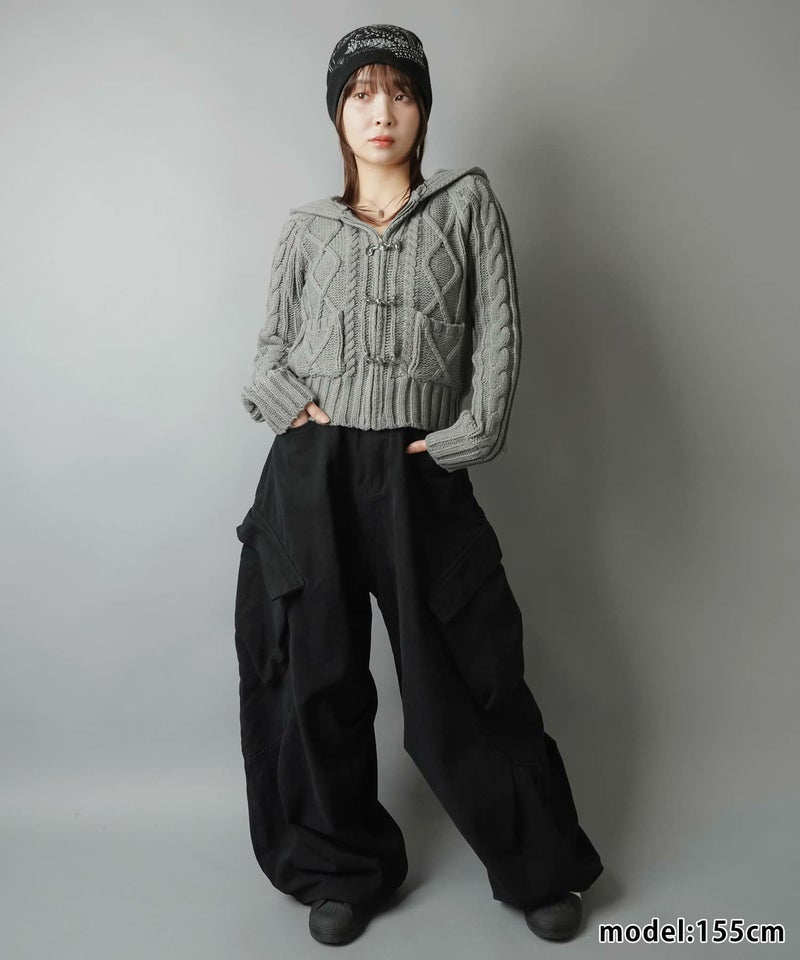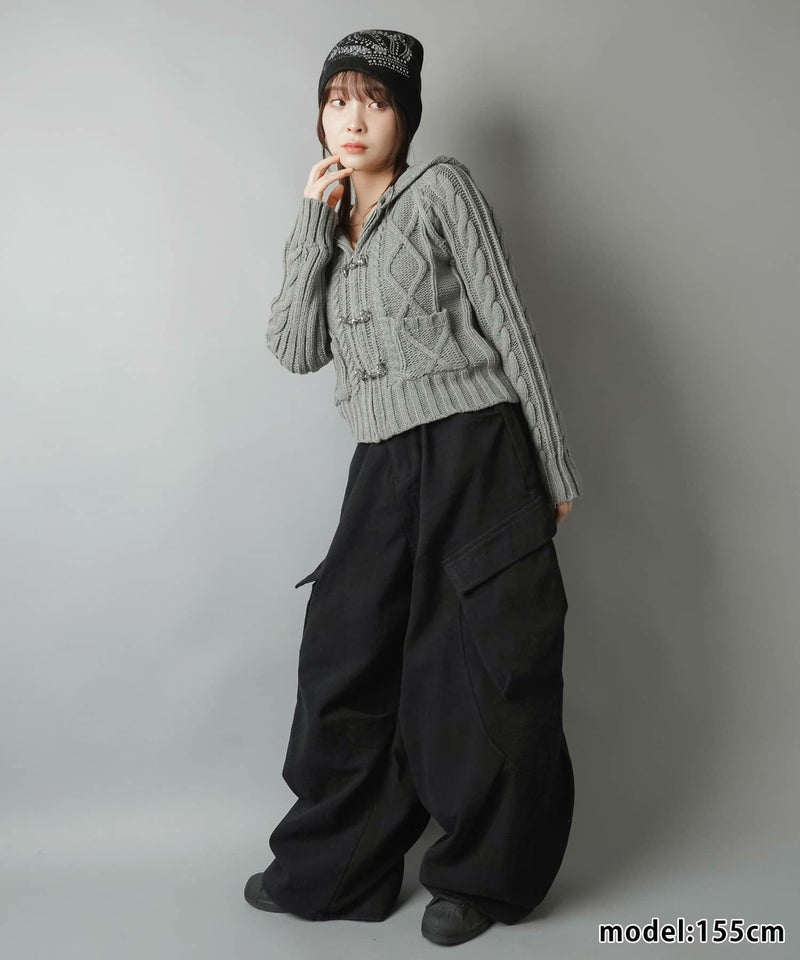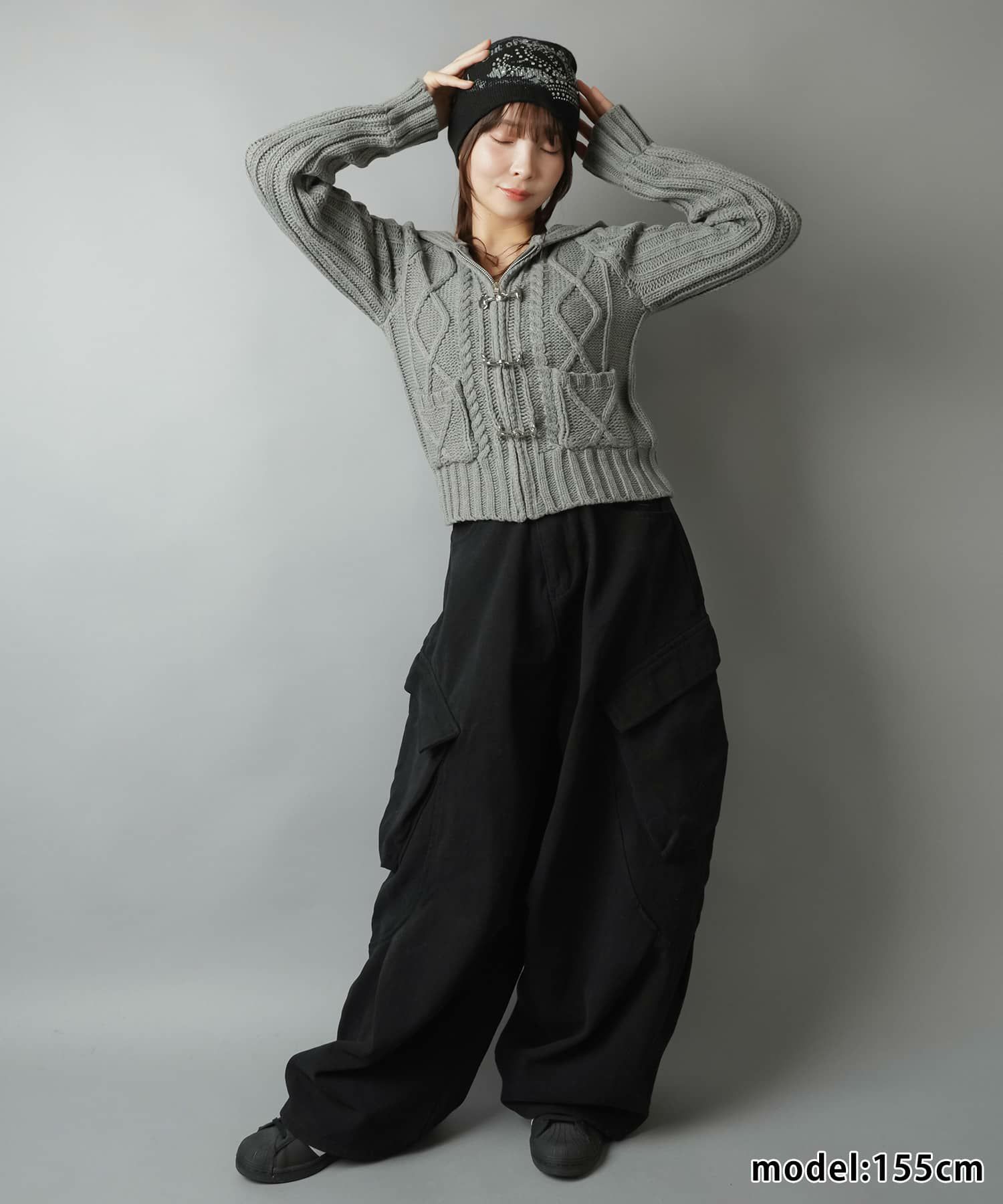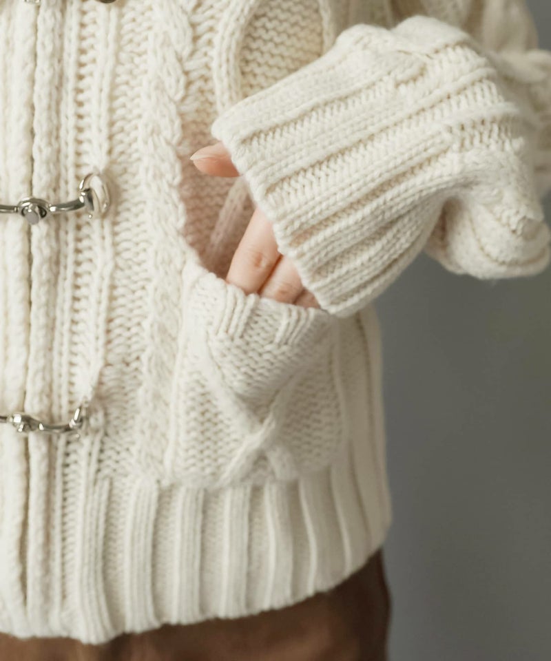 古着感のあるベルトボタンデザインがポイントの、フード付きWジップニットカーディガン。