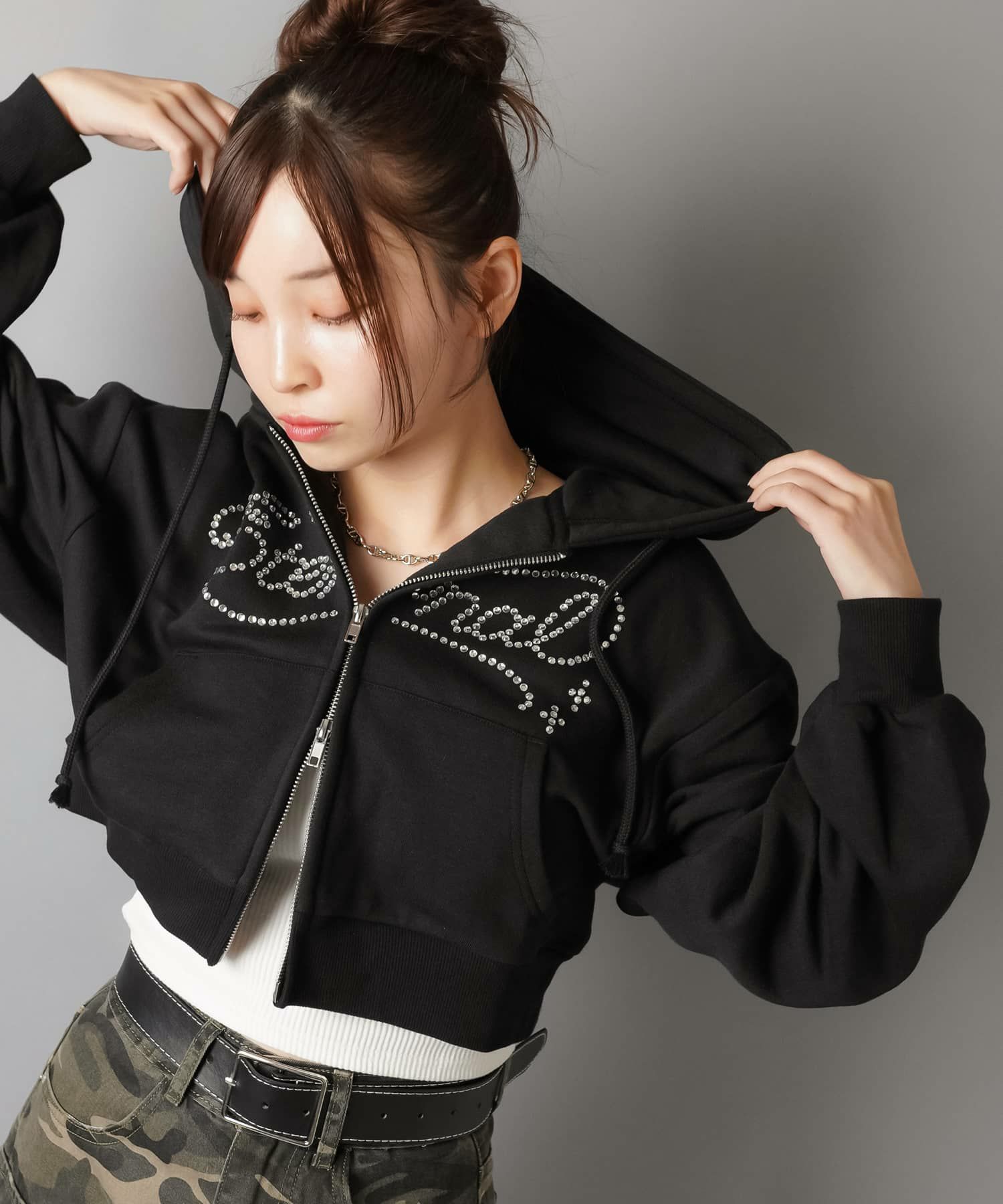 【キラキラのラインストーンロゴが可愛いWジップショートパーカー】