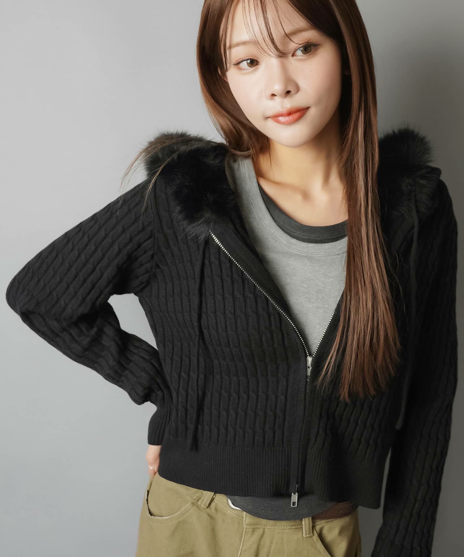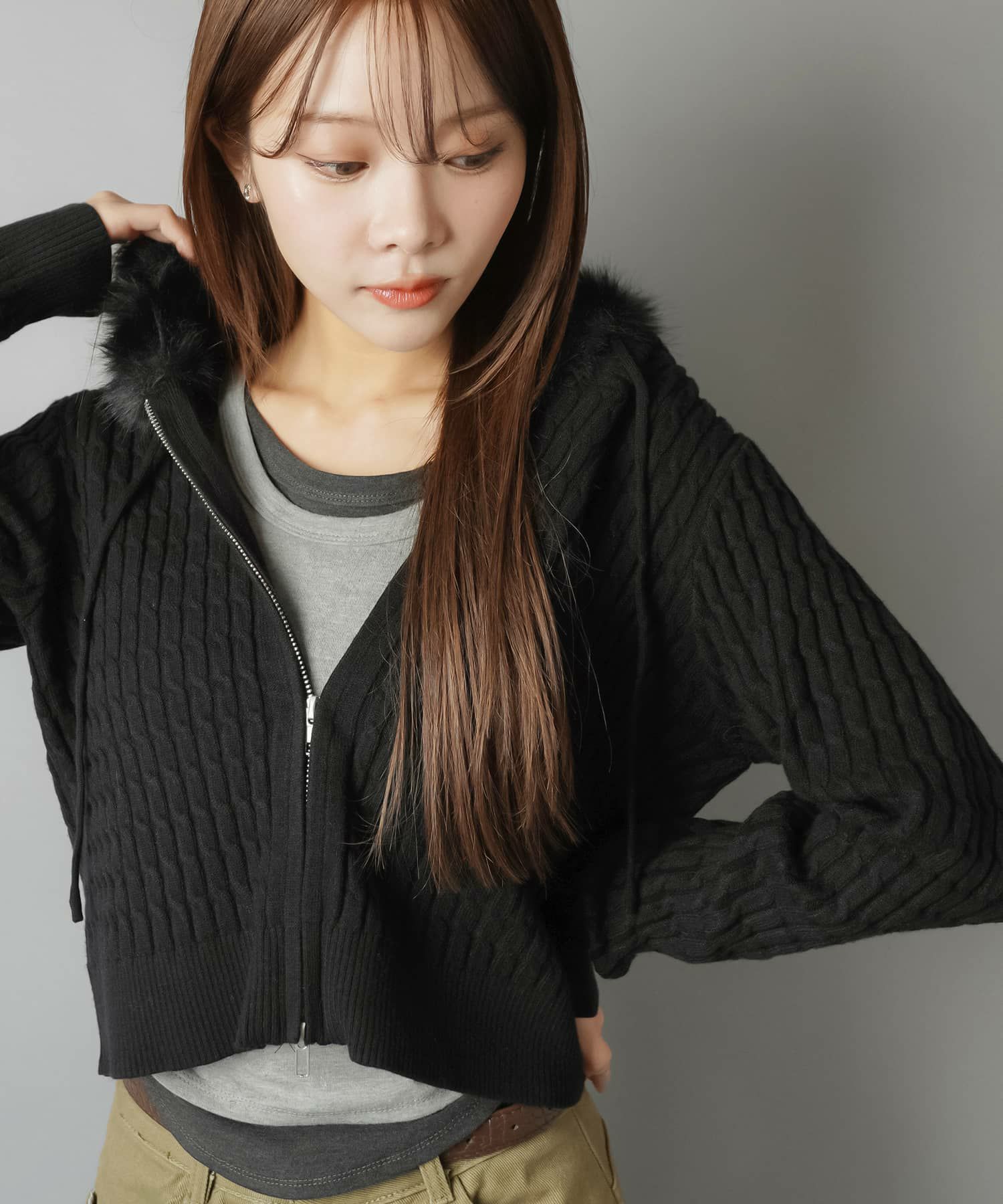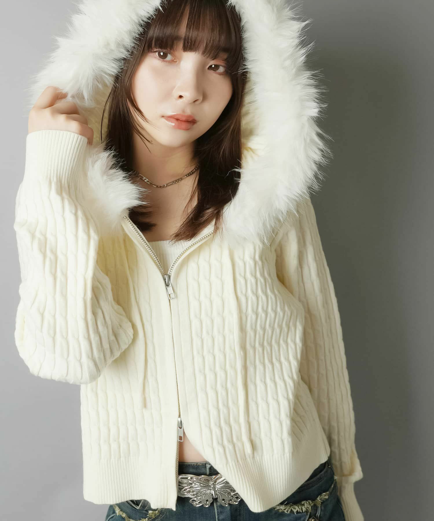 ケーブル編みの立体感と、存在感たっぷりのファーフードがポイントのジップニット。