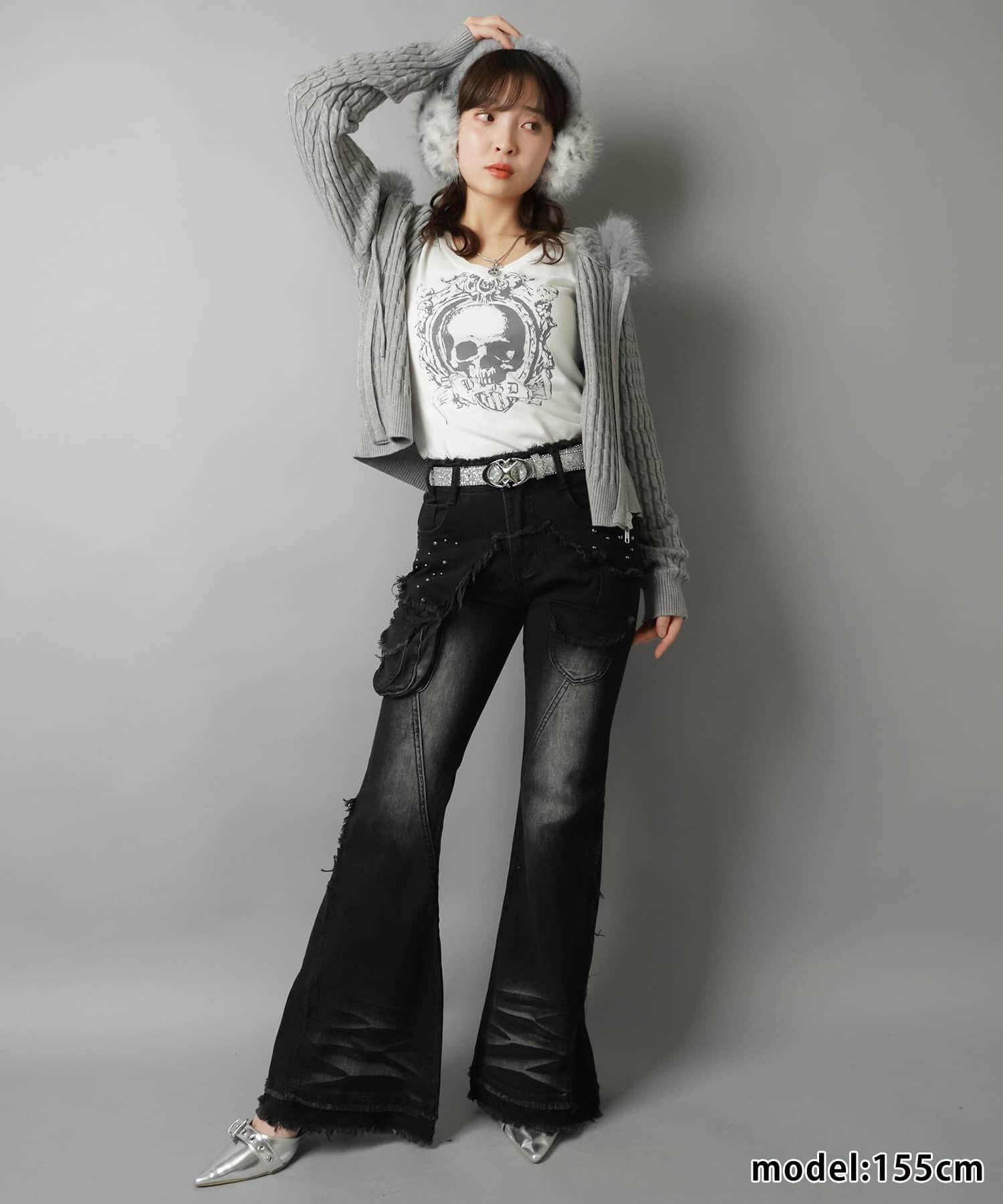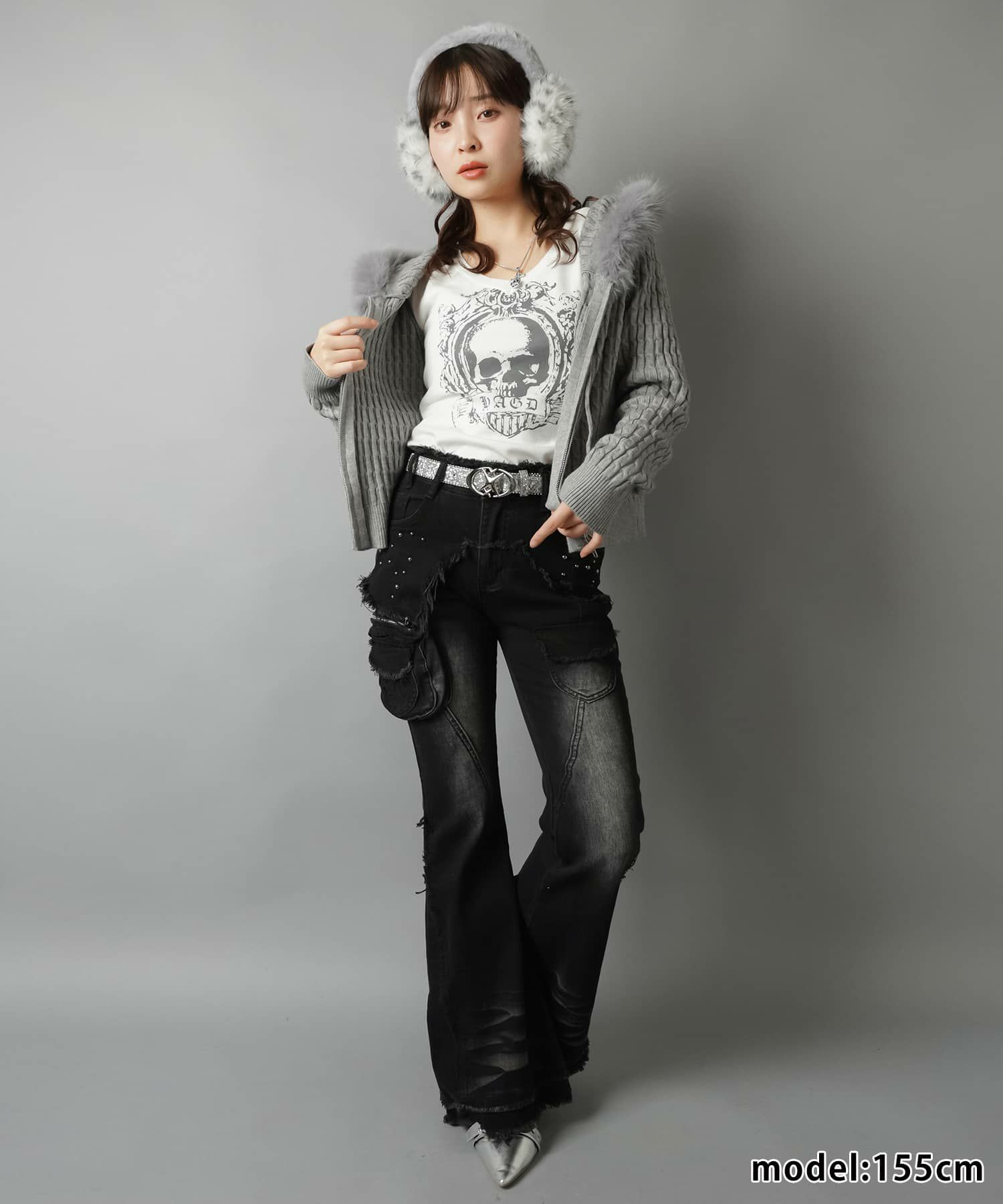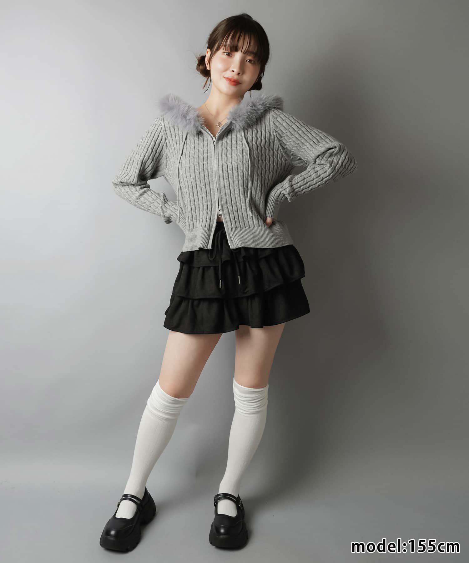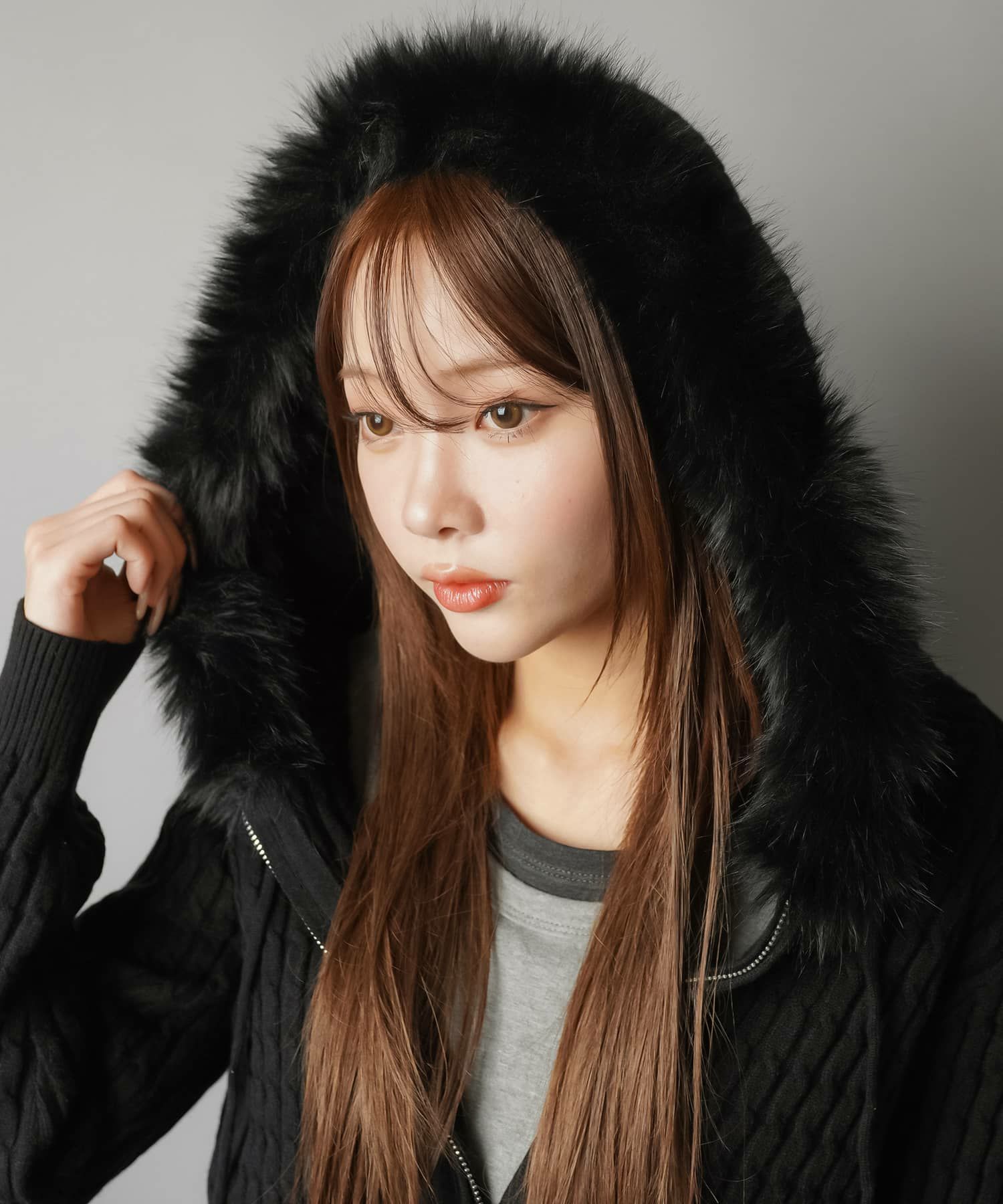 ケーブル編みの立体感と、存在感たっぷりのファーフードがポイントのジップニット。