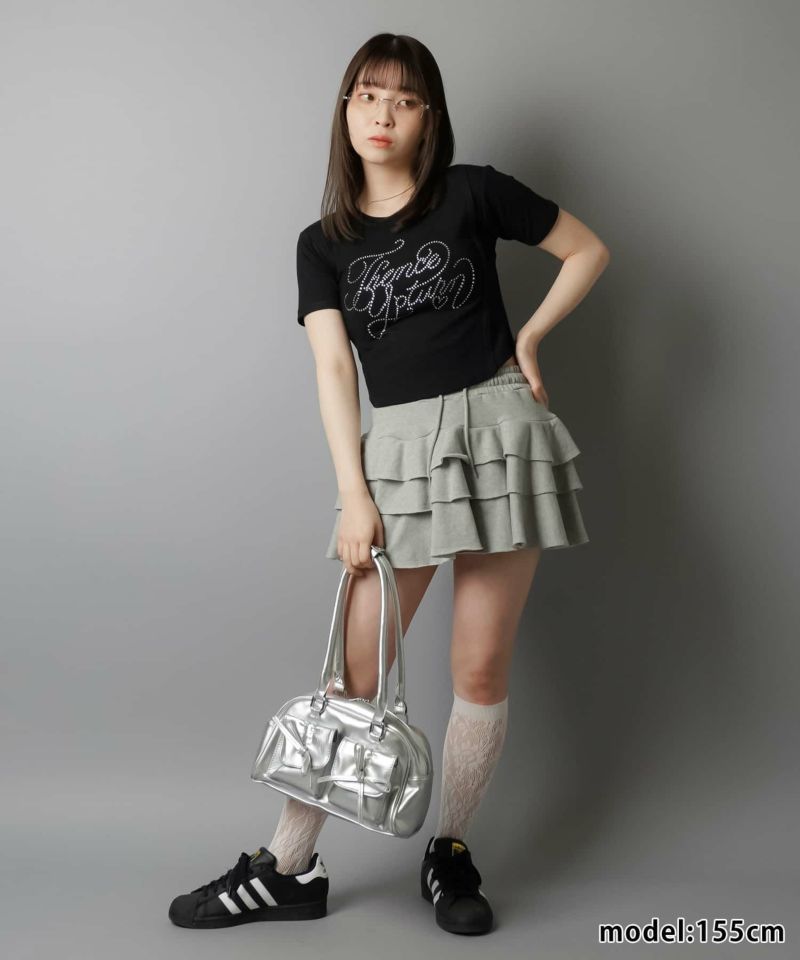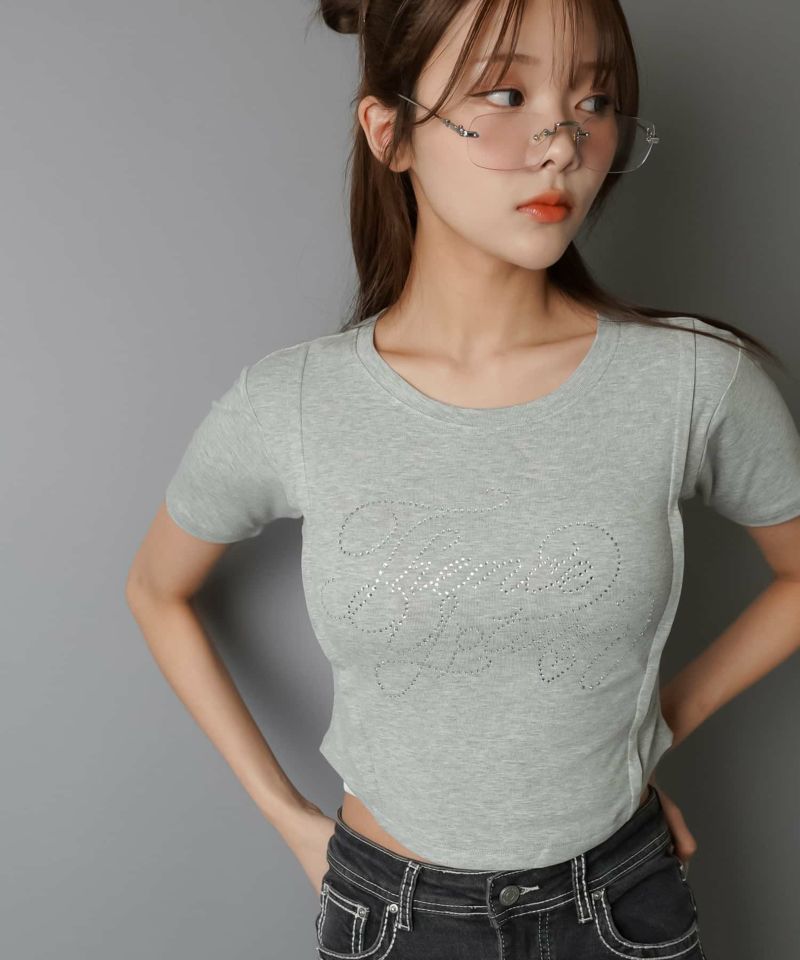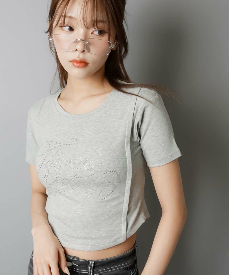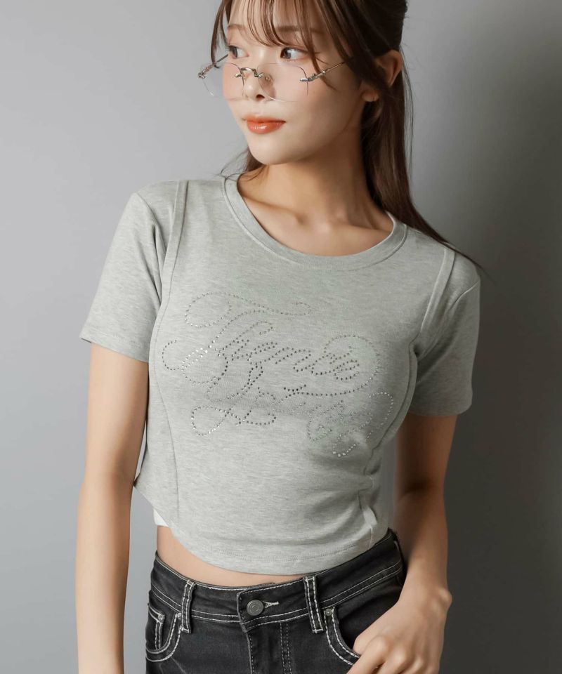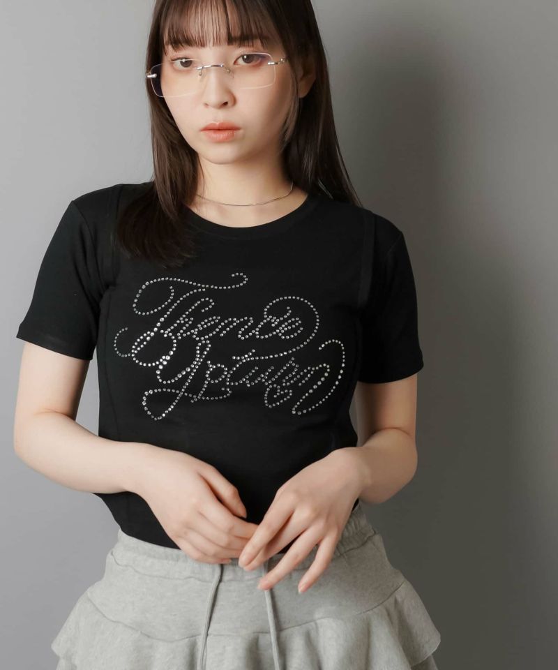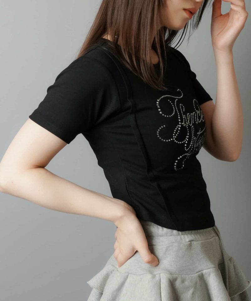 【ラインストーンロゴが目を惹くショート丈/クロップド丈ミニT】